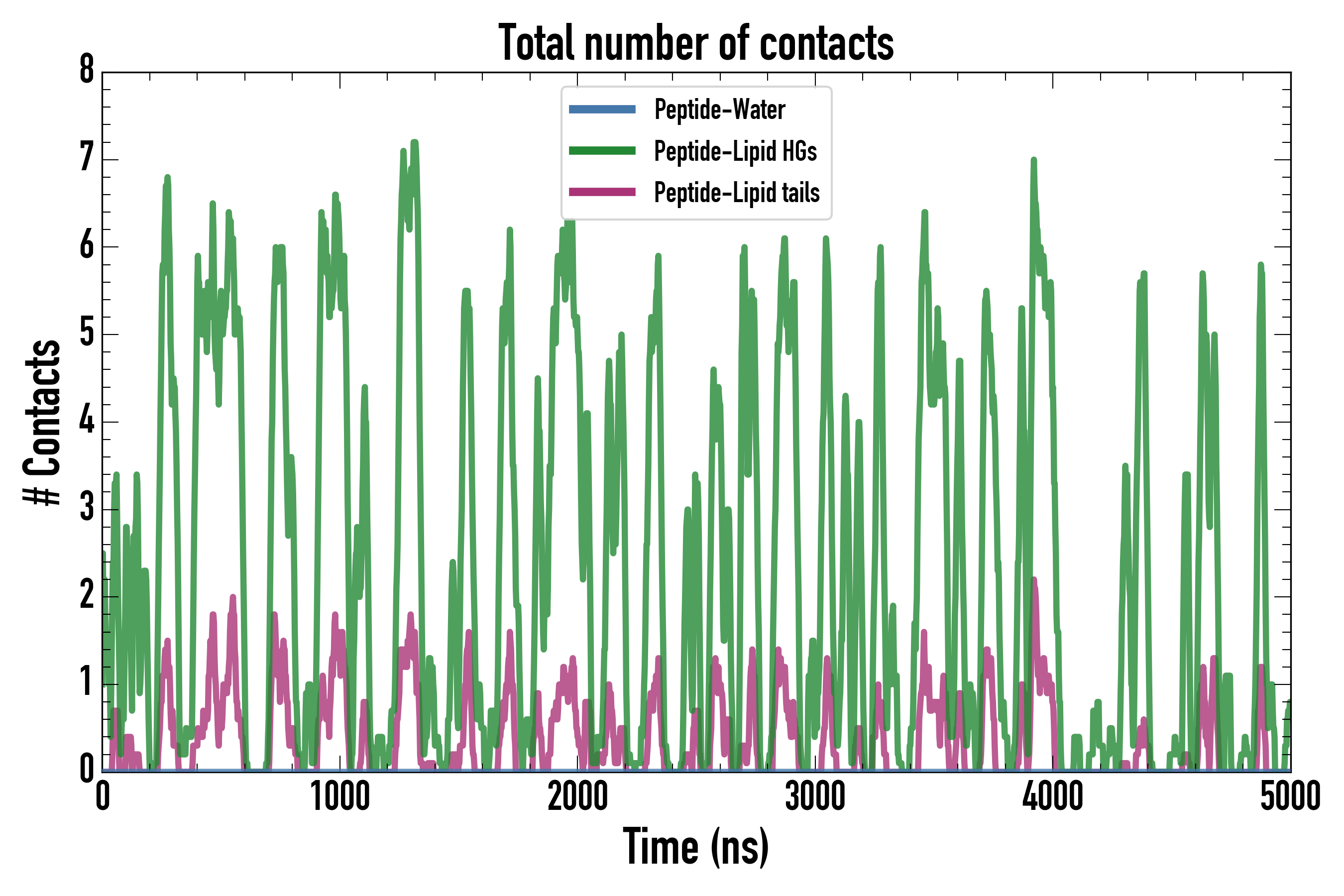 Number of contacts between each residue of the peptide backbone and the different lipid types, averaged over the last microsecond and using a cut-off of 0.6 nm.