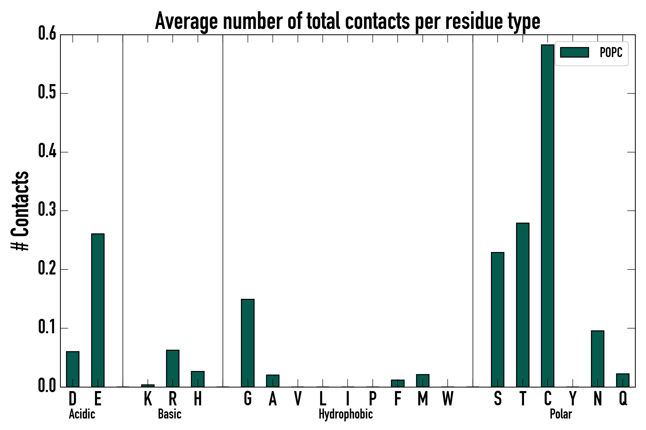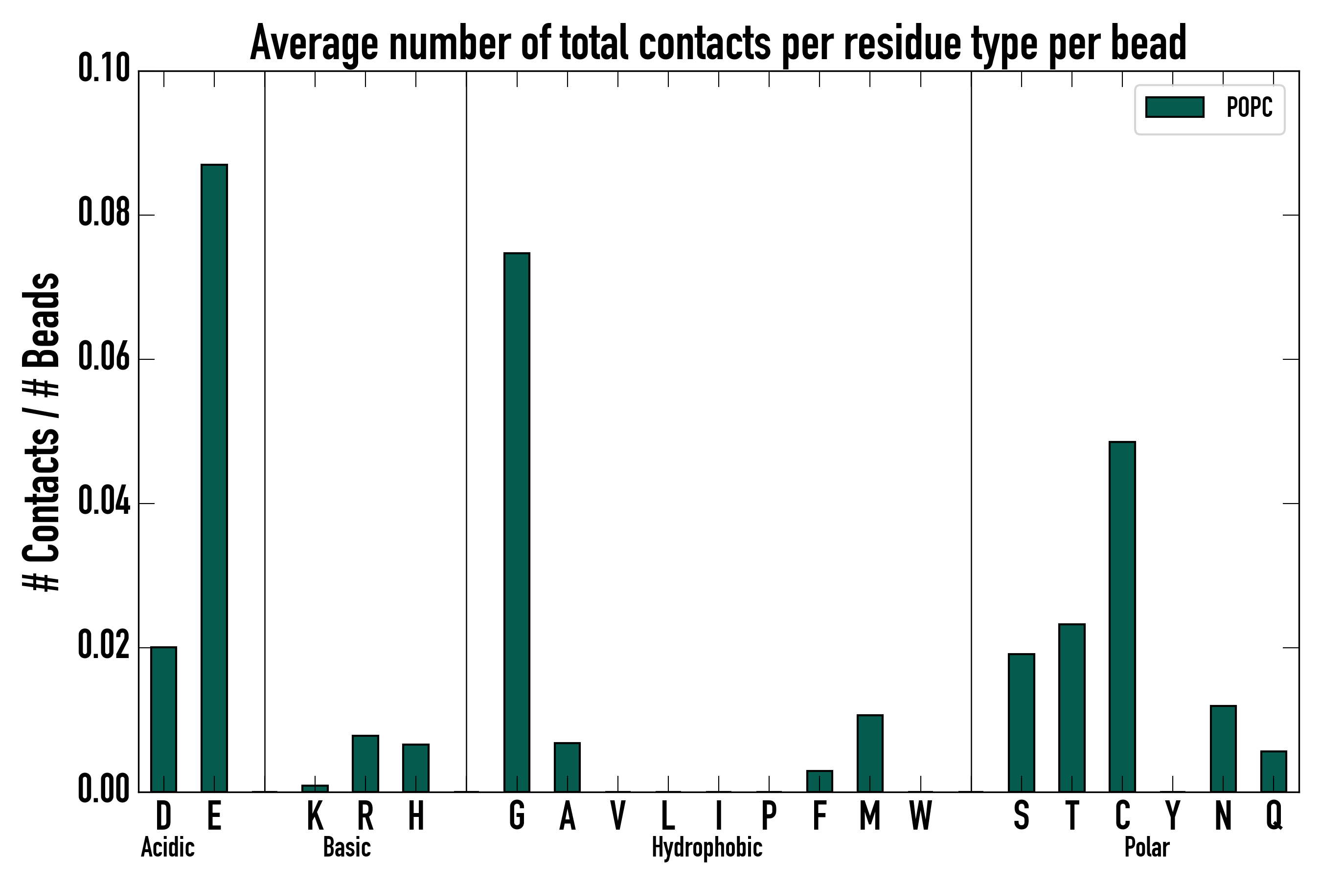 Number of contacts between each residue of the peptide backbone and the different lipid types, averaged over the last microsecond and using a cut-off of 0.6 nm.
