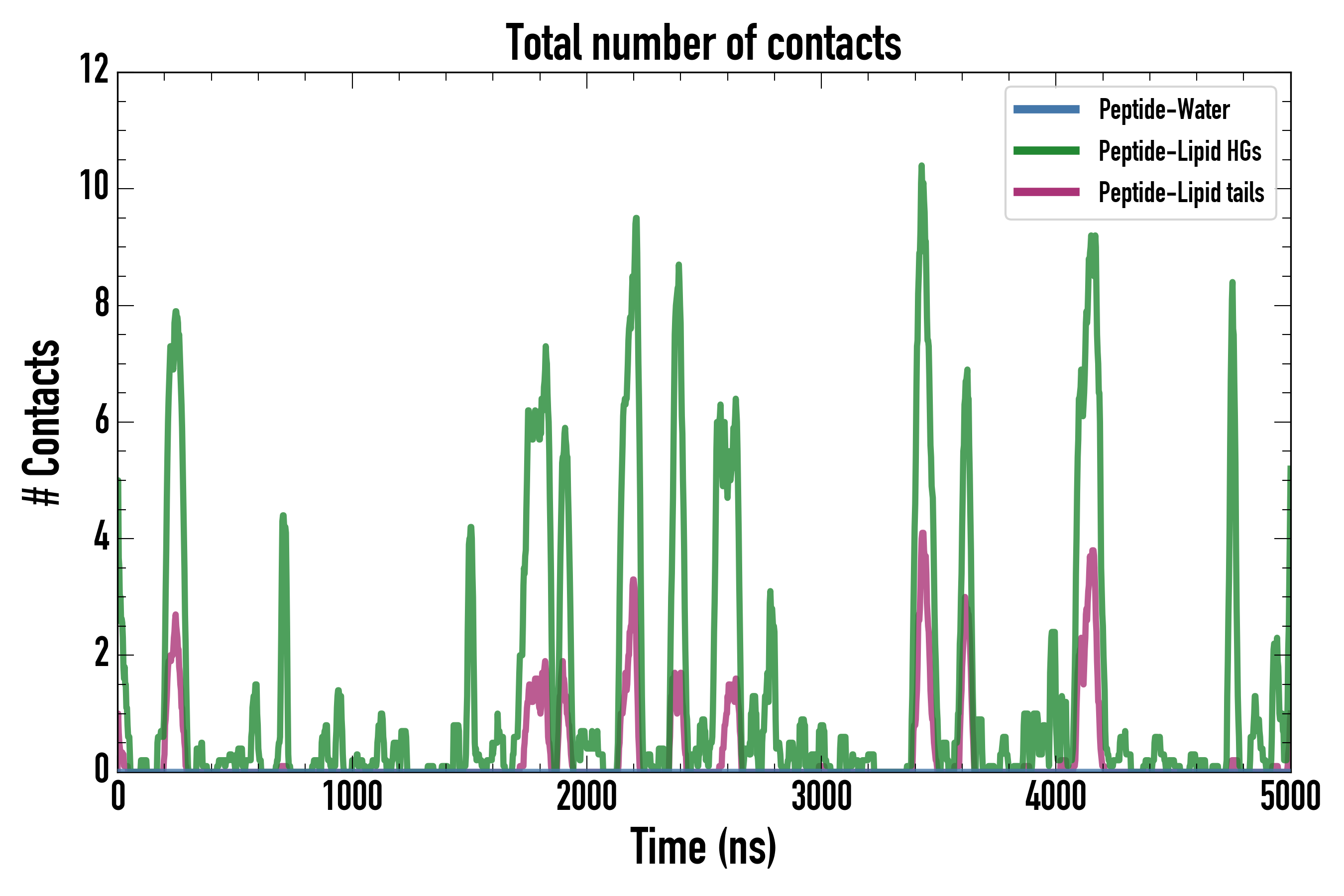 Number of contacts between each residue of the peptide backbone and the different lipid types, averaged over the last microsecond and using a cut-off of 0.6 nm.