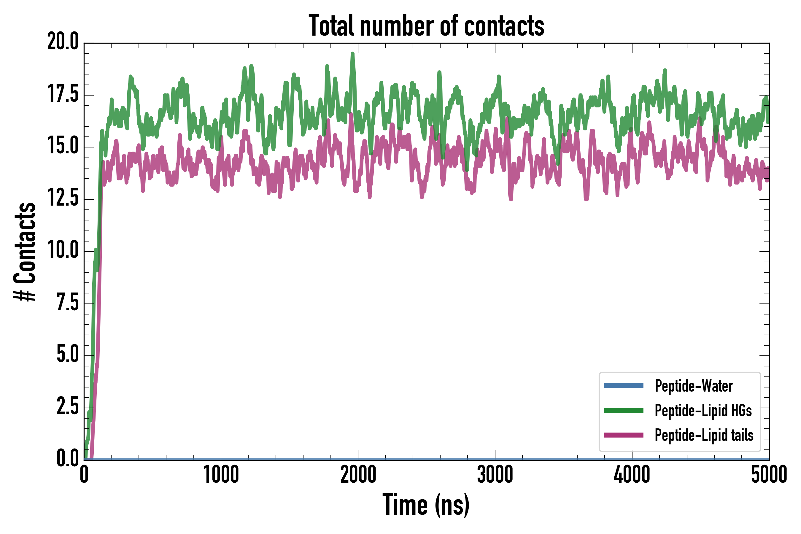 Number of contacts between each residue of the peptide backbone and the different lipid types, averaged over the last microsecond and using a cut-off of 0.6 nm.