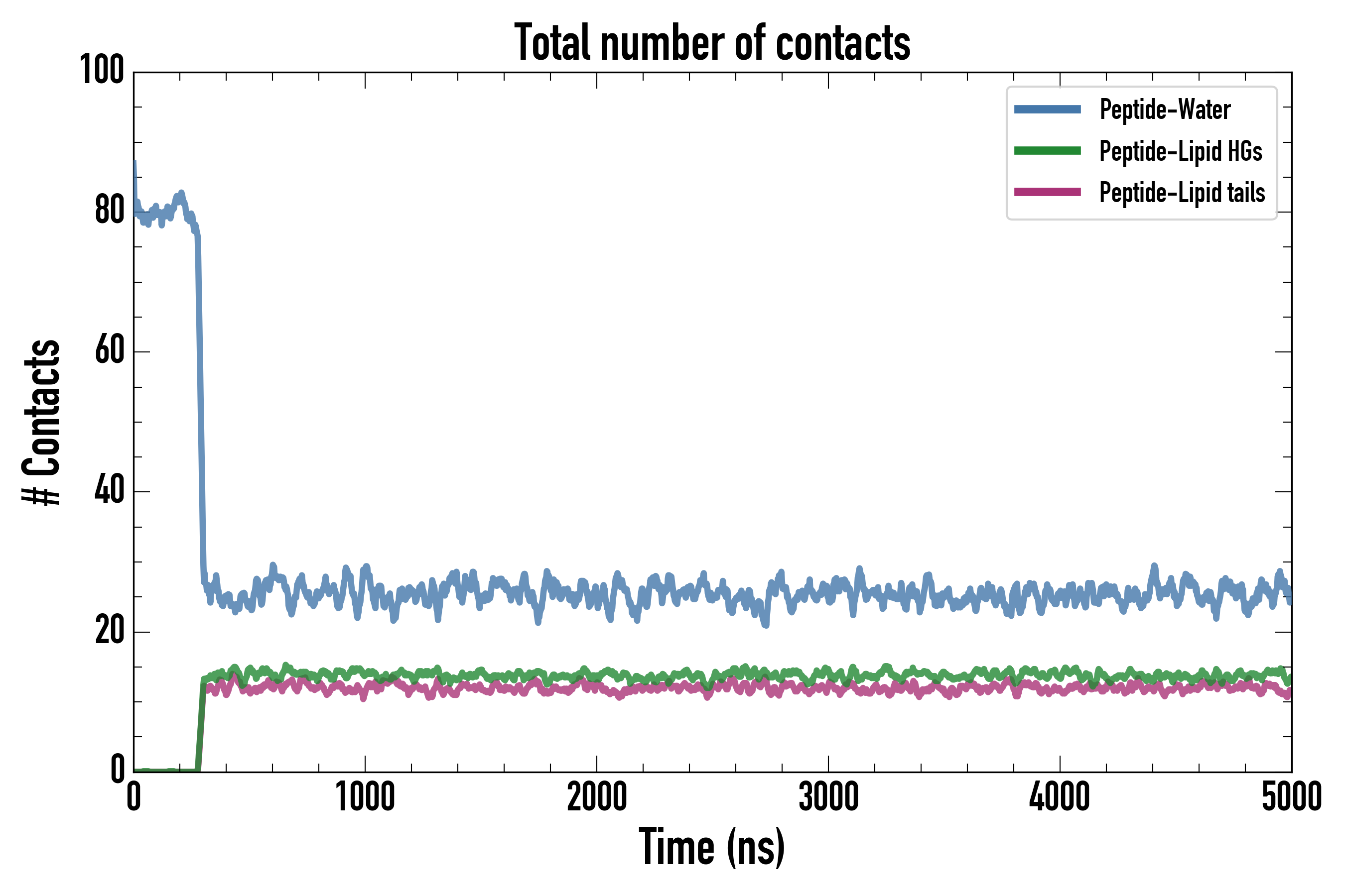 Number of contacts between each residue of the peptide backbone and the different lipid types, averaged over the last microsecond and using a cut-off of 0.6 nm.