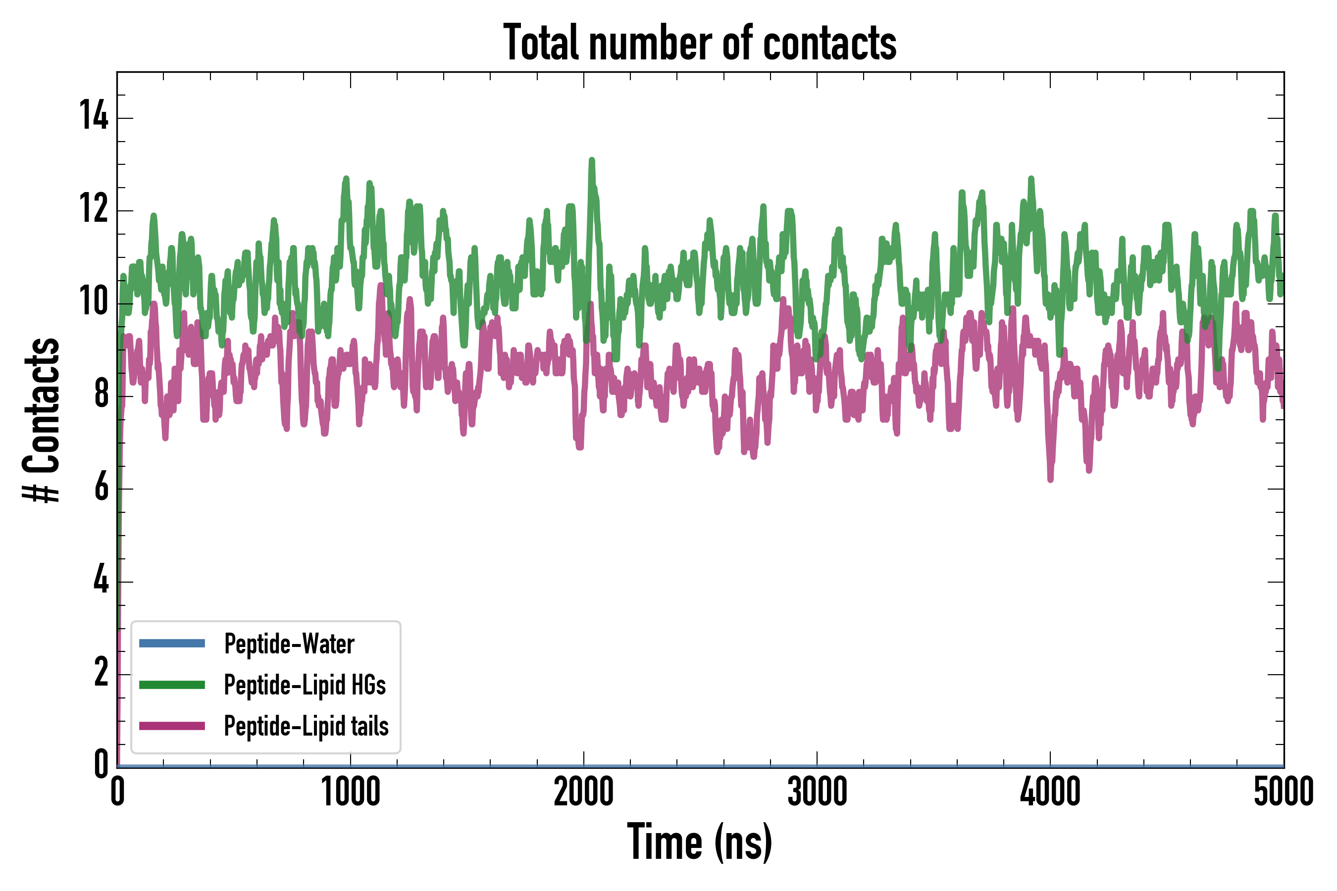 Number of contacts between each residue of the peptide backbone and the different lipid types, averaged over the last microsecond and using a cut-off of 0.6 nm.