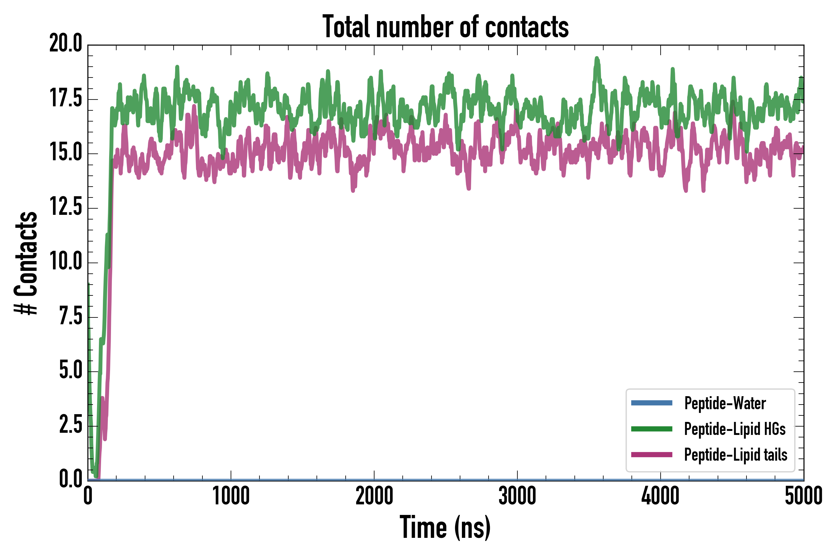 Number of contacts between each residue of the peptide backbone and the different lipid types, averaged over the last microsecond and using a cut-off of 0.6 nm.