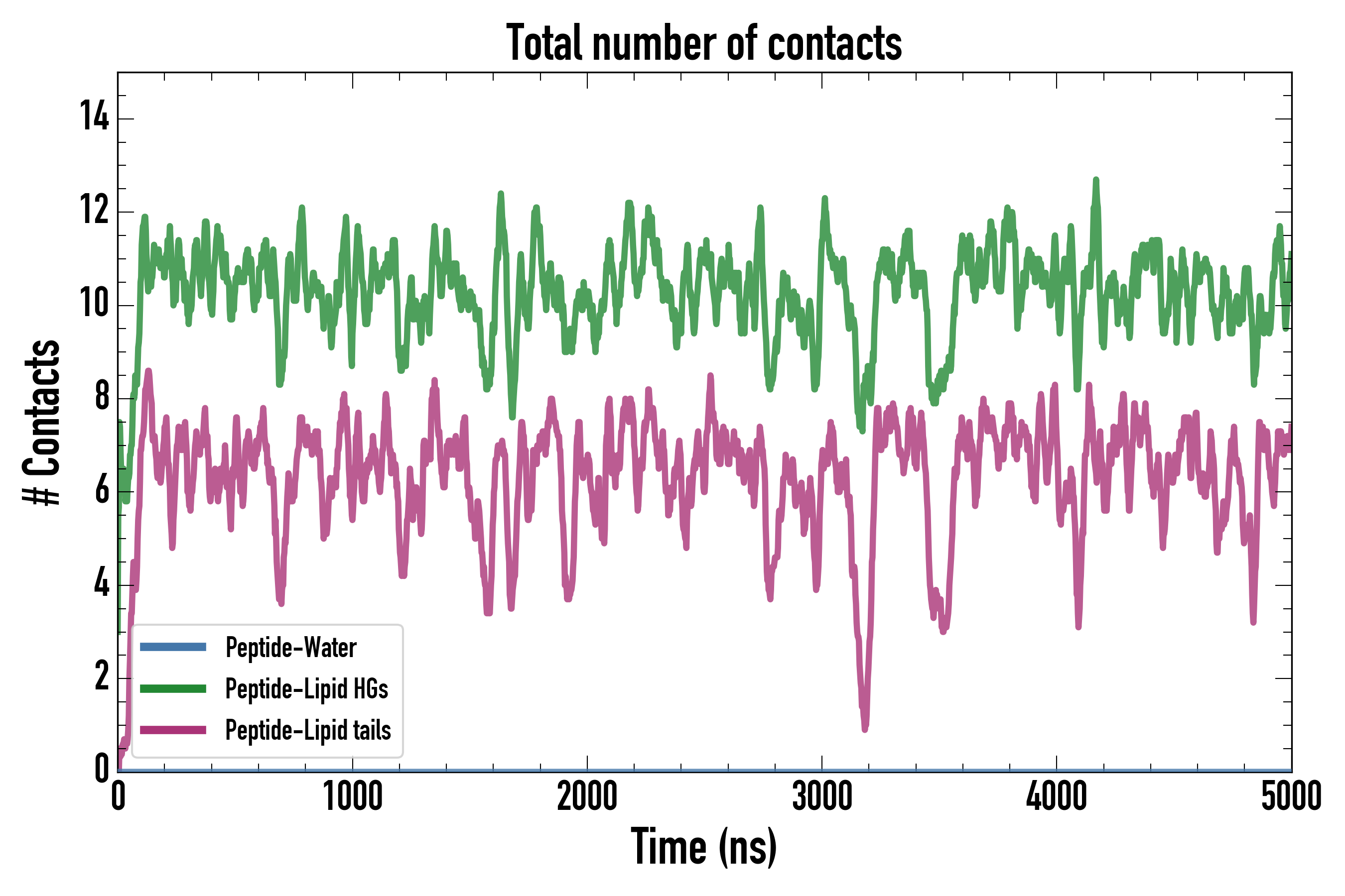 Number of contacts between each residue of the peptide backbone and the different lipid types, averaged over the last microsecond and using a cut-off of 0.6 nm.