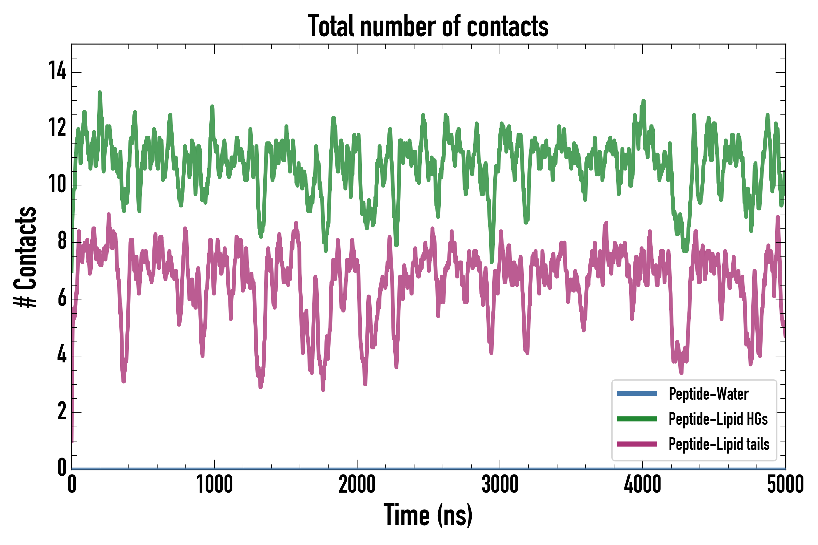 Number of contacts between each residue of the peptide backbone and the different lipid types, averaged over the last microsecond and using a cut-off of 0.6 nm.
