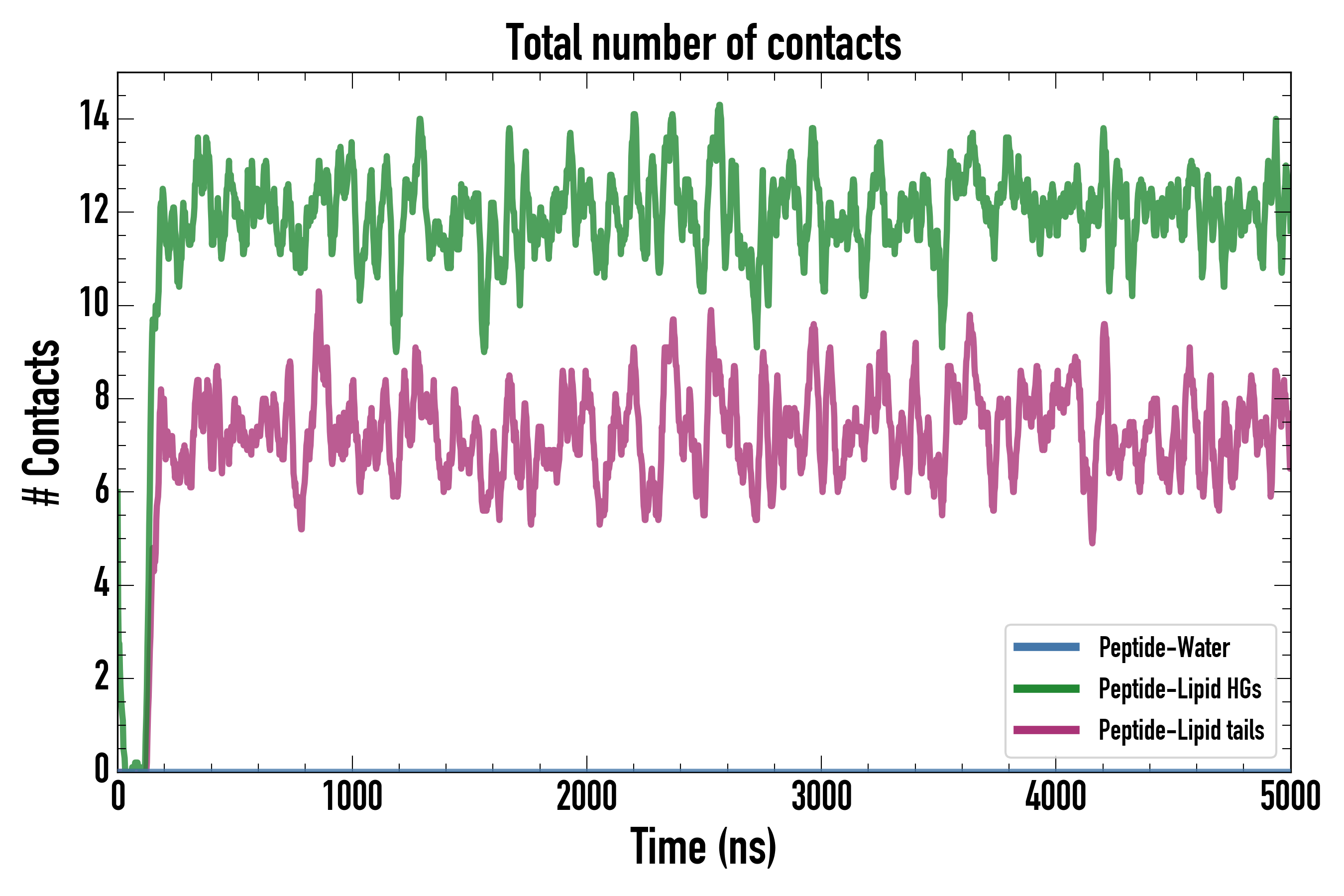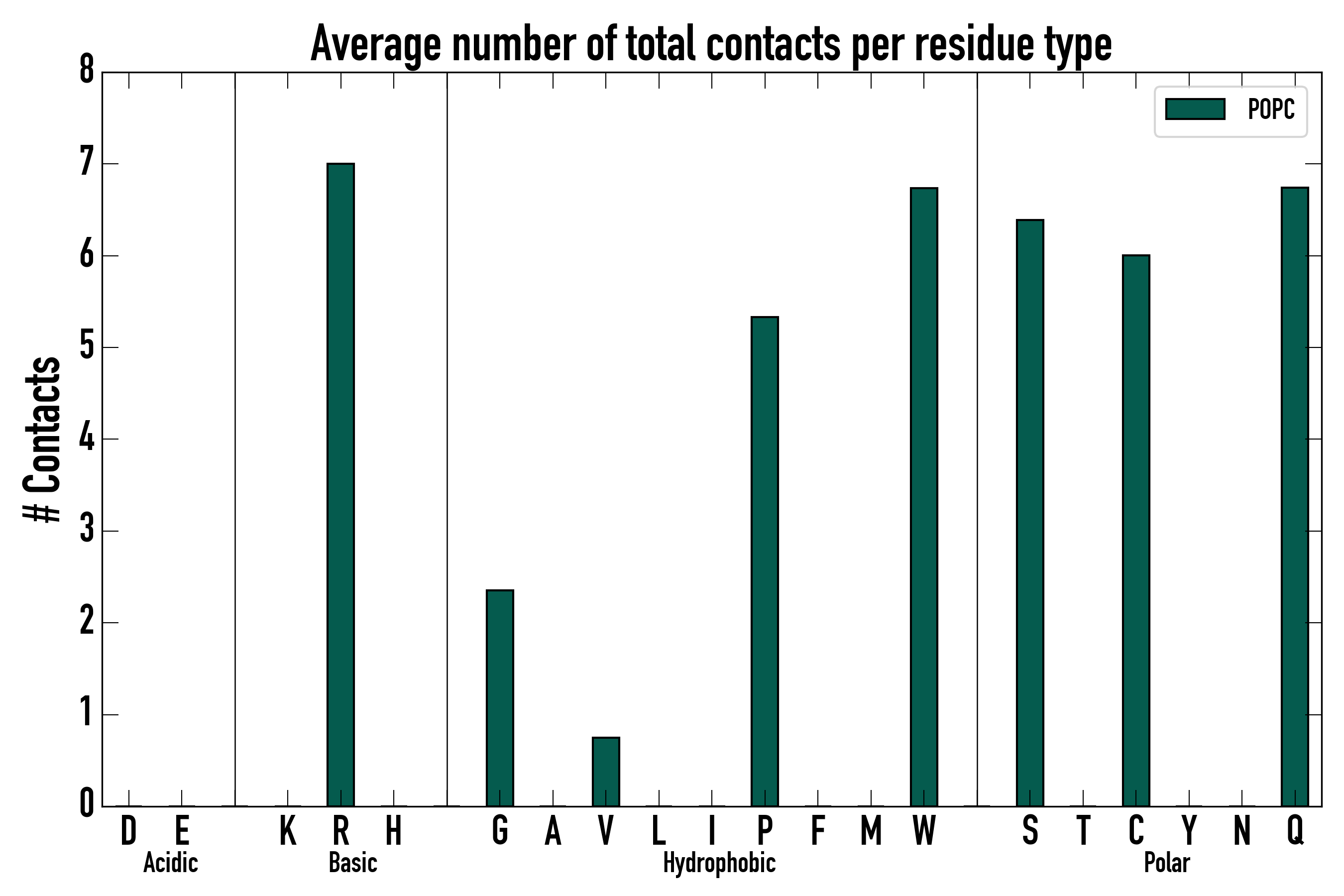Number of contacts between each residue of the peptide backbone and the different lipid types, averaged over the last microsecond and using a cut-off of 0.6 nm.