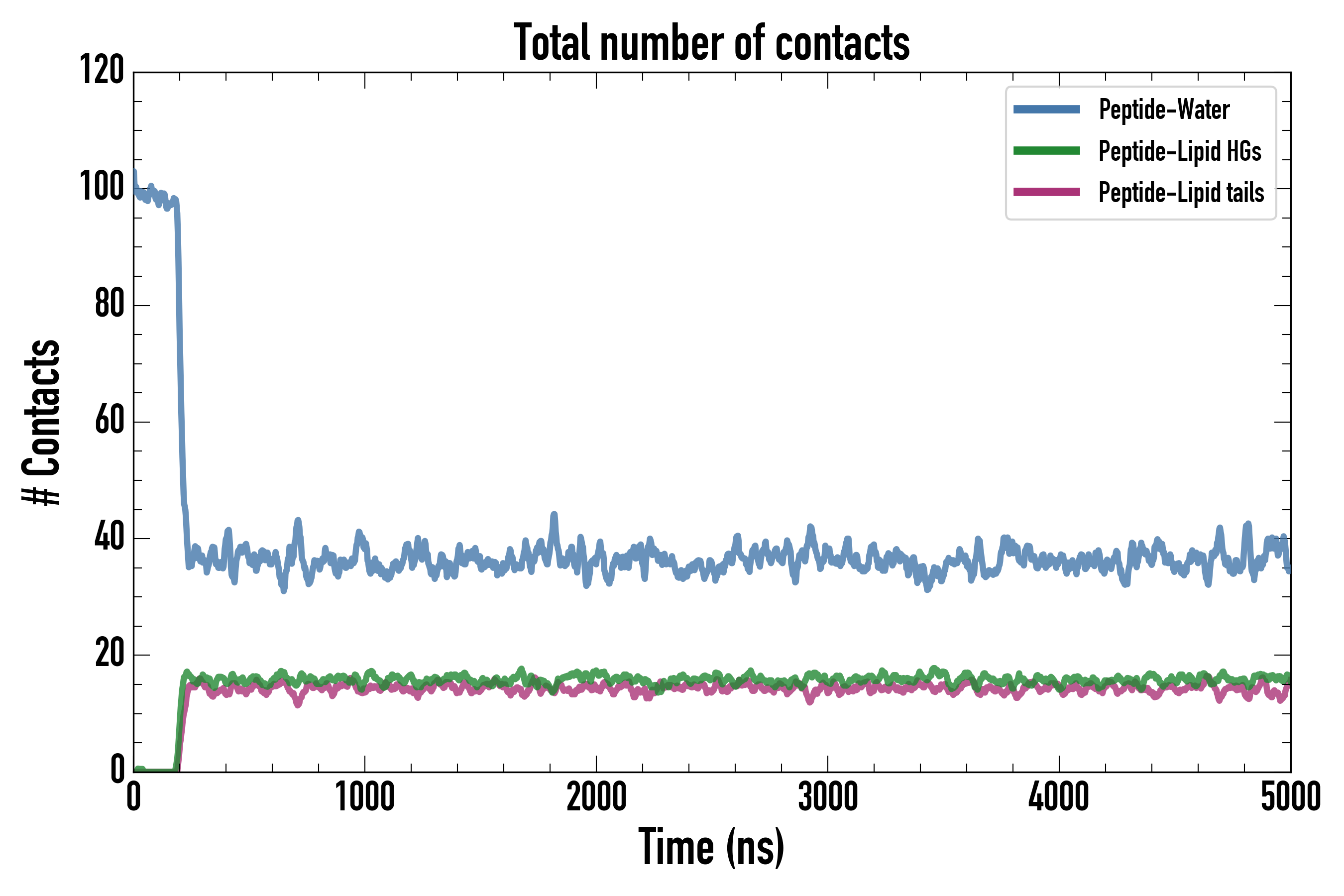 Number of contacts between each residue of the peptide backbone and the different lipid types, averaged over the last microsecond and using a cut-off of 0.6 nm.