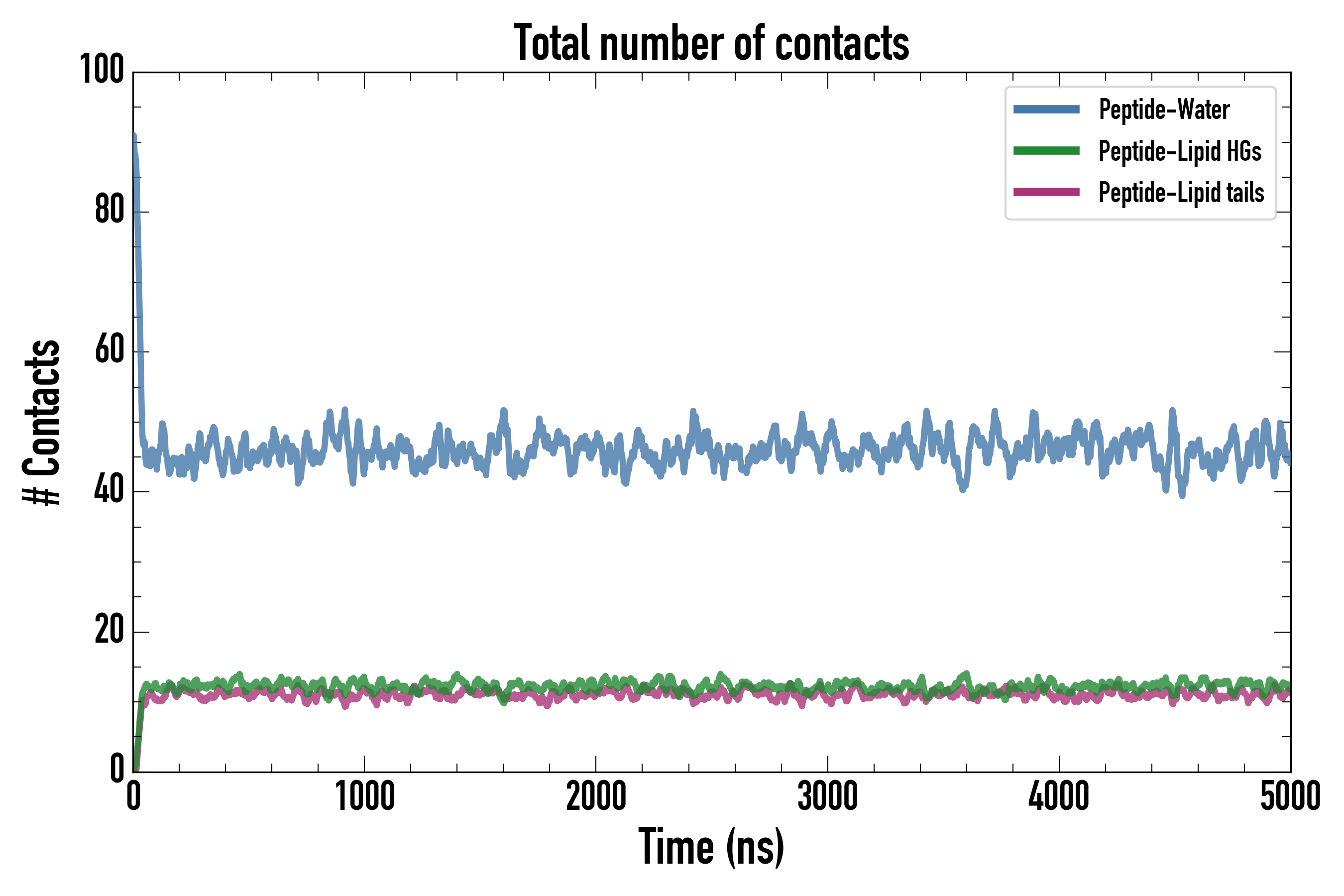 Number of contacts between each residue of the peptide backbone and the different lipid types, averaged over the last microsecond and using a cut-off of 0.6 nm.