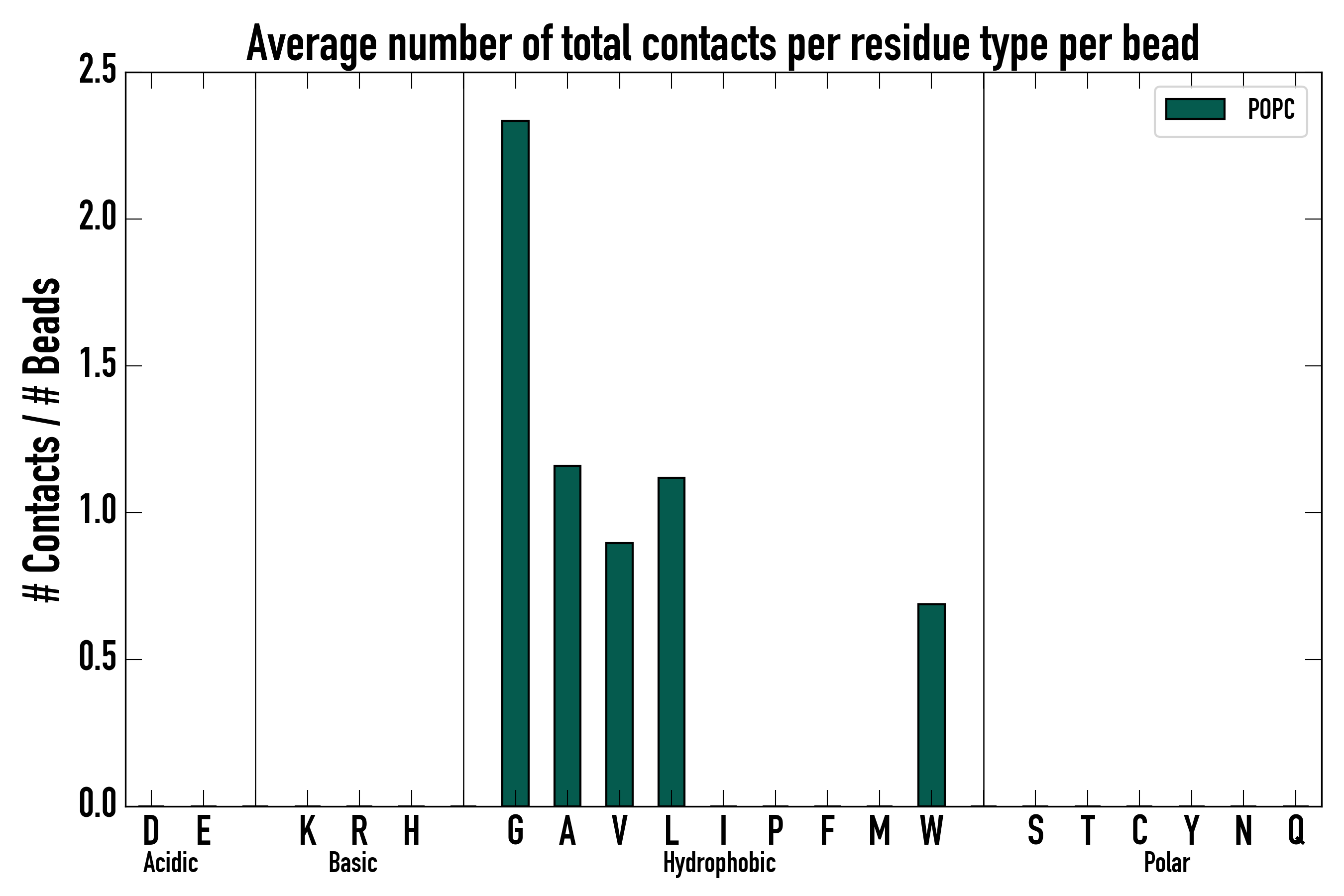 Number of contacts between each residue of the peptide backbone and the different lipid types, averaged over the last microsecond and using a cut-off of 0.6 nm.