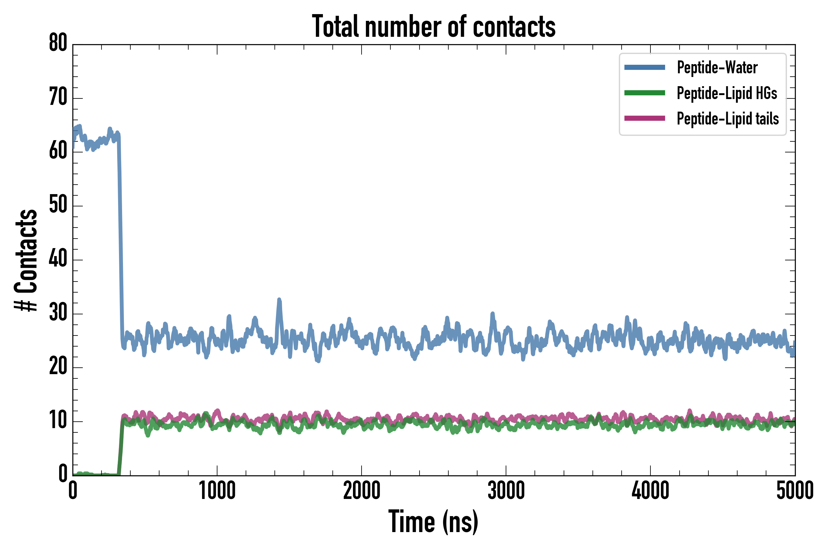 Number of contacts between each residue of the peptide backbone and the different lipid types, averaged over the last microsecond and using a cut-off of 0.6 nm.