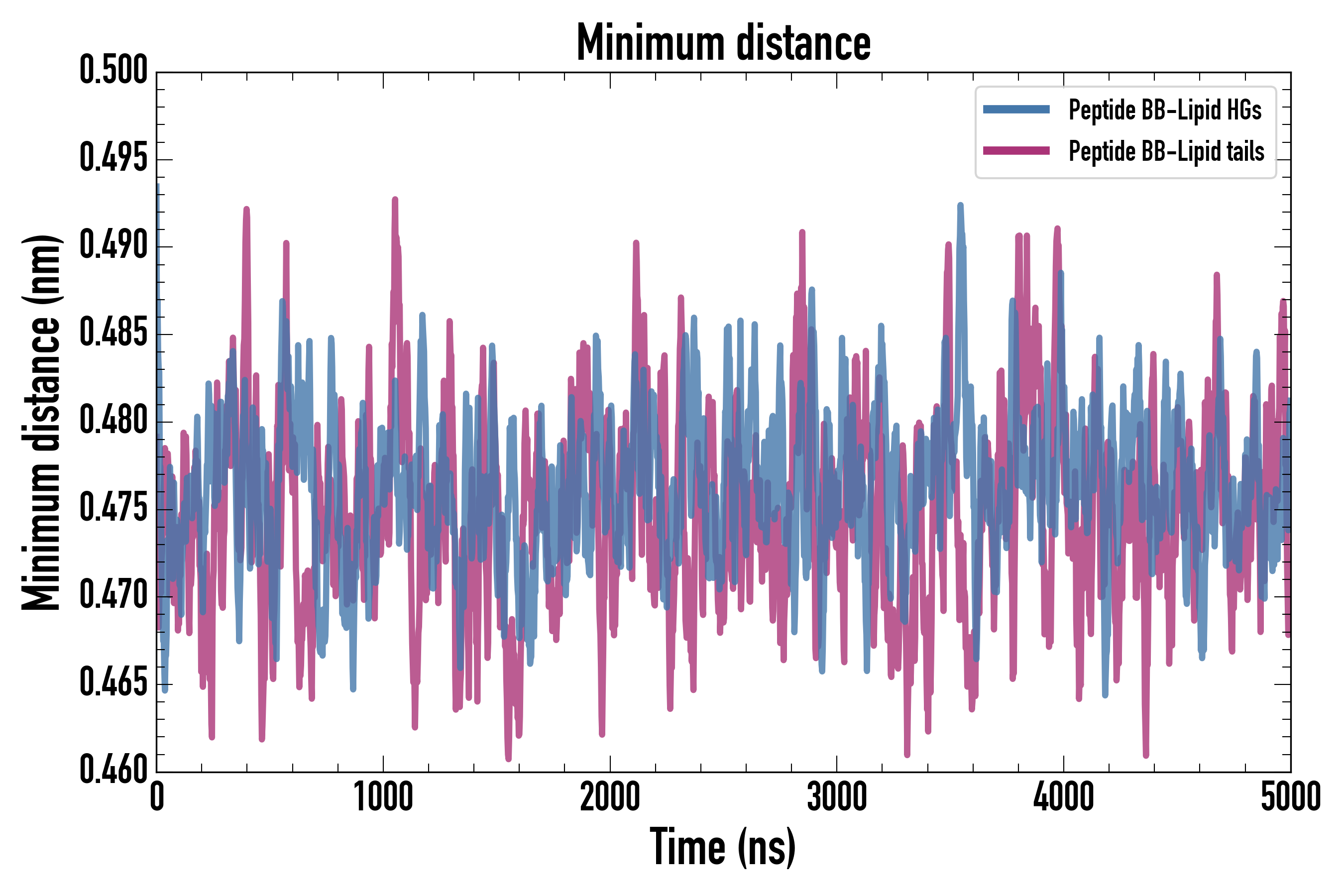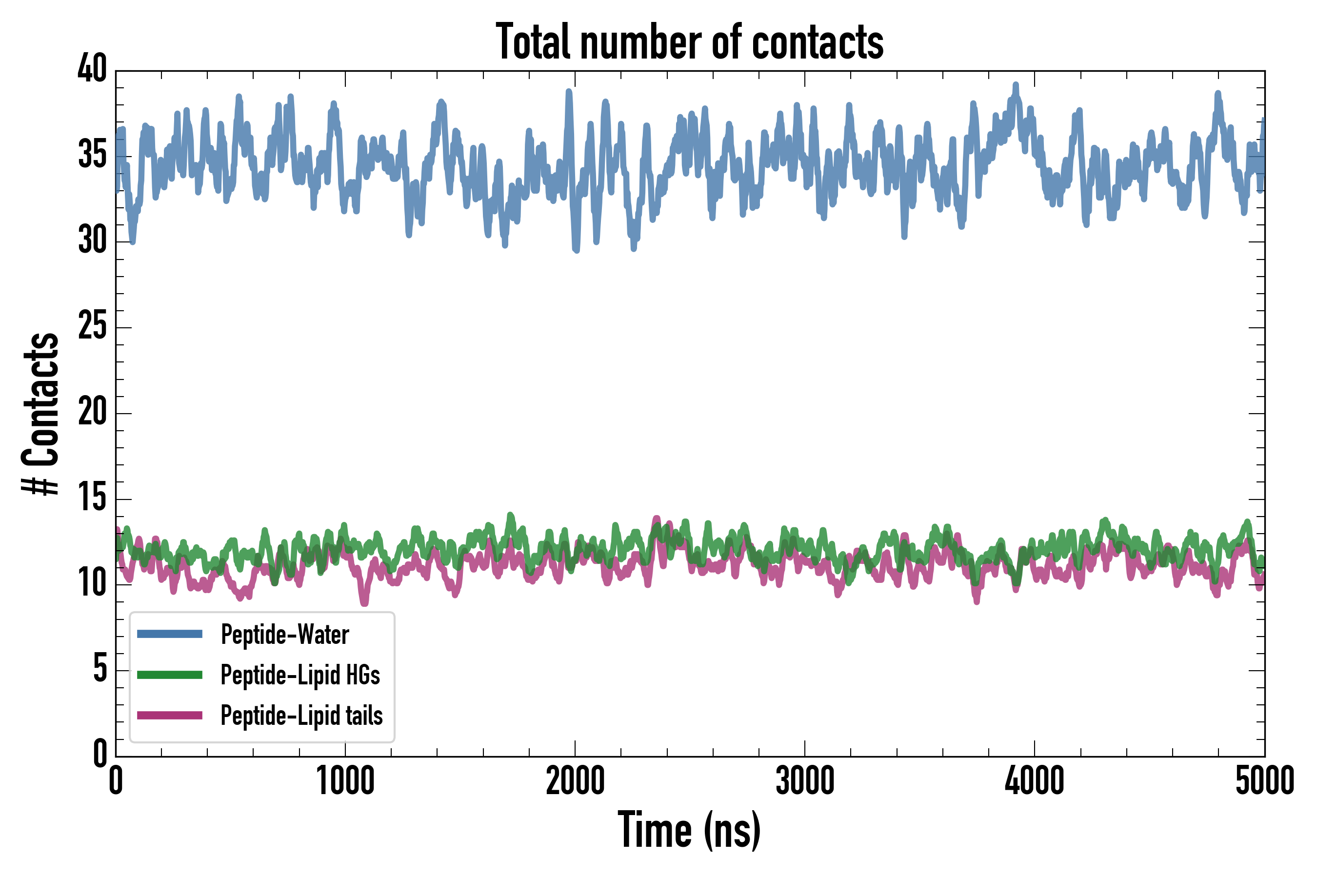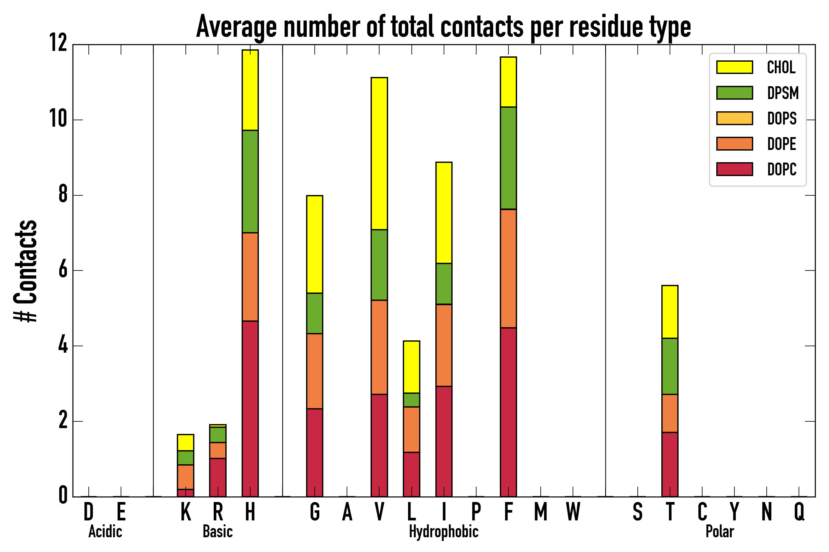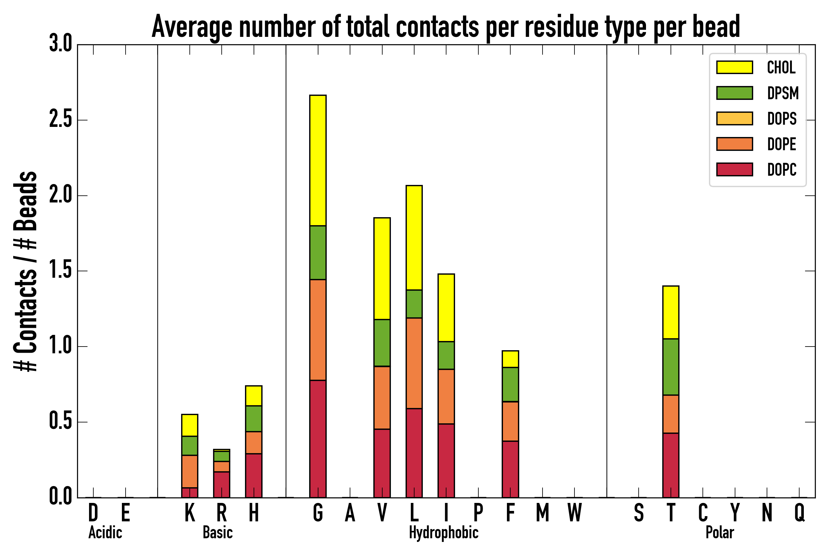 Number of contacts between each residue of the peptide backbone and the different lipid types, averaged over the last microsecond and using a cut-off of 0.6 nm.