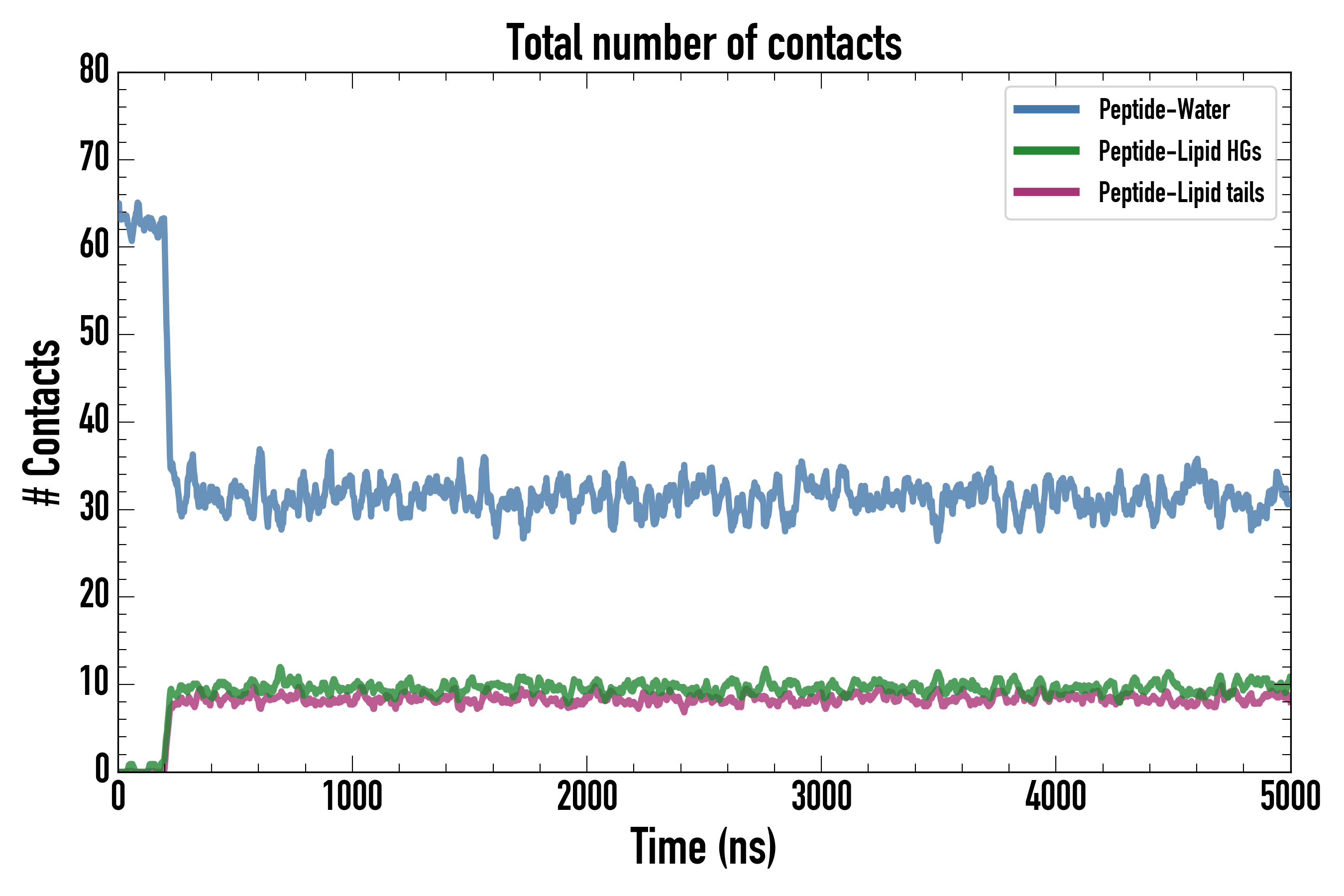 Number of contacts between each residue of the peptide backbone and the different lipid types, averaged over the last microsecond and using a cut-off of 0.6 nm.