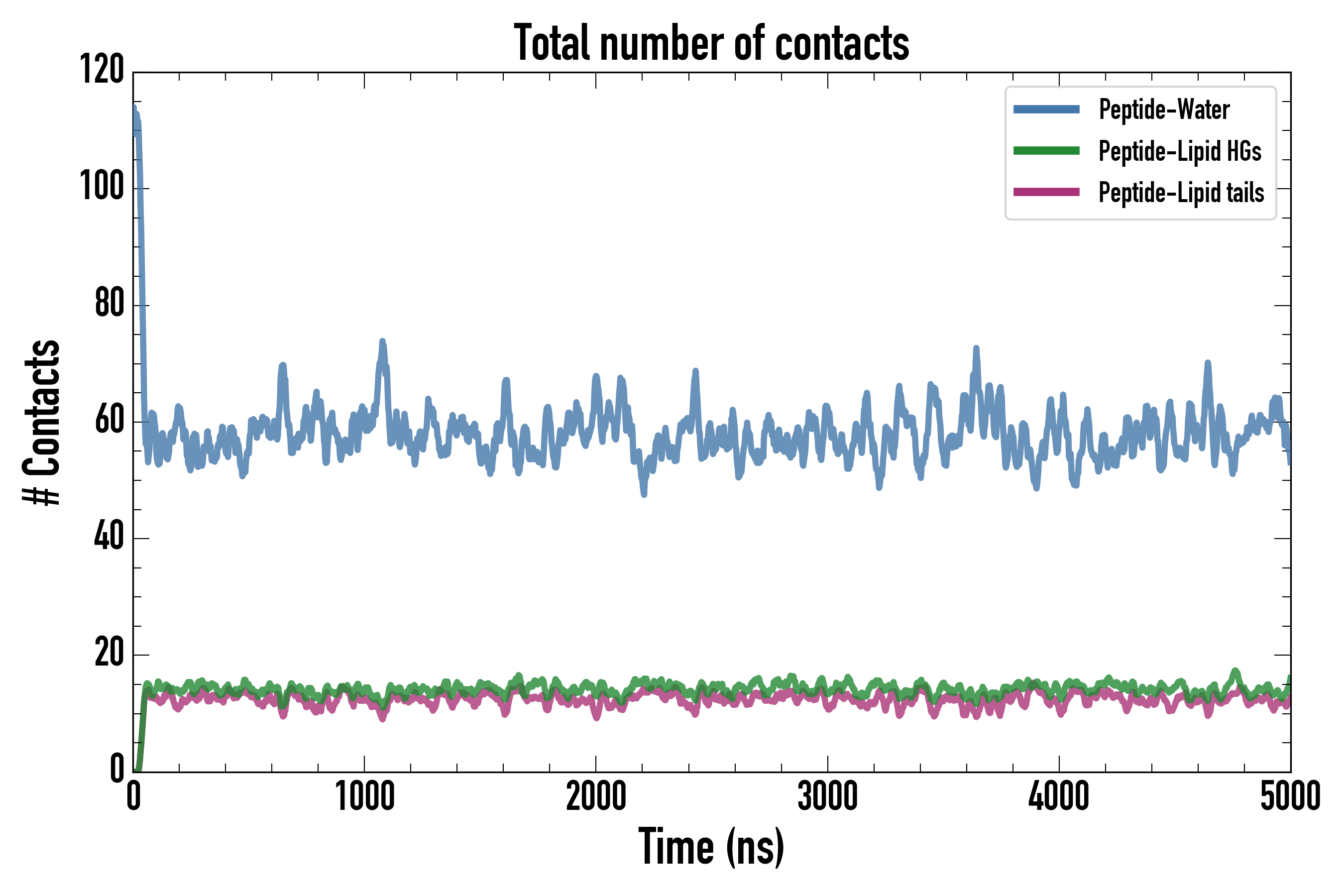 Number of contacts between each residue of the peptide backbone and the different lipid types, averaged over the last microsecond and using a cut-off of 0.6 nm.