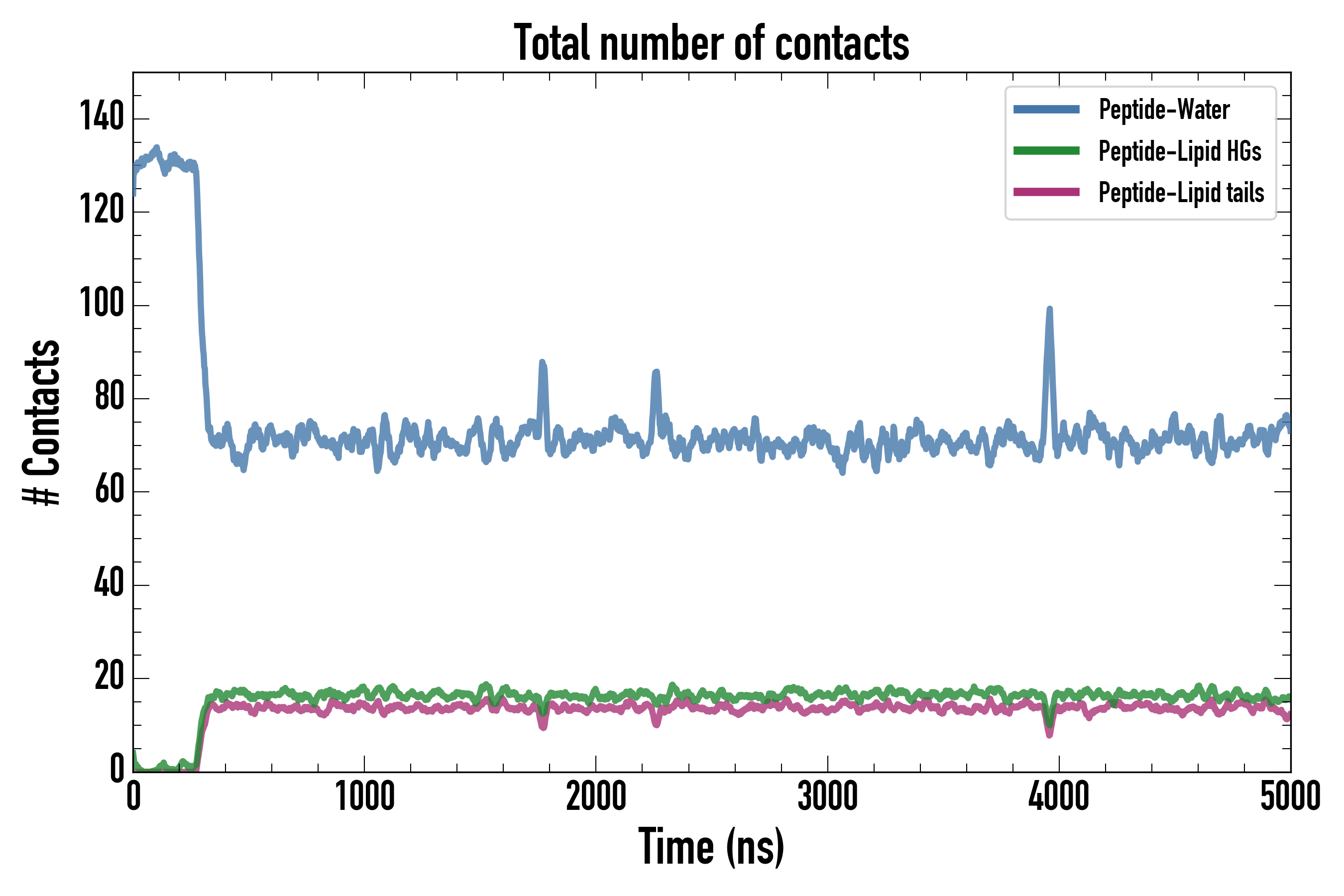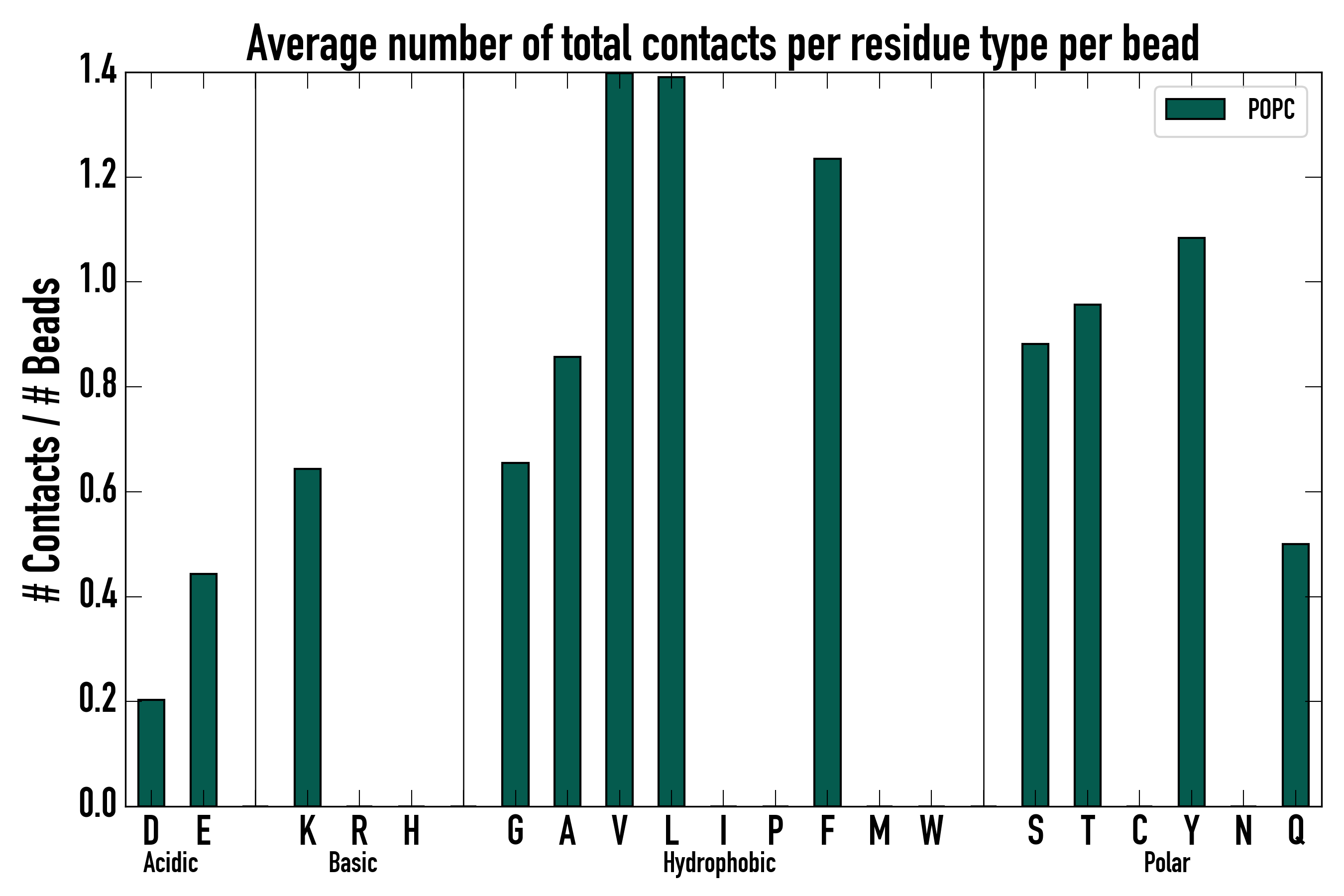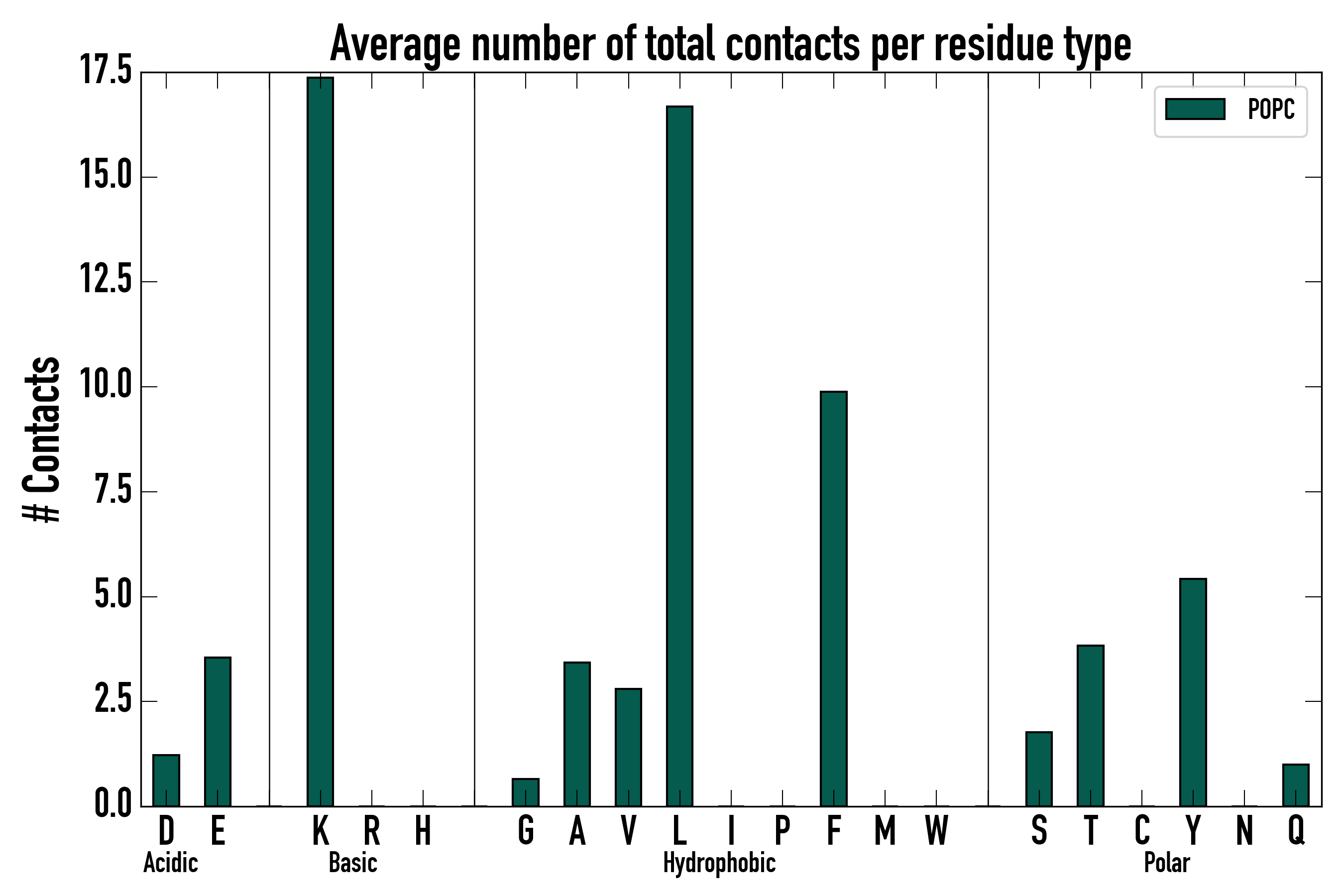 Number of contacts between each residue of the peptide backbone and the different lipid types, averaged over the last microsecond and using a cut-off of 0.6 nm.