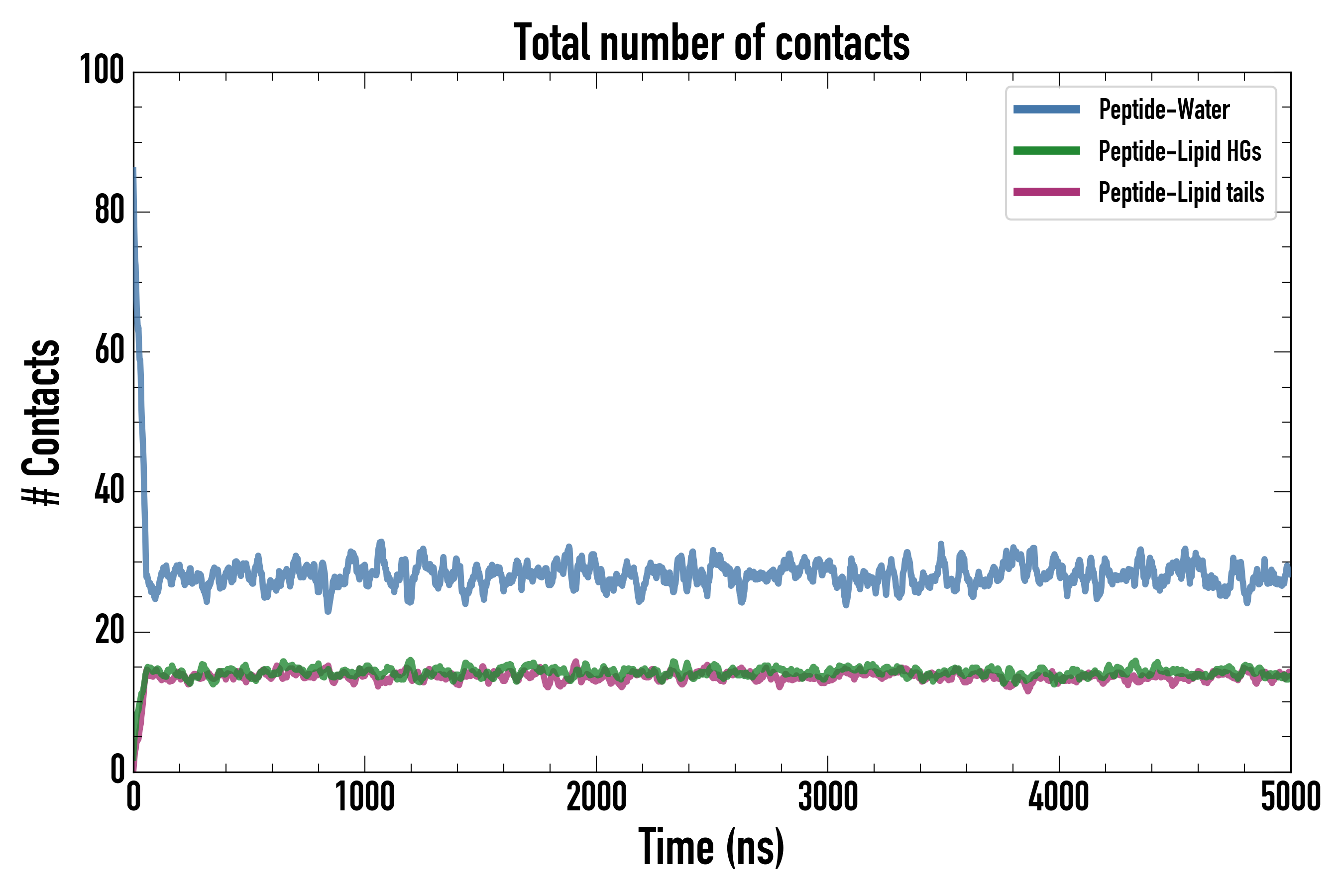 Number of contacts between each residue of the peptide backbone and the different lipid types, averaged over the last microsecond and using a cut-off of 0.6 nm.