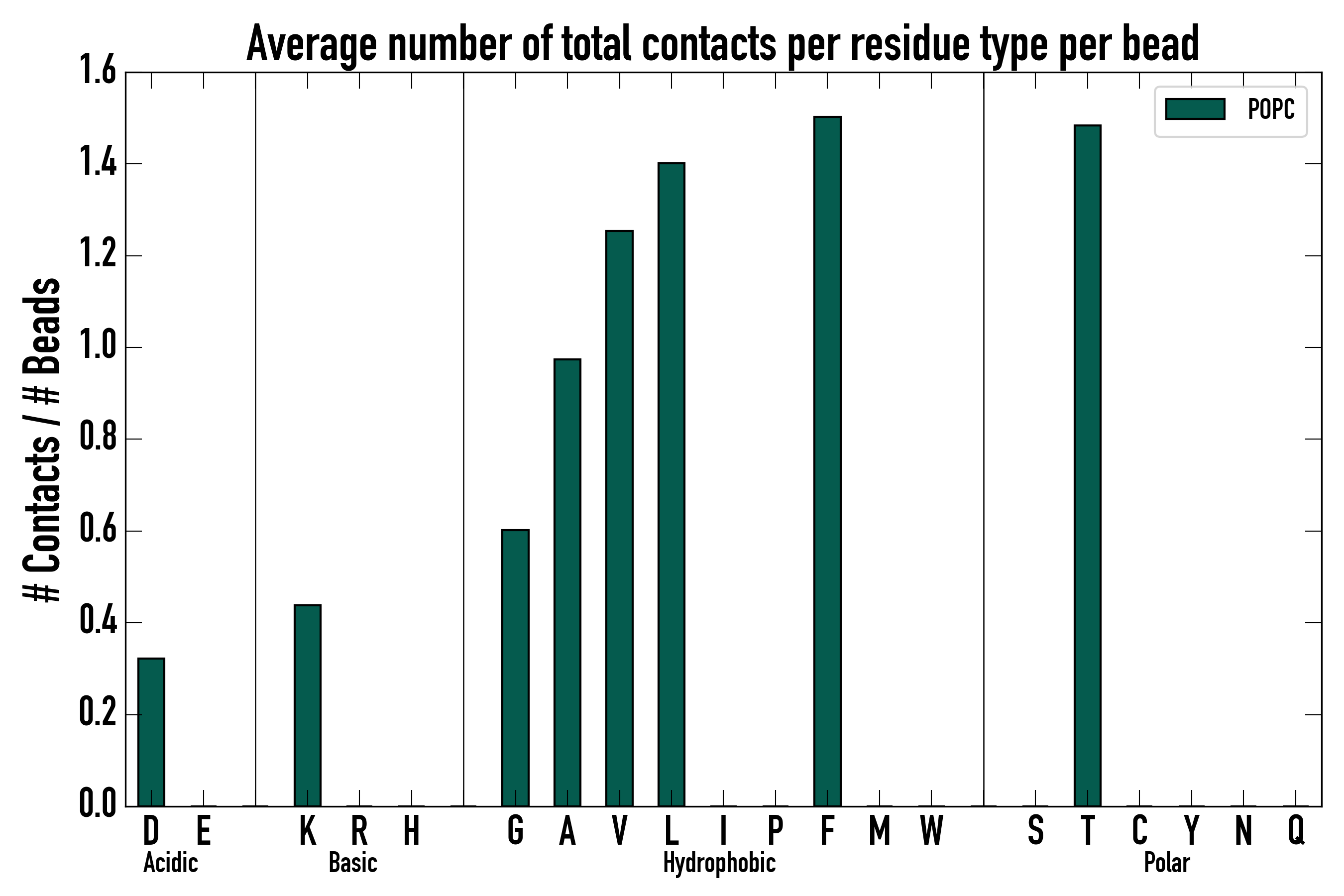 Number of contacts between each residue of the peptide backbone and the different lipid types, averaged over the last microsecond and using a cut-off of 0.6 nm.