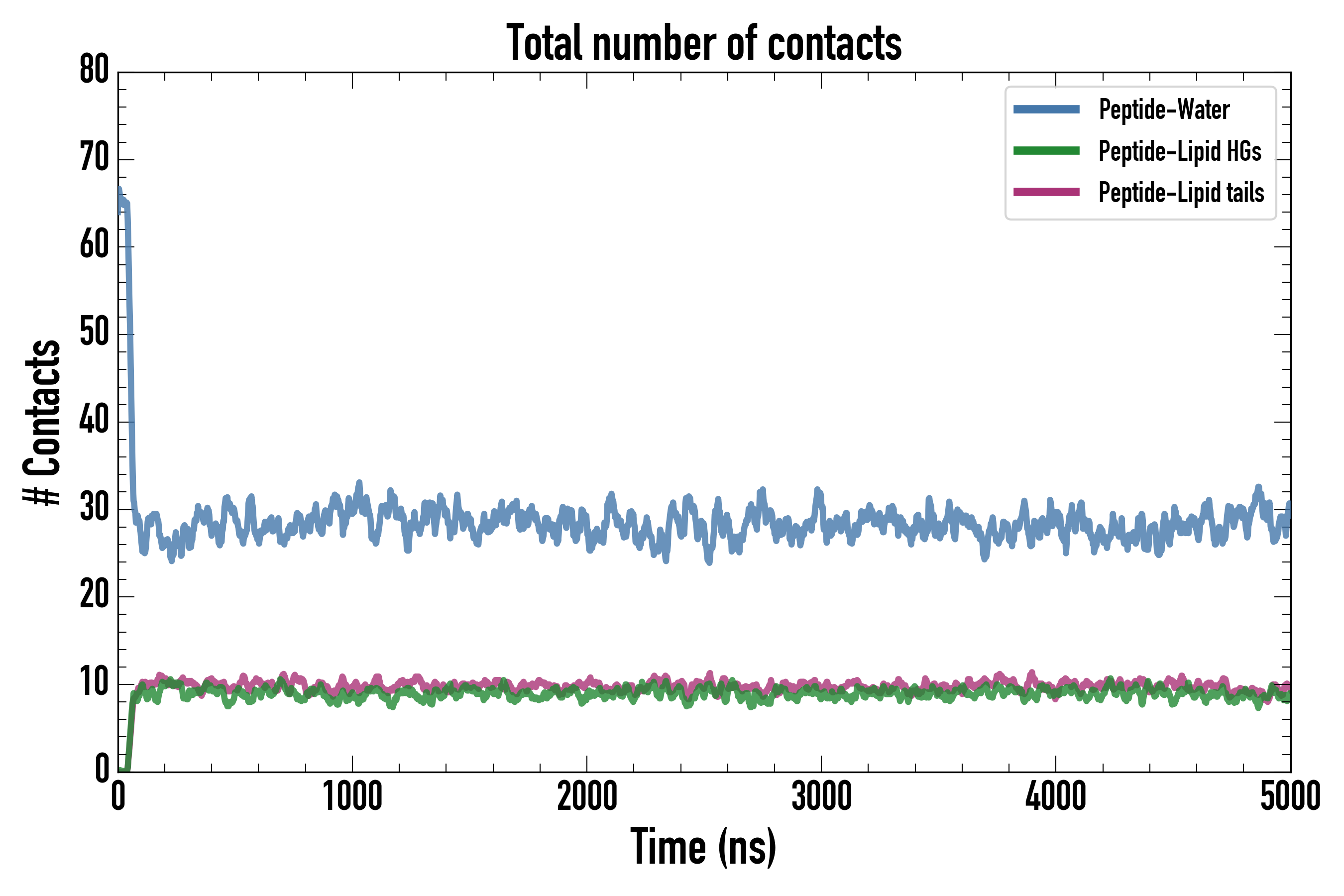 Number of contacts between each residue of the peptide backbone and the different lipid types, averaged over the last microsecond and using a cut-off of 0.6 nm.