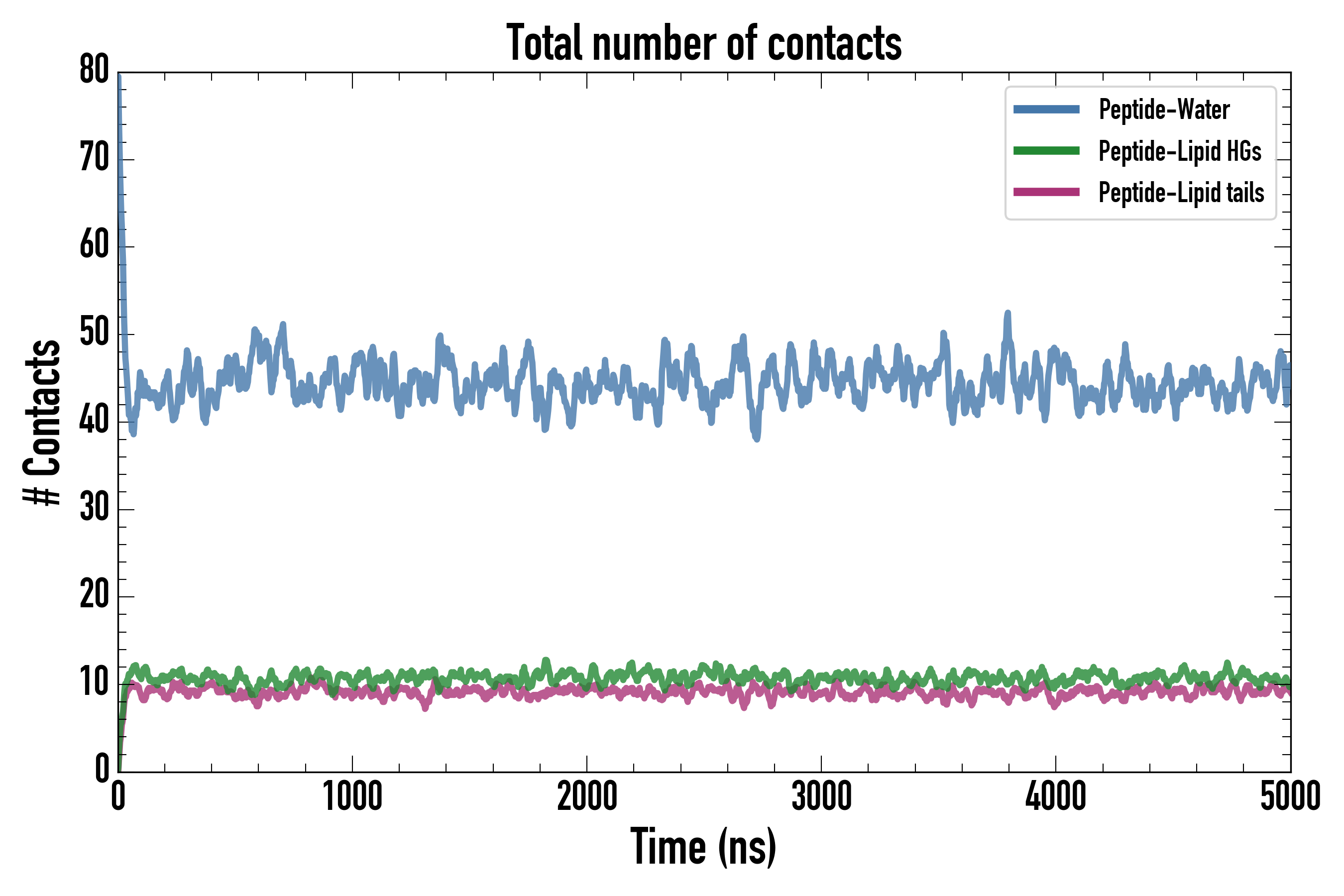 Number of contacts between each residue of the peptide backbone and the different lipid types, averaged over the last microsecond and using a cut-off of 0.6 nm.