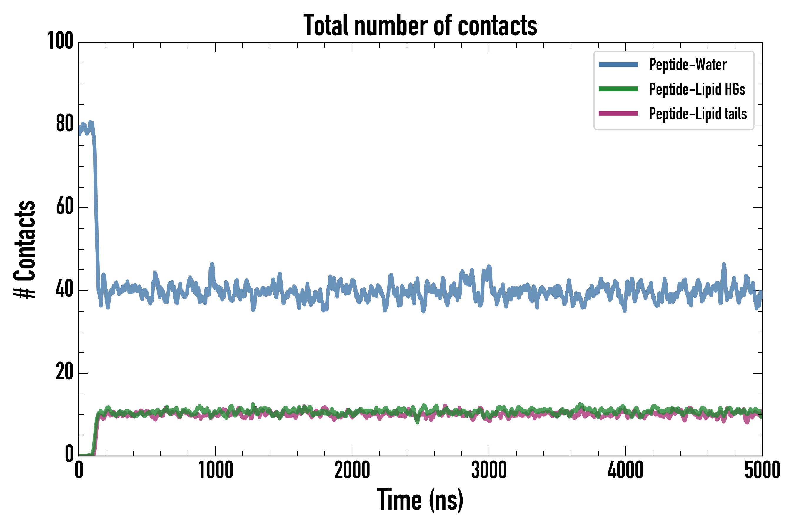 Number of contacts between each residue of the peptide backbone and the different lipid types, averaged over the last microsecond and using a cut-off of 0.6 nm.