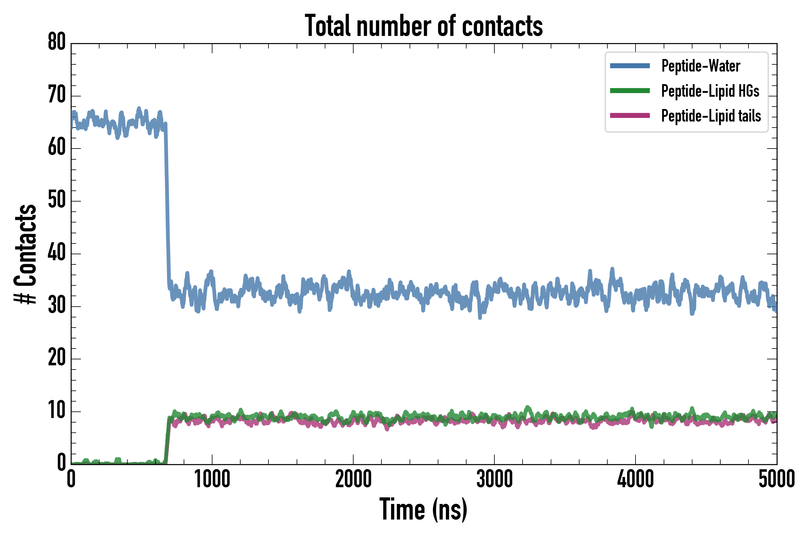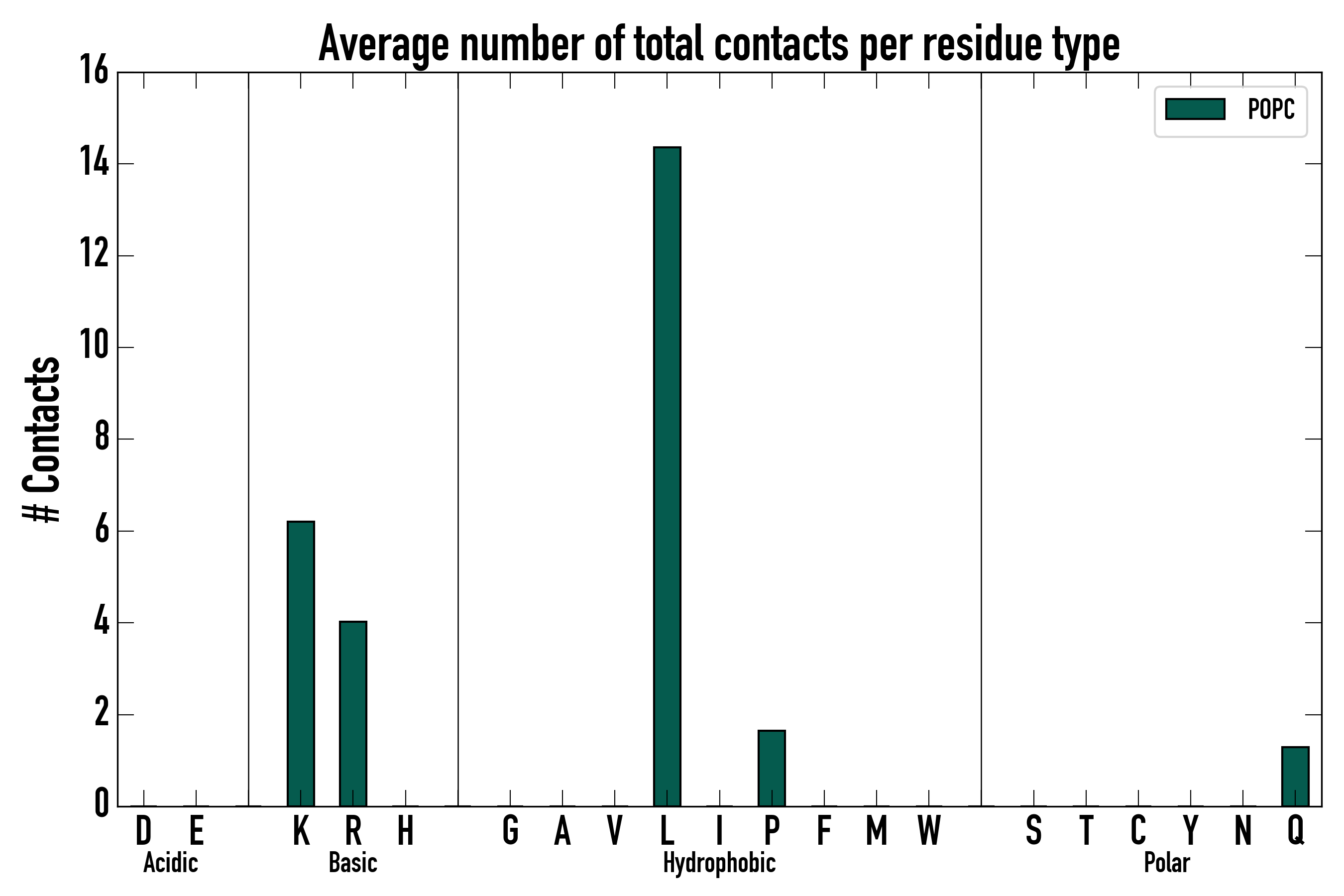 Number of contacts between each residue of the peptide backbone and the different lipid types, averaged over the last microsecond and using a cut-off of 0.6 nm.
