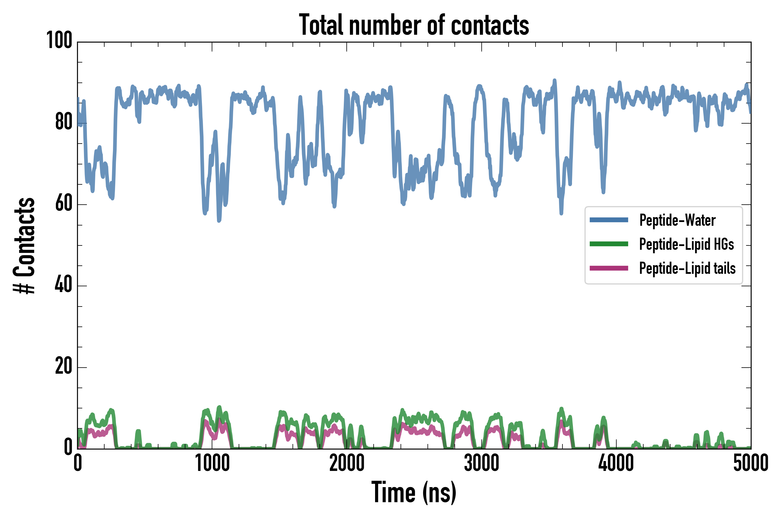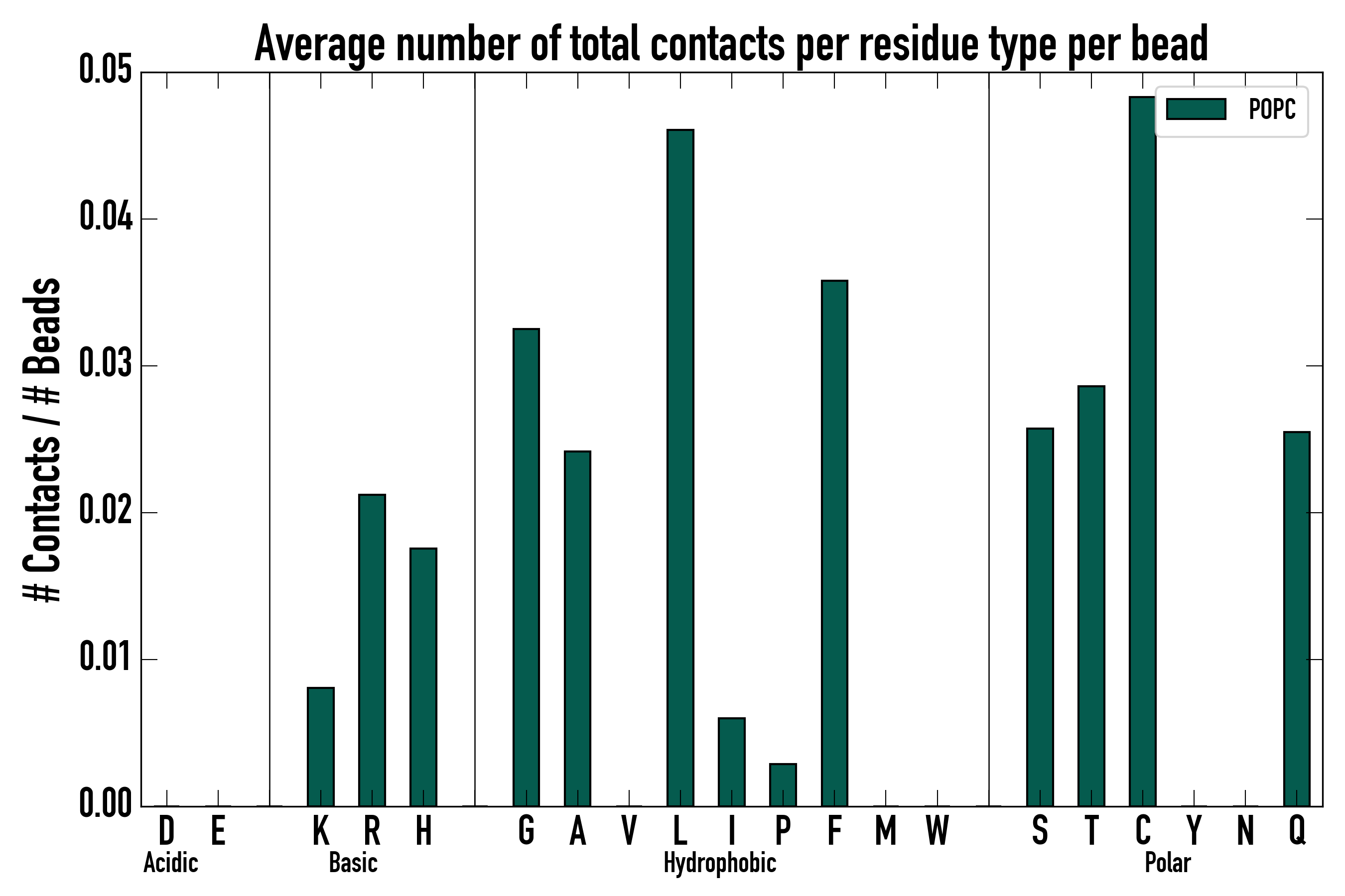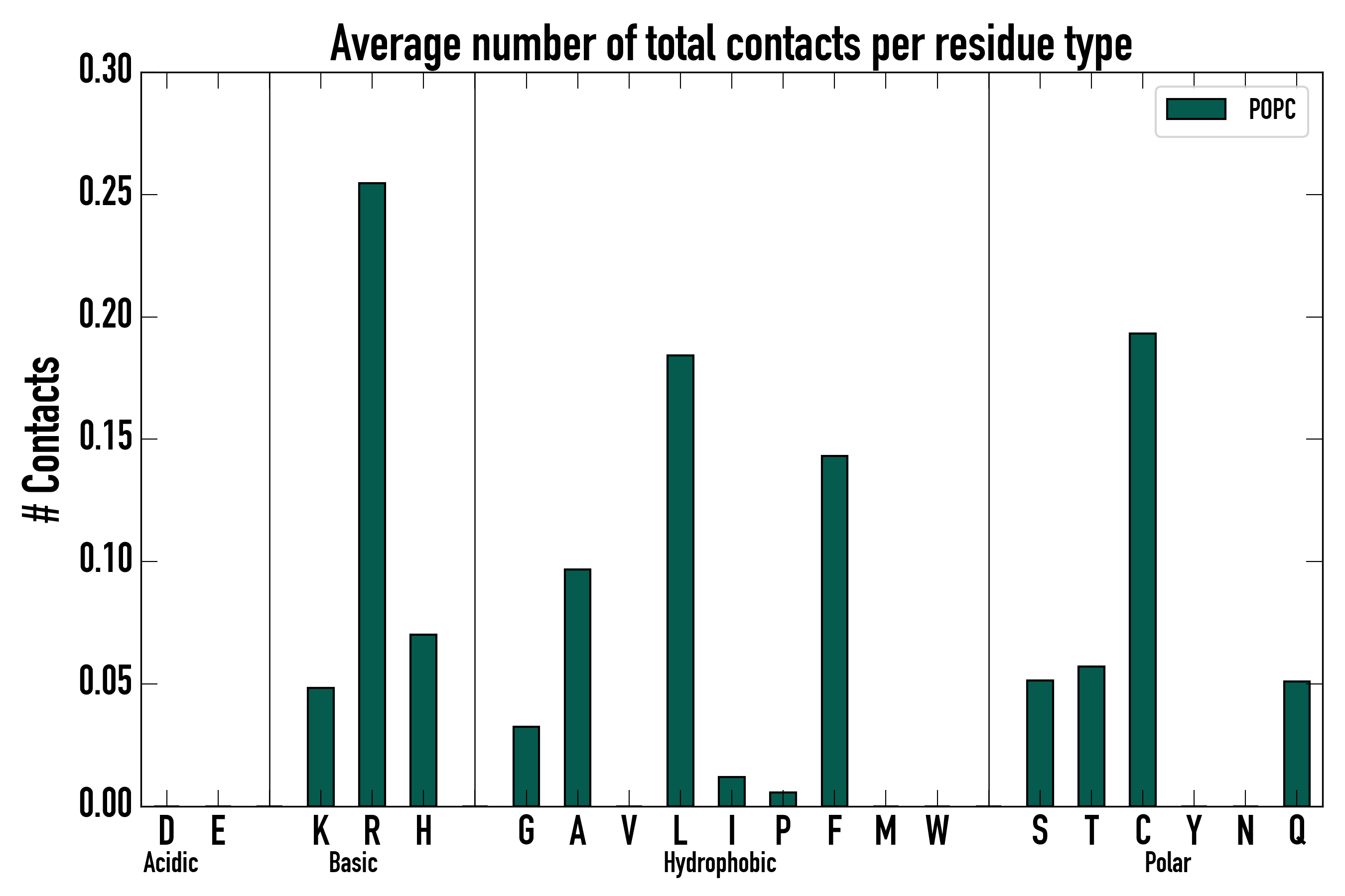 Number of contacts between each residue of the peptide backbone and the different lipid types, averaged over the last microsecond and using a cut-off of 0.6 nm.