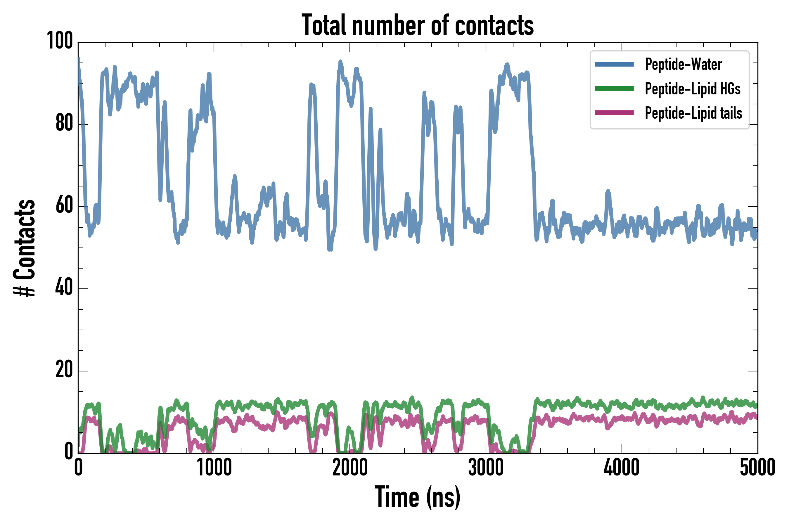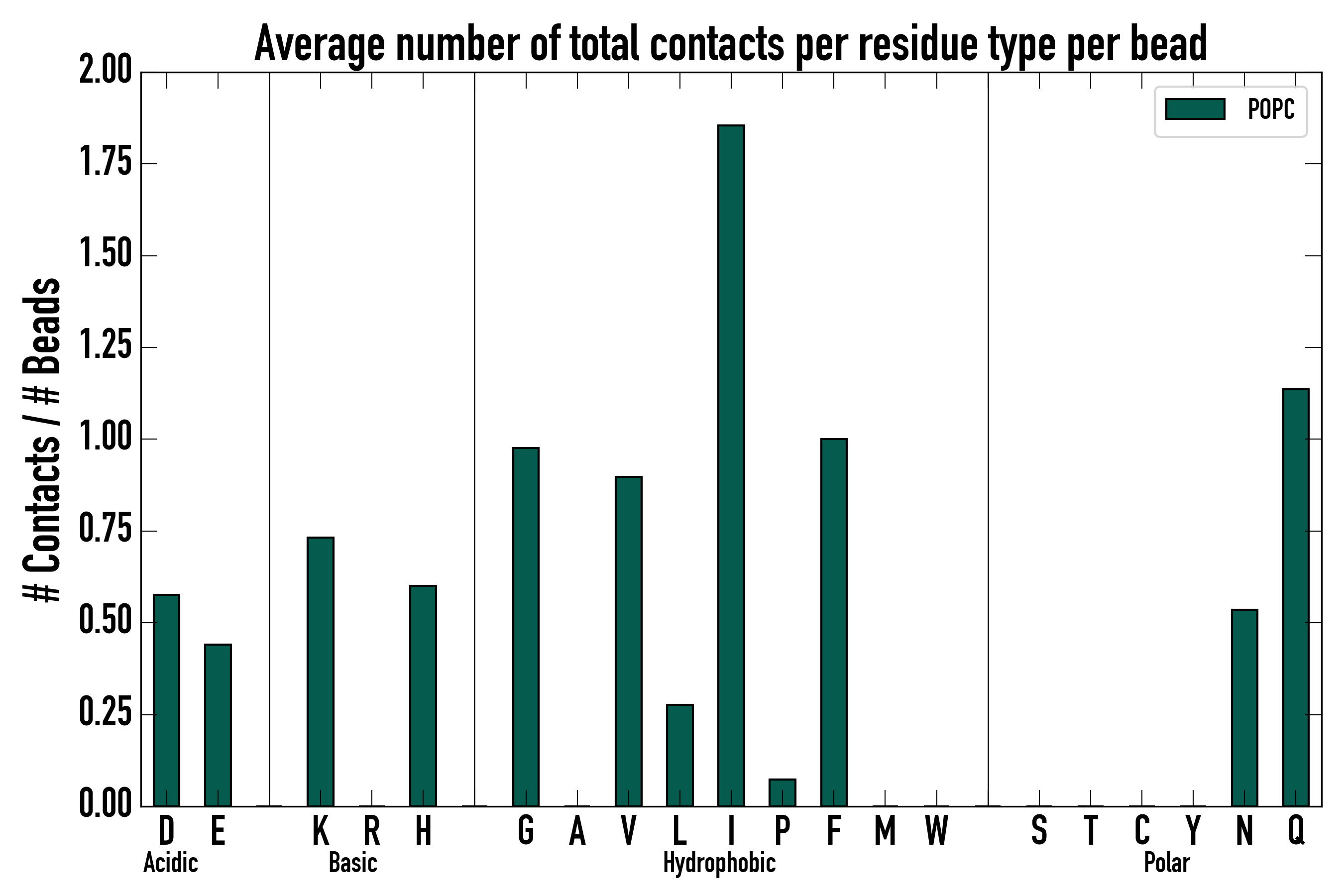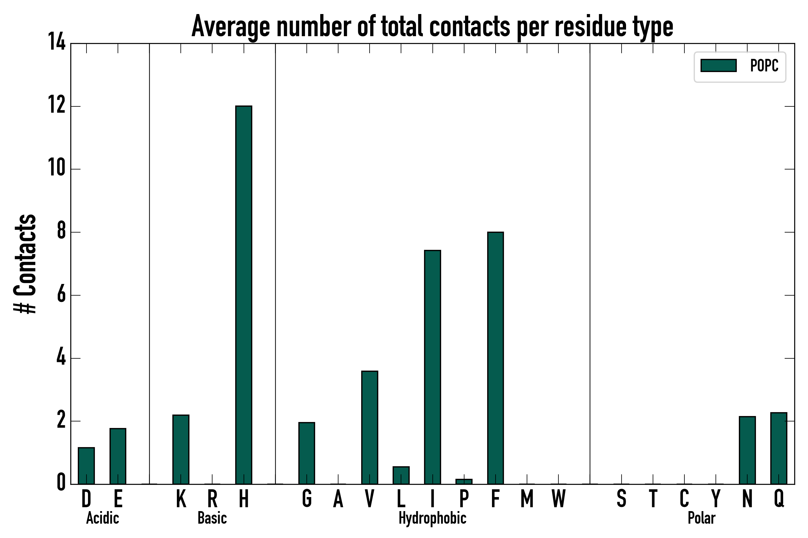 Number of contacts between each residue of the peptide backbone and the different lipid types, averaged over the last microsecond and using a cut-off of 0.6 nm.