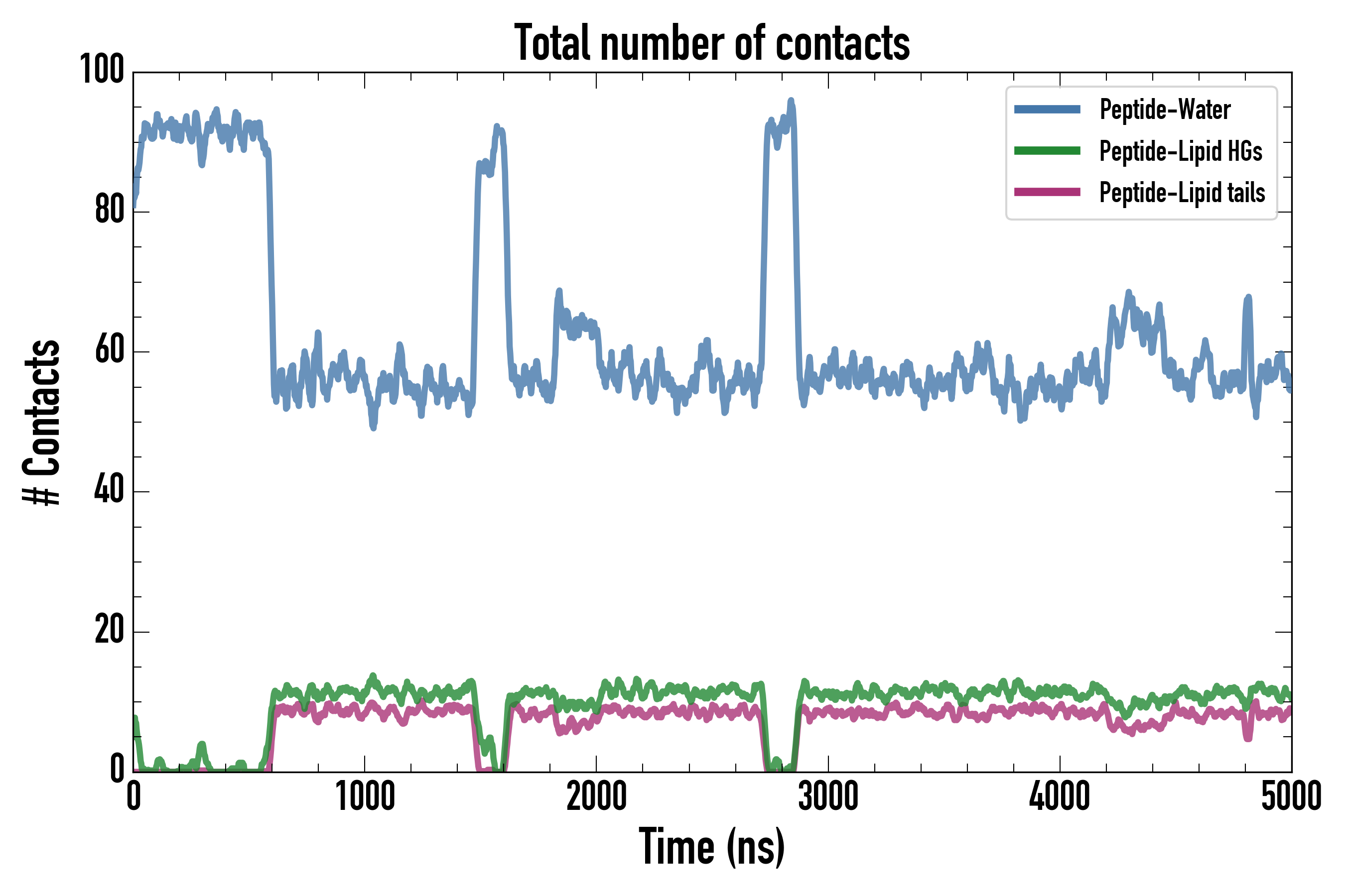 Number of contacts between each residue of the peptide backbone and the different lipid types, averaged over the last microsecond and using a cut-off of 0.6 nm.