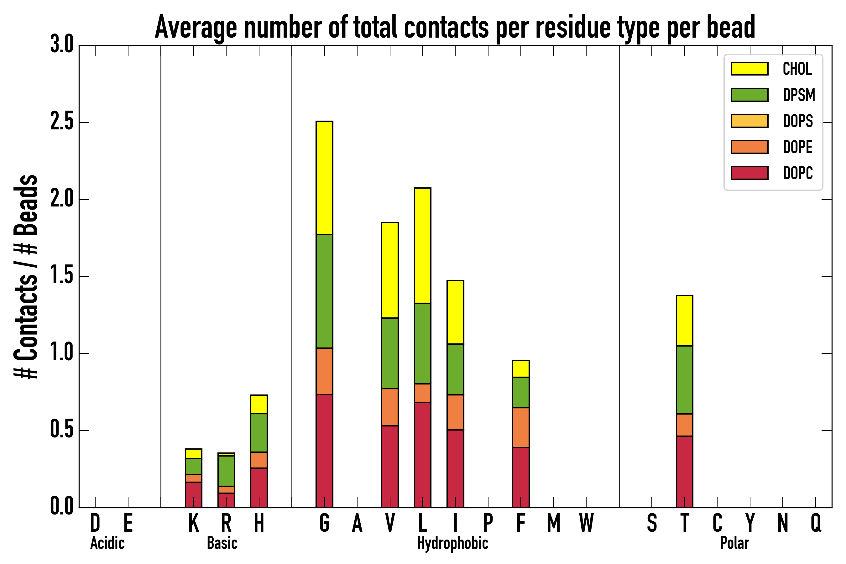Number of contacts between each residue of the peptide backbone and the different lipid types, averaged over the last microsecond and using a cut-off of 0.6 nm.