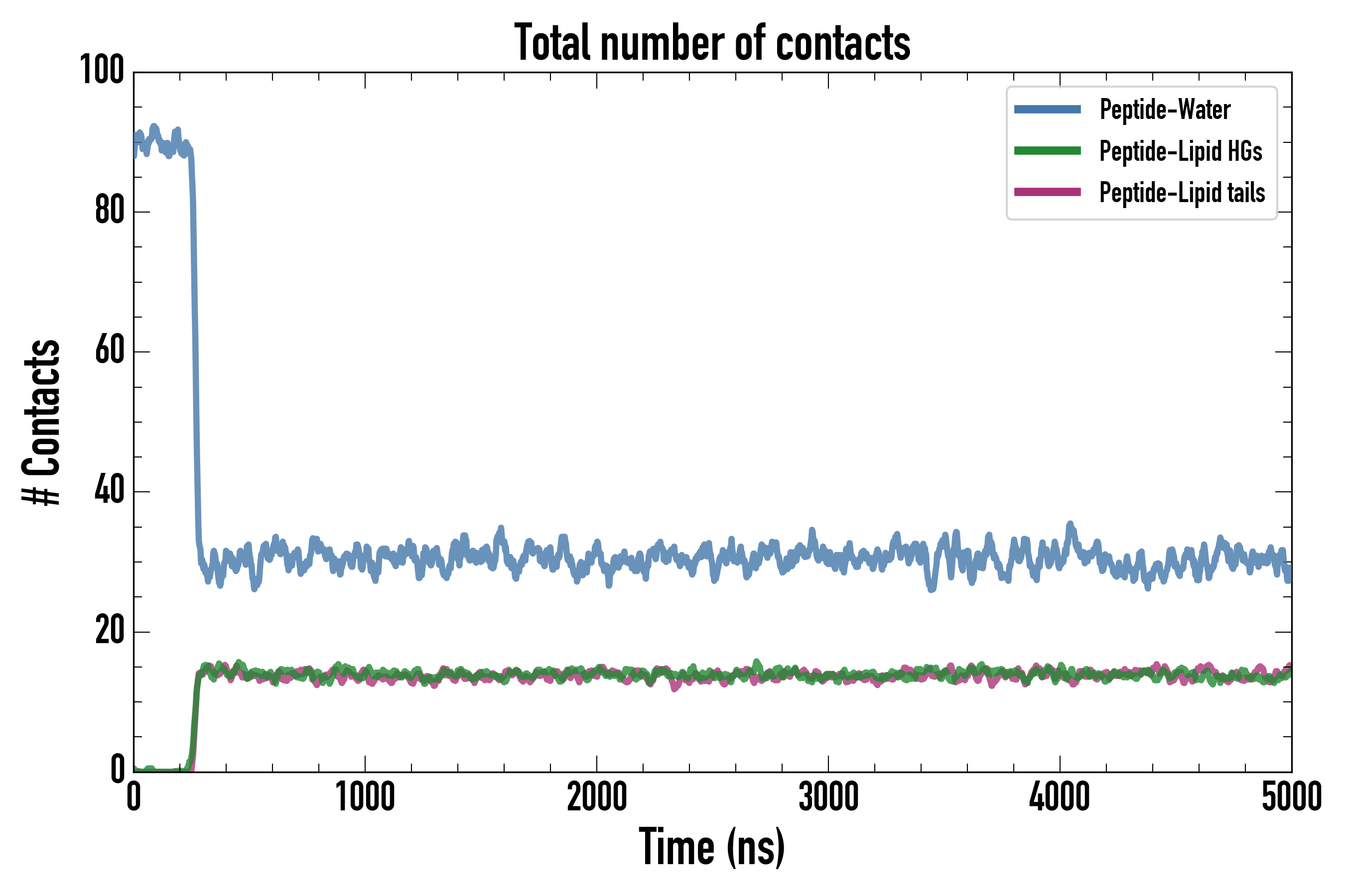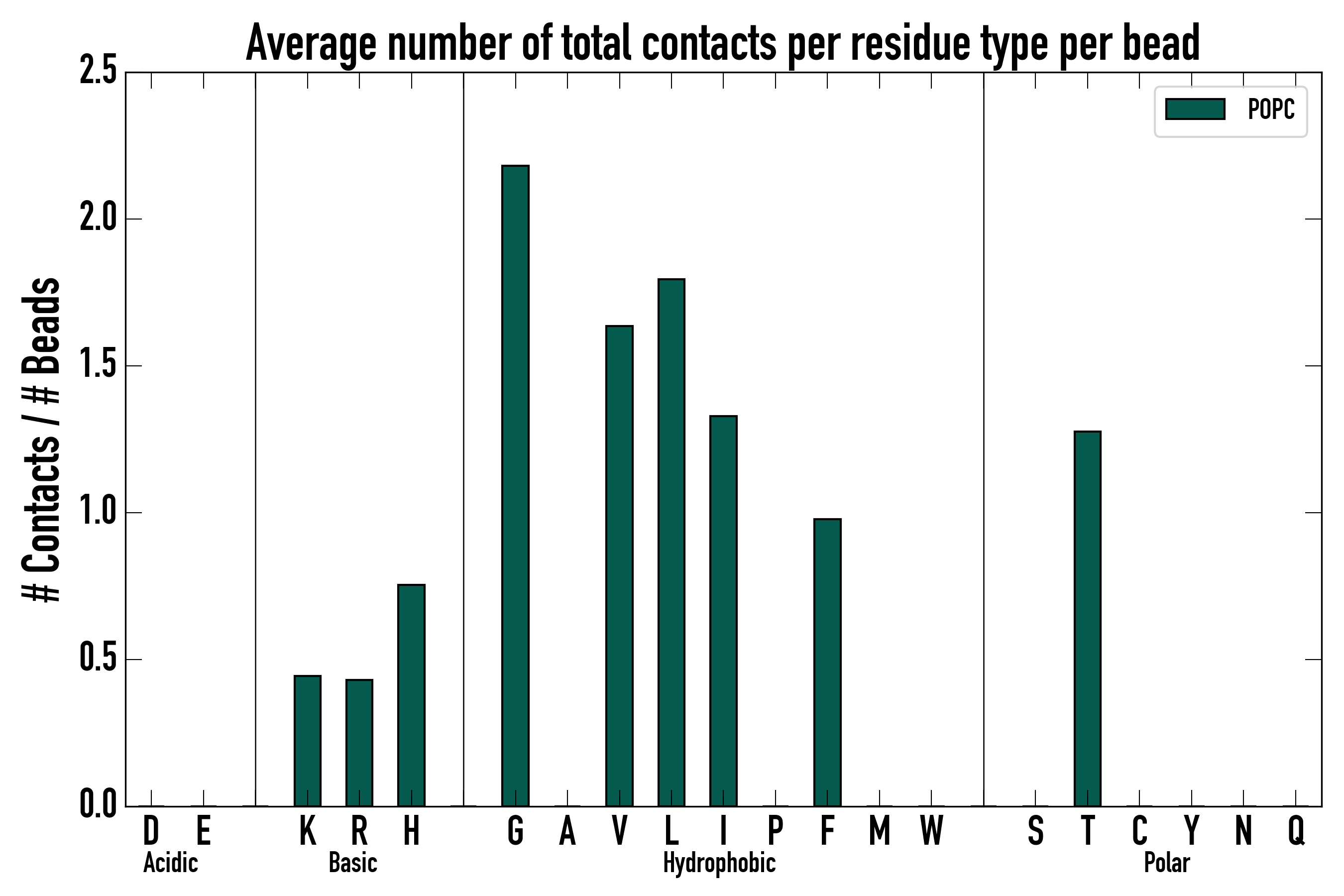 Number of contacts between each residue of the peptide backbone and the different lipid types, averaged over the last microsecond and using a cut-off of 0.6 nm.