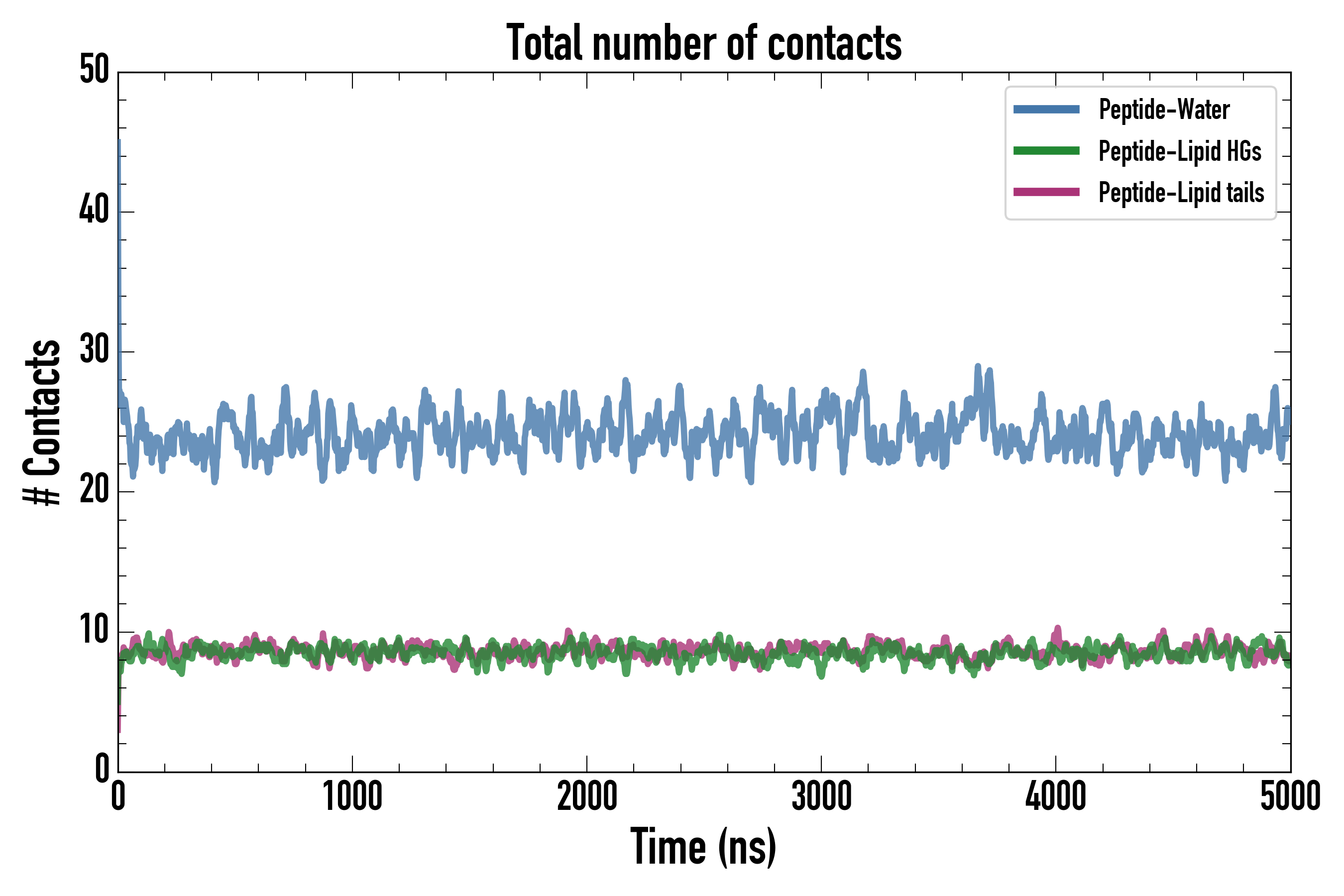 Number of contacts between each residue of the peptide backbone and the different lipid types, averaged over the last microsecond and using a cut-off of 0.6 nm.