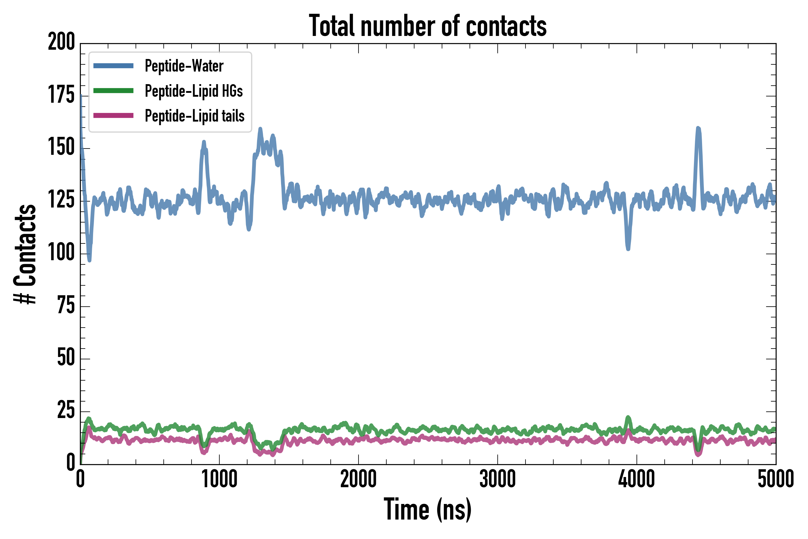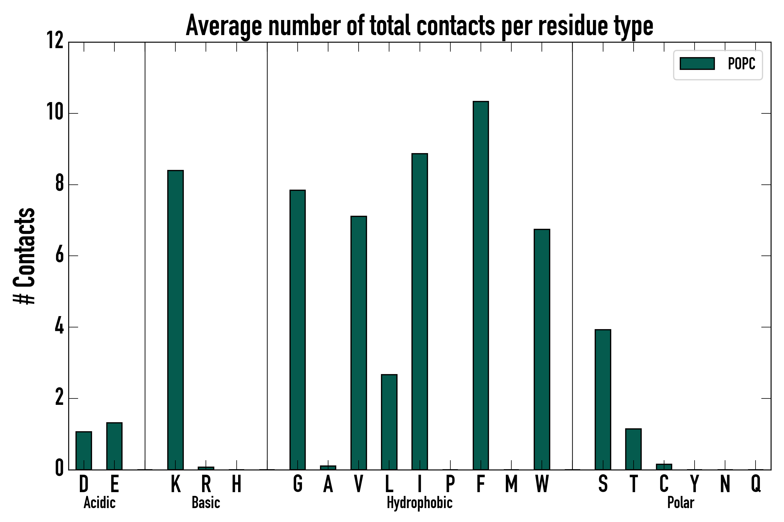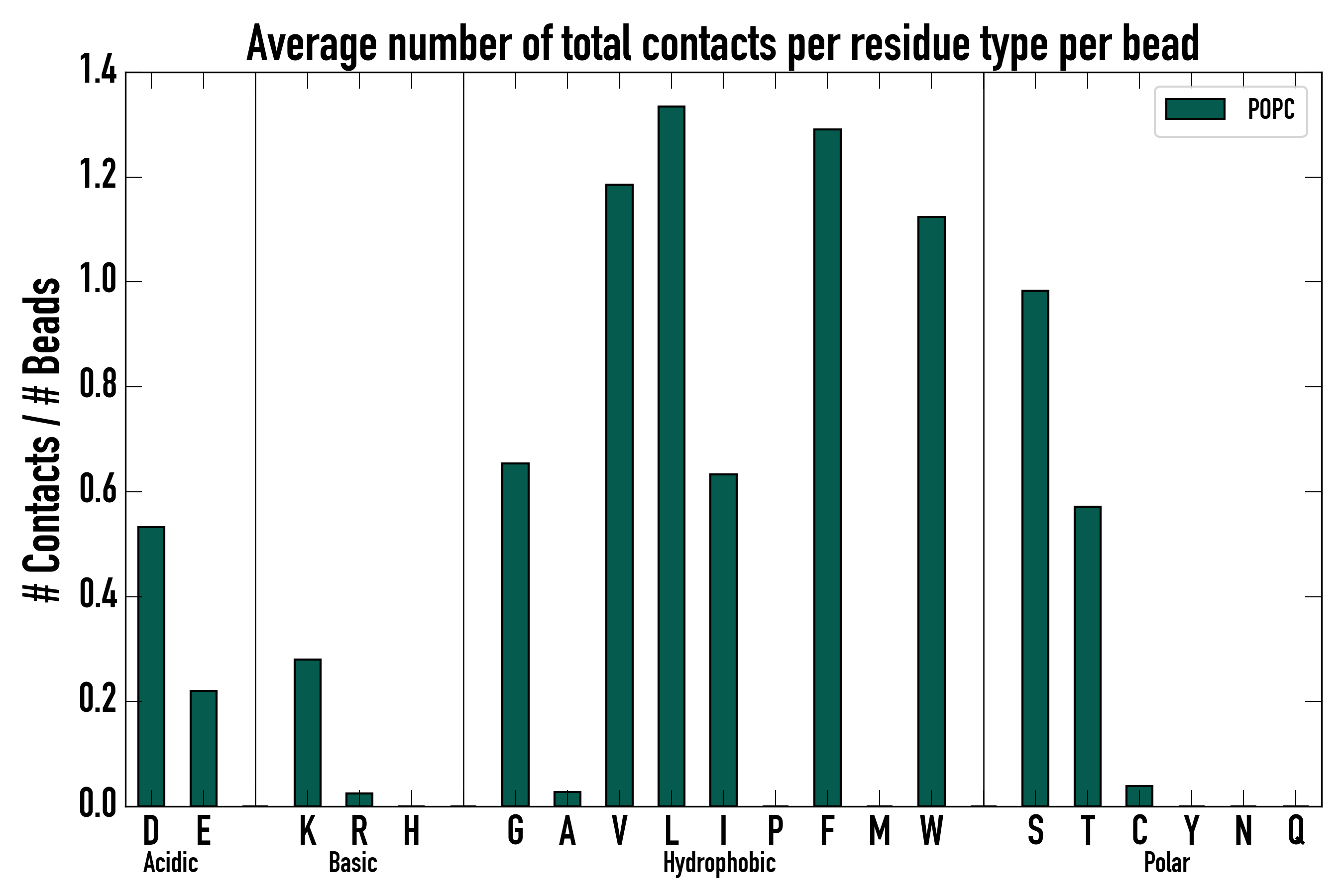 Number of contacts between each residue of the peptide backbone and the different lipid types, averaged over the last microsecond and using a cut-off of 0.6 nm.