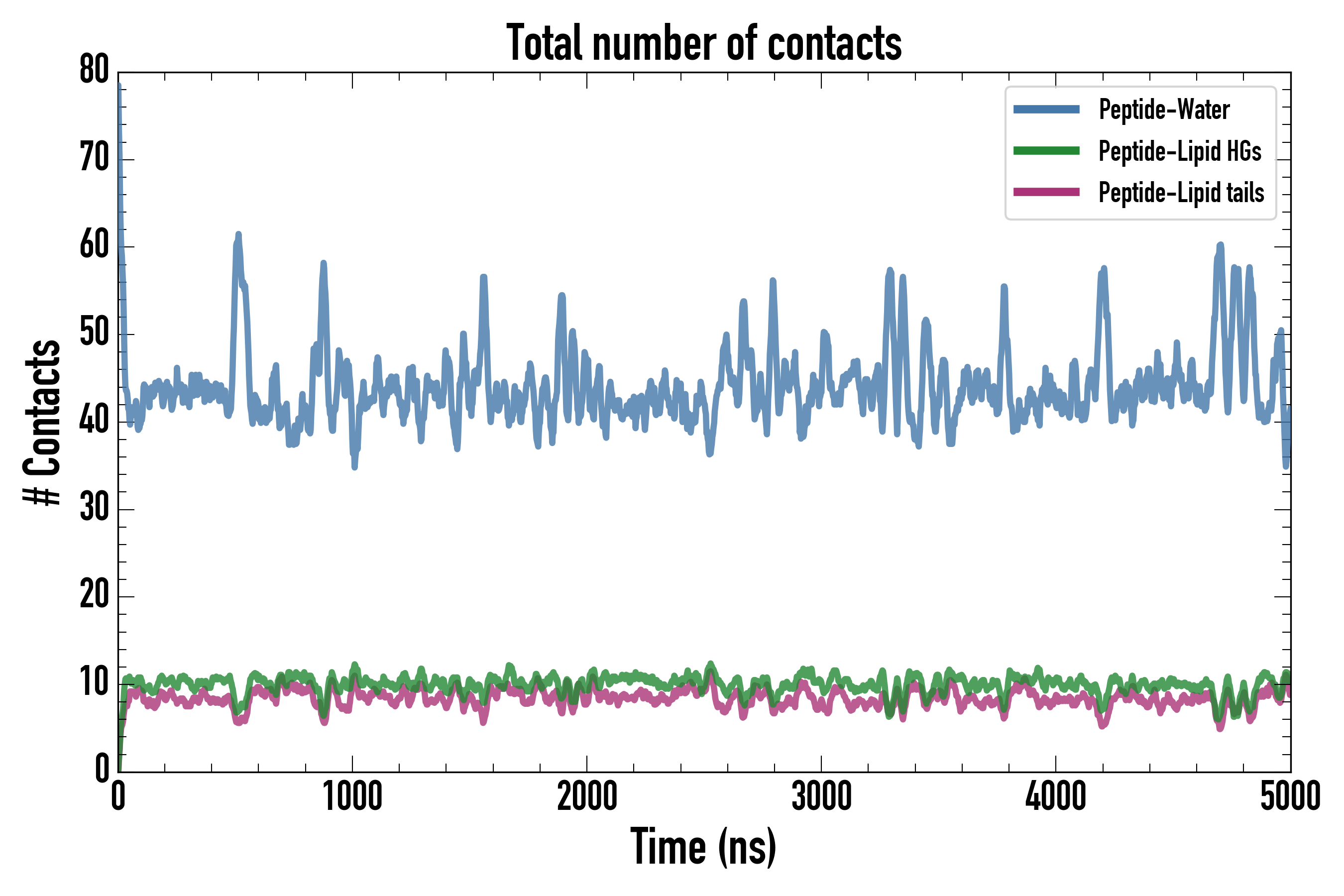 Number of contacts between each residue of the peptide backbone and the different lipid types, averaged over the last microsecond and using a cut-off of 0.6 nm.