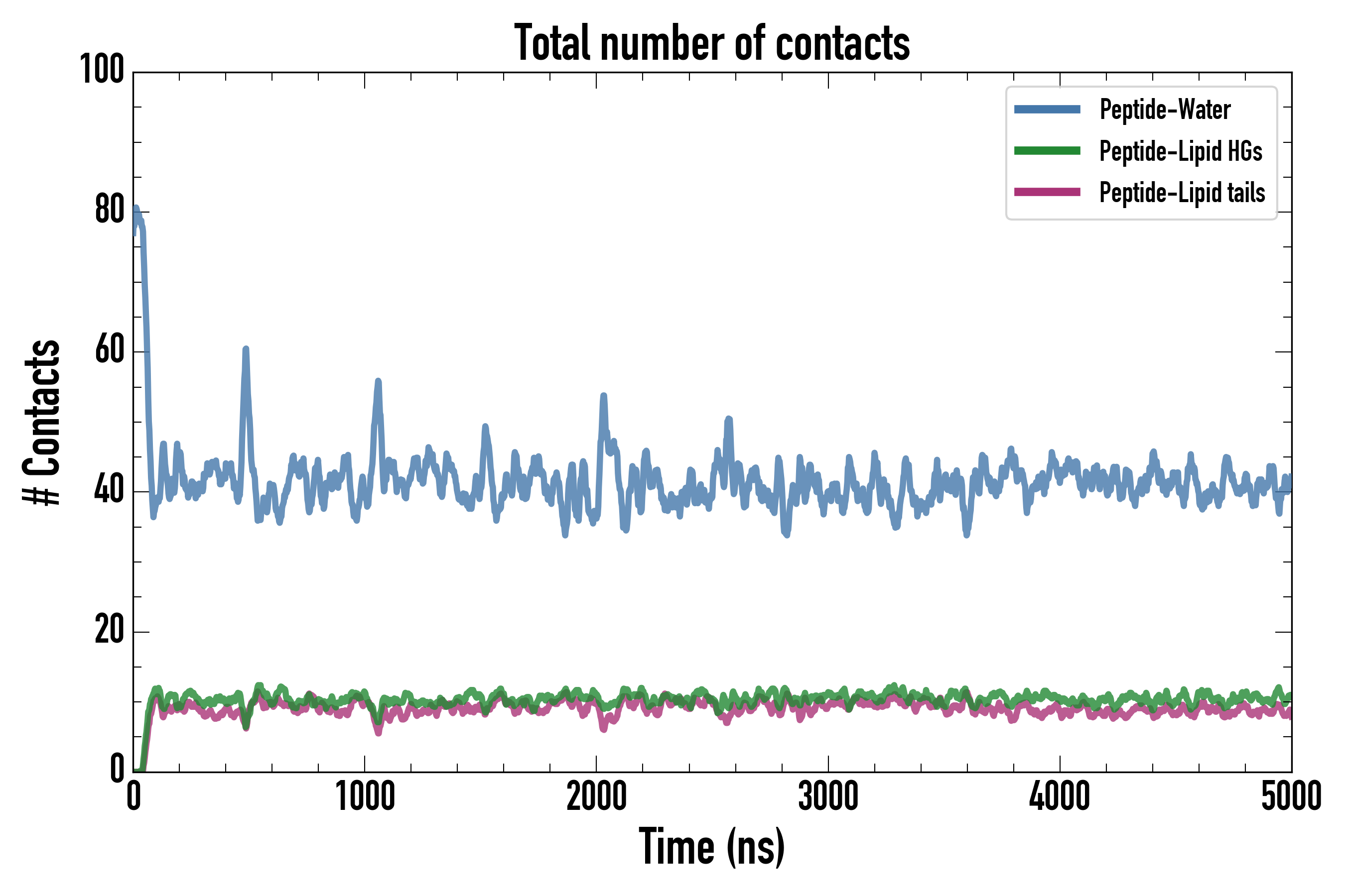 Number of contacts between each residue of the peptide backbone and the different lipid types, averaged over the last microsecond and using a cut-off of 0.6 nm.