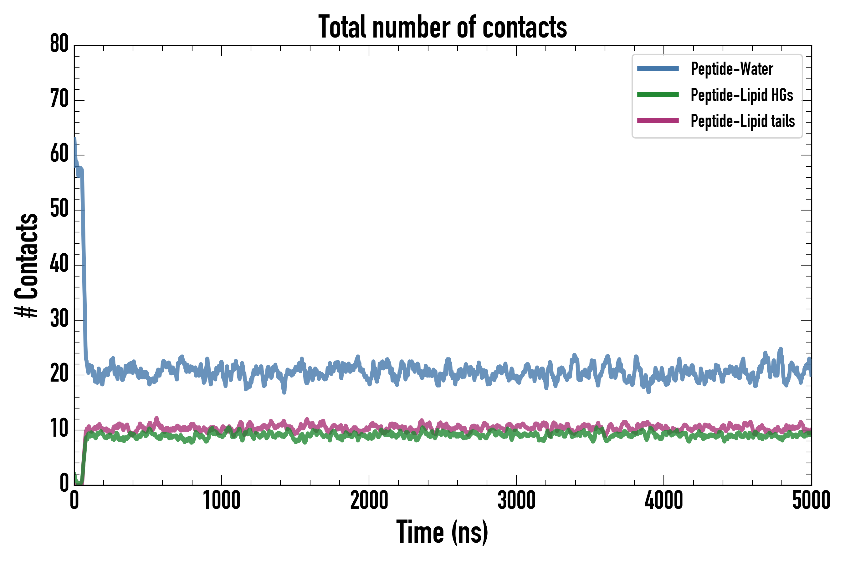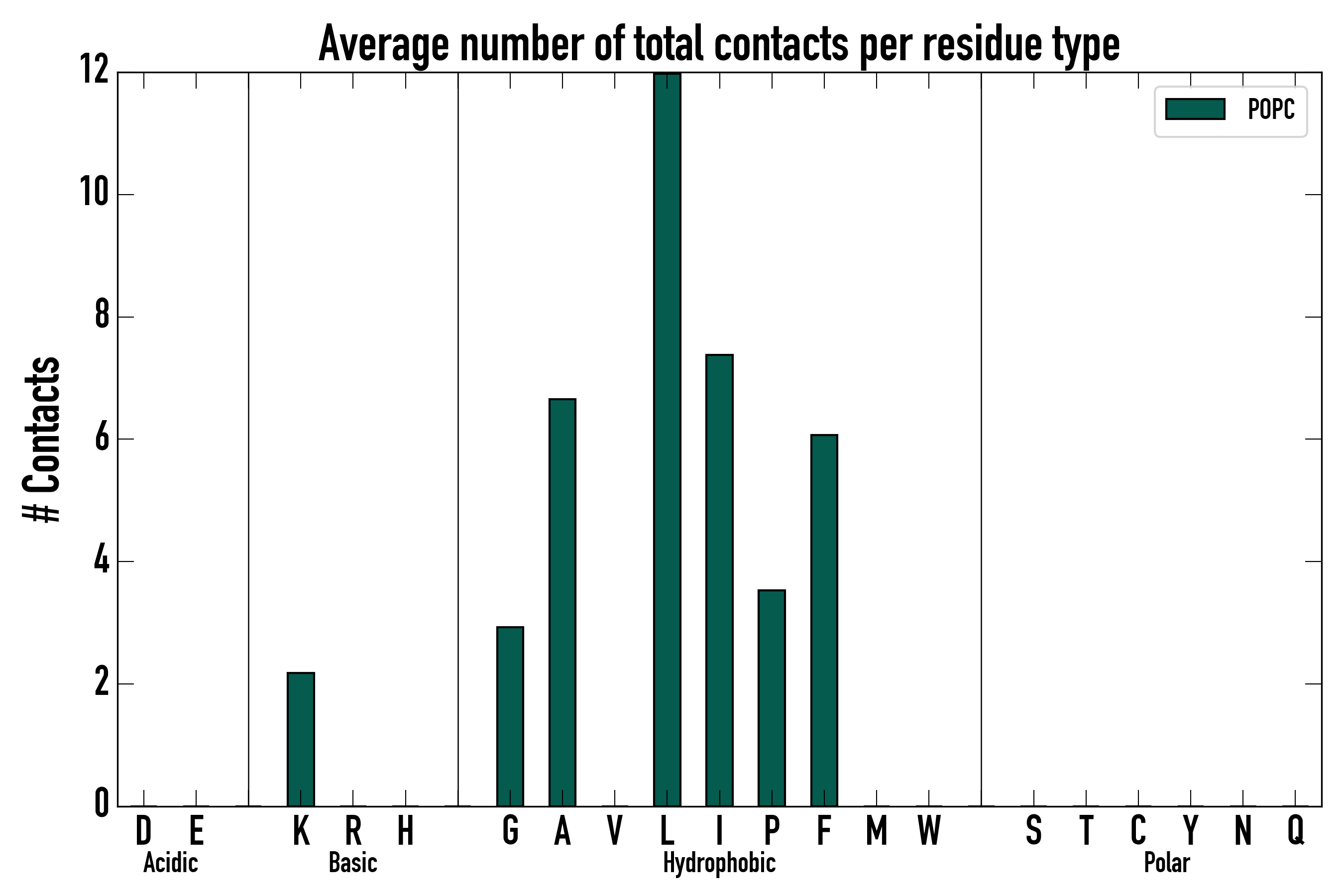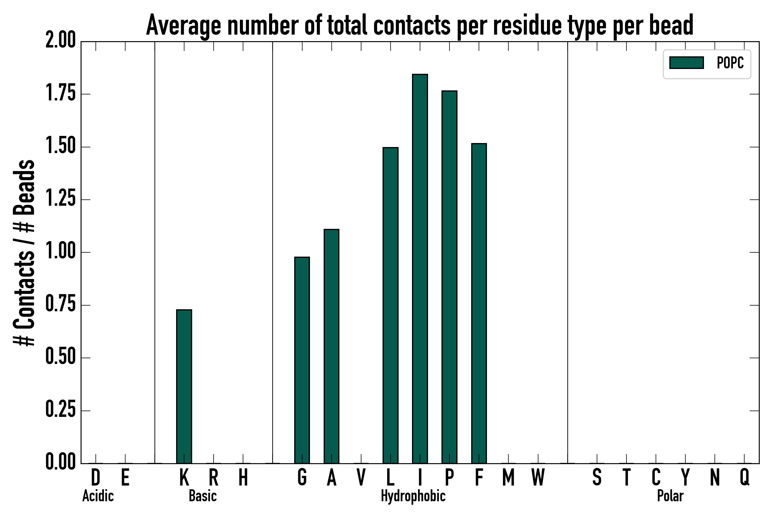 Number of contacts between each residue of the peptide backbone and the different lipid types, averaged over the last microsecond and using a cut-off of 0.6 nm.