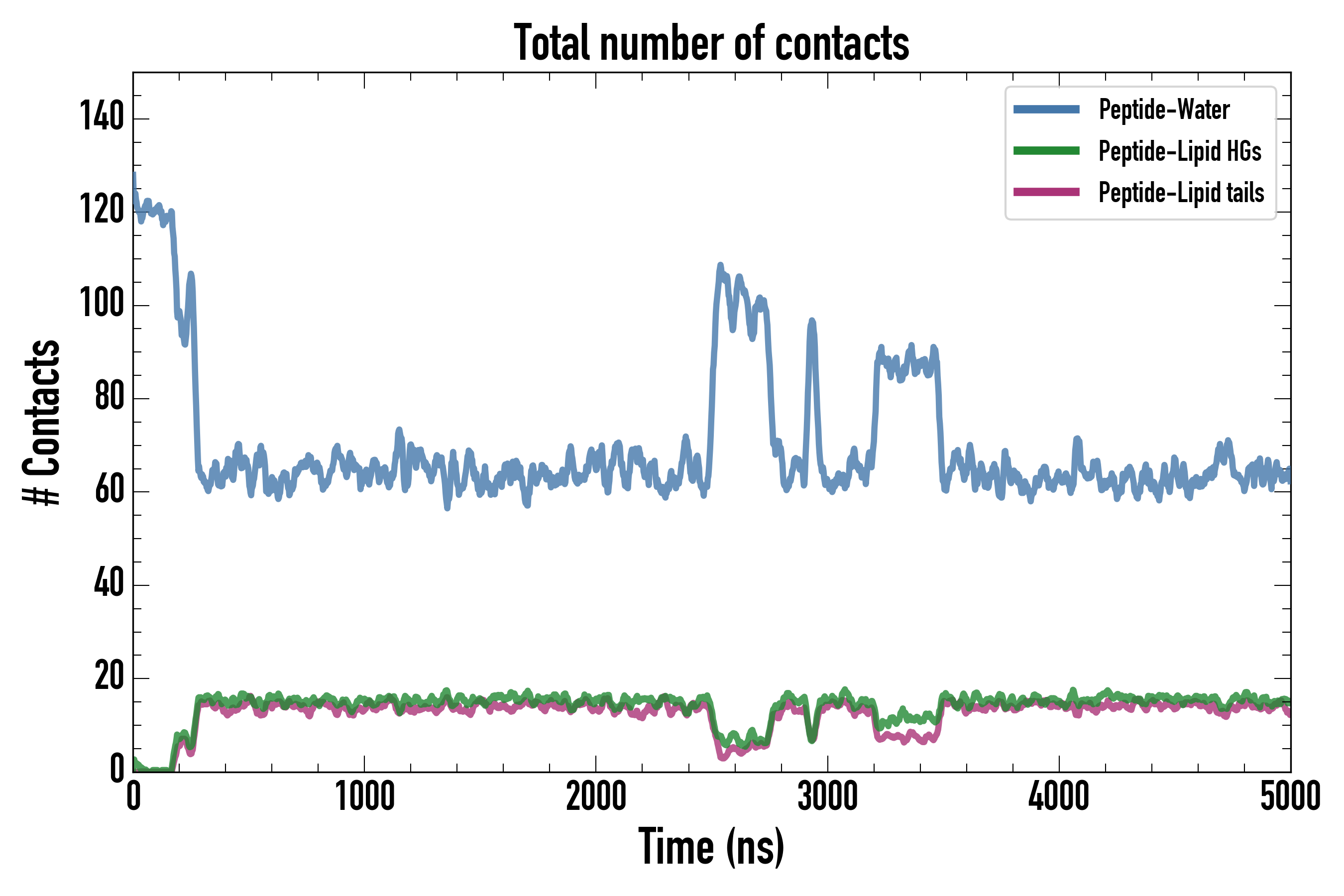 Number of contacts between each residue of the peptide backbone and the different lipid types, averaged over the last microsecond and using a cut-off of 0.6 nm.