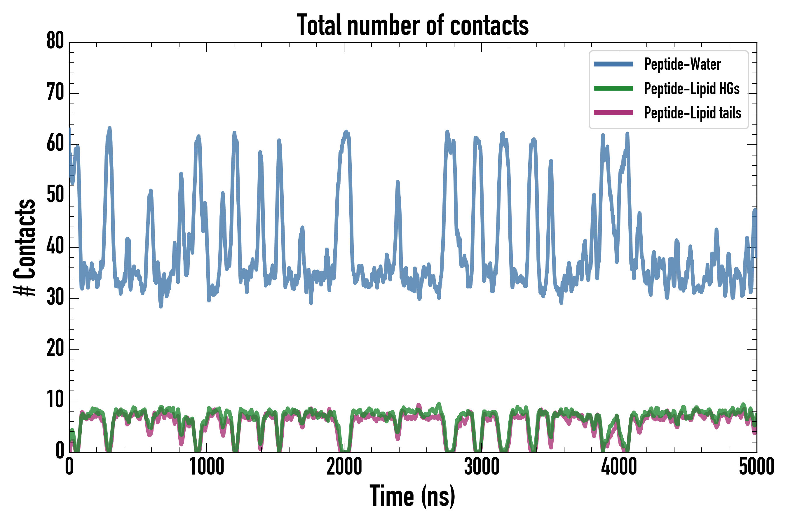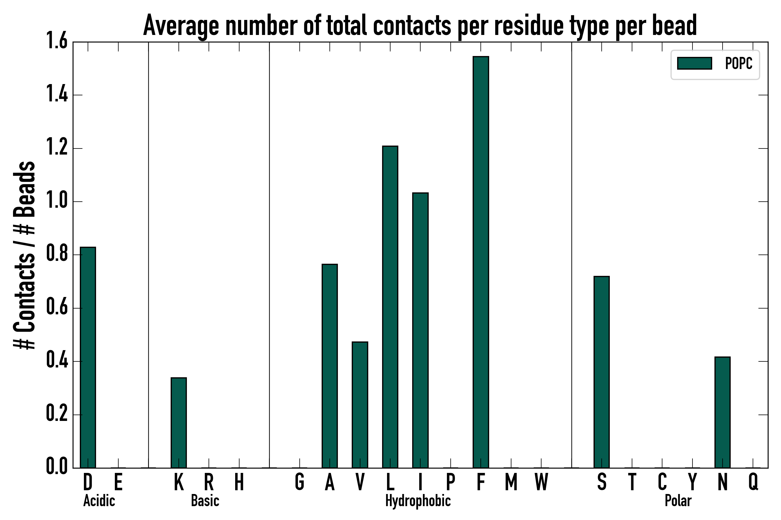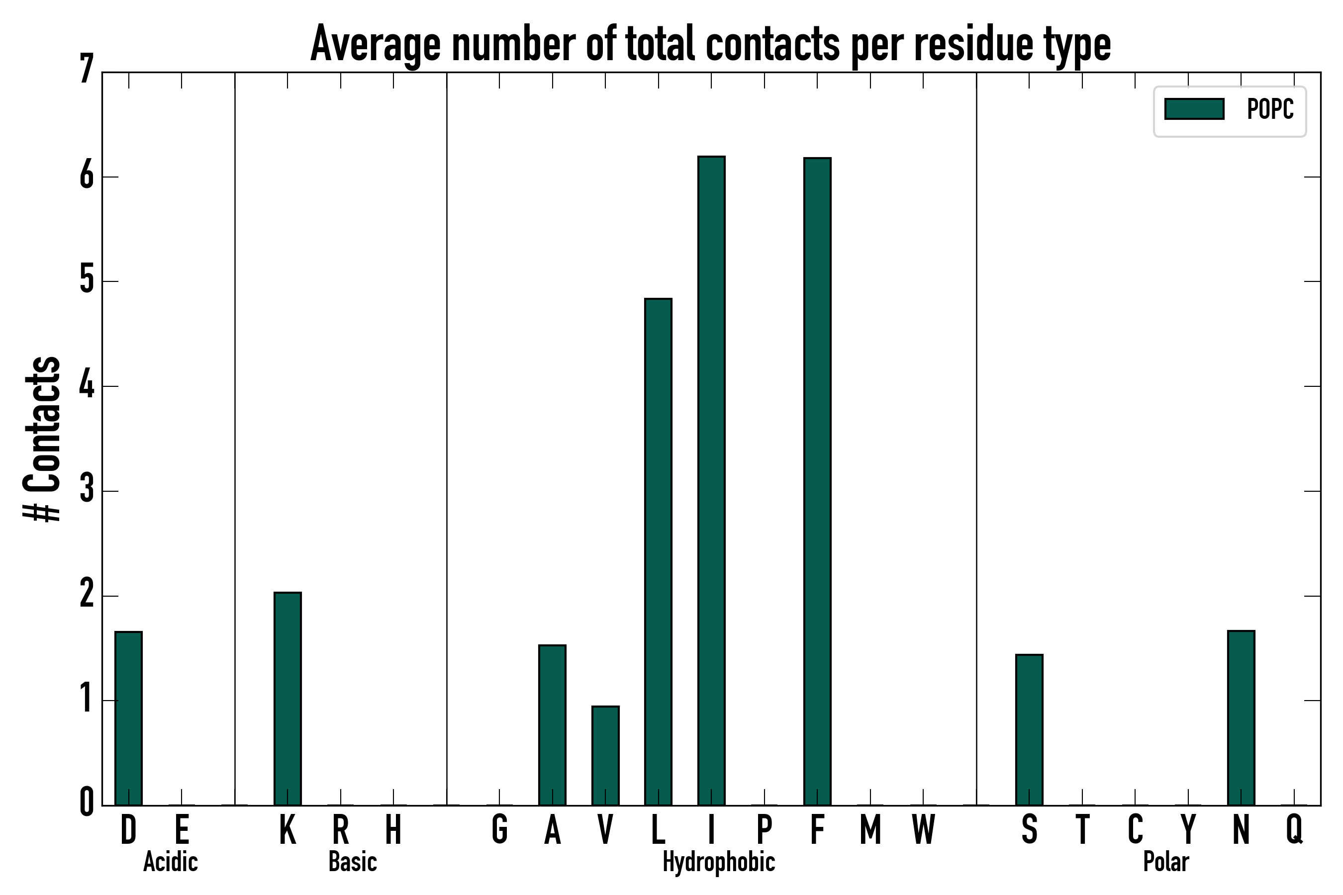 Number of contacts between each residue of the peptide backbone and the different lipid types, averaged over the last microsecond and using a cut-off of 0.6 nm.