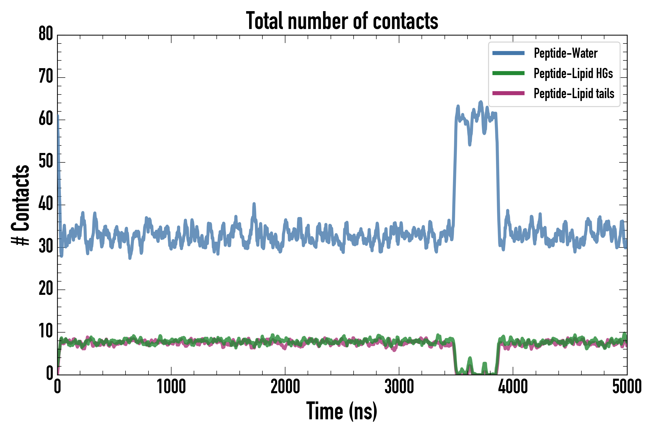 Number of contacts between each residue of the peptide backbone and the different lipid types, averaged over the last microsecond and using a cut-off of 0.6 nm.