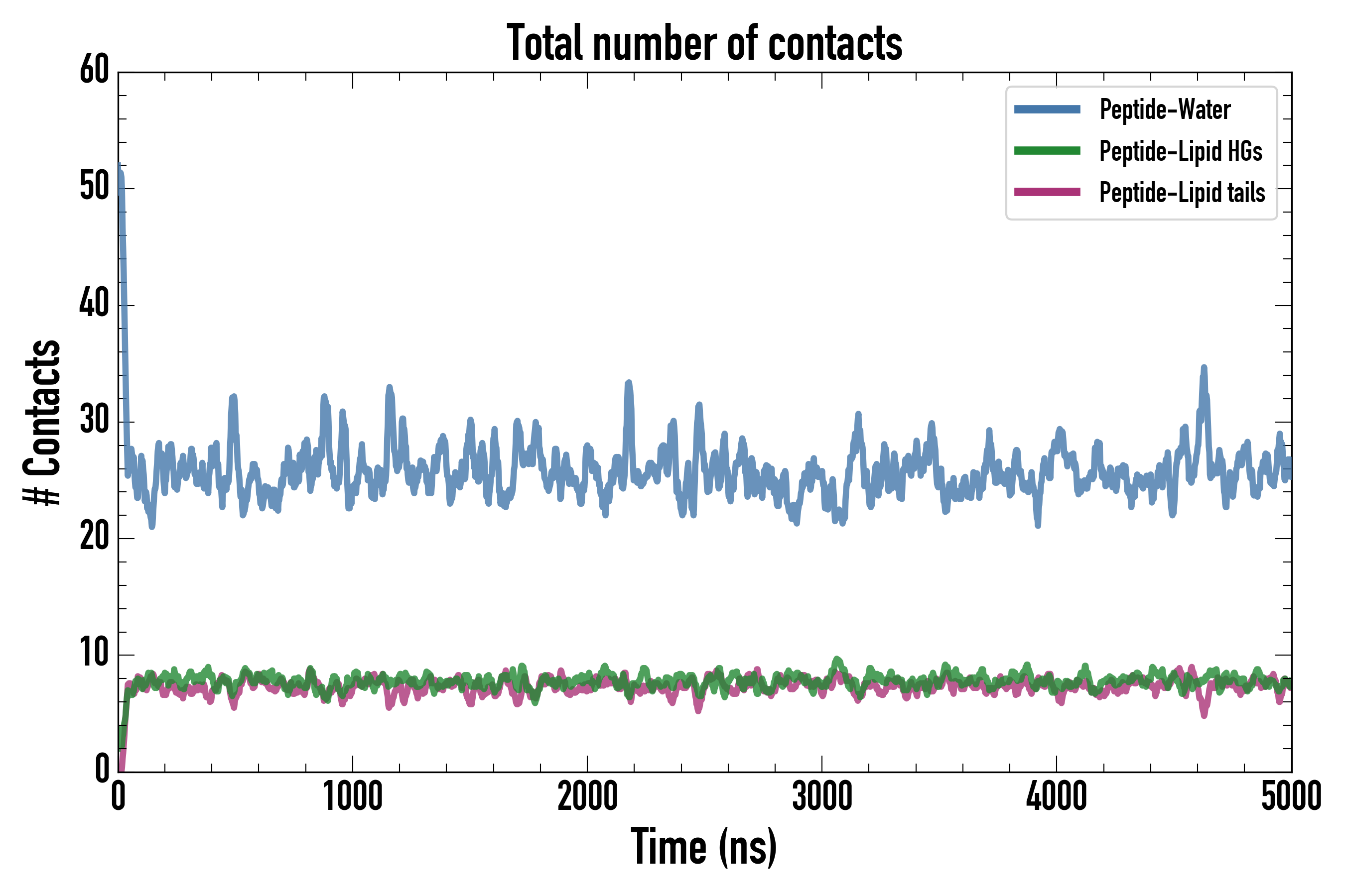 Number of contacts between each residue of the peptide backbone and the different lipid types, averaged over the last microsecond and using a cut-off of 0.6 nm.