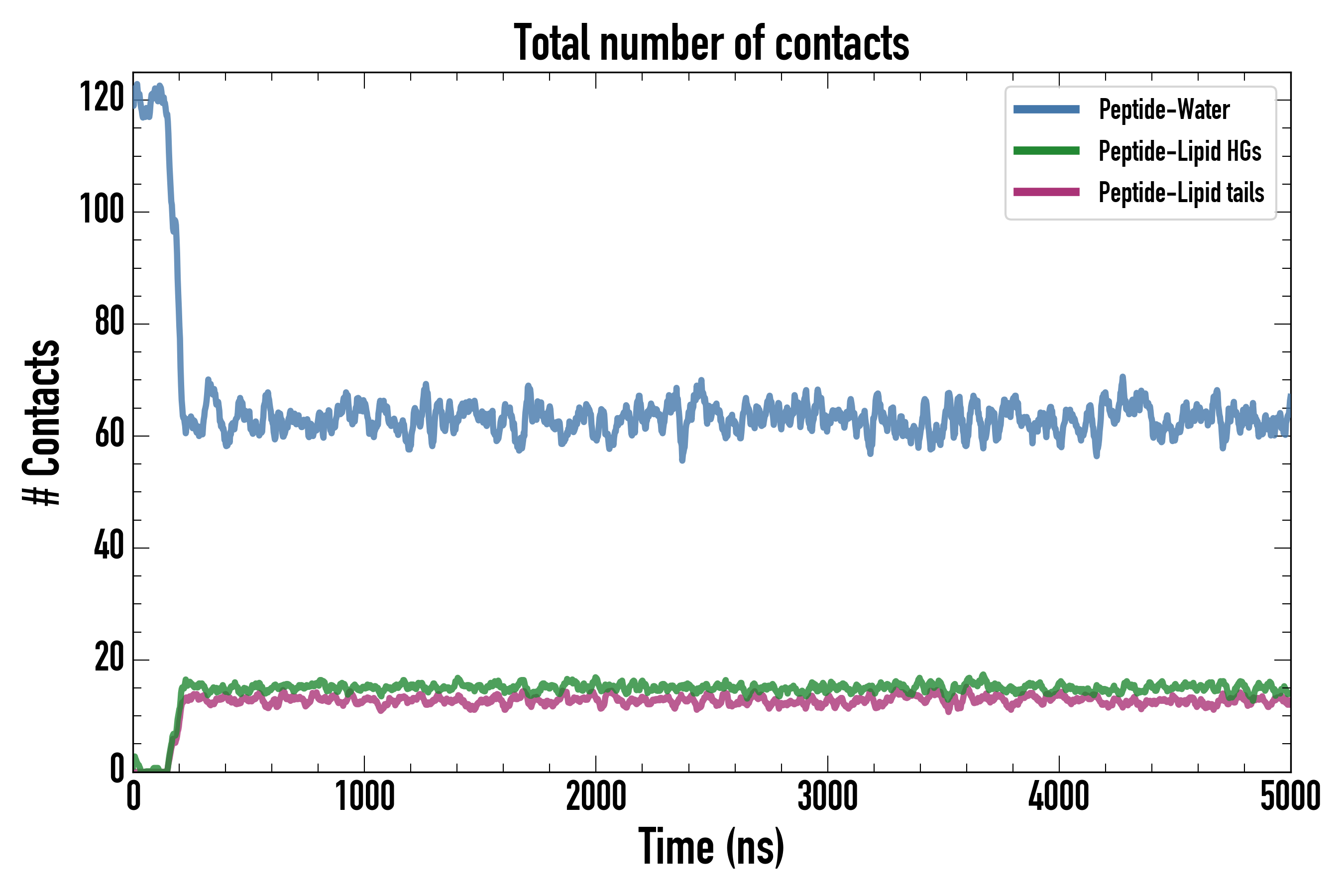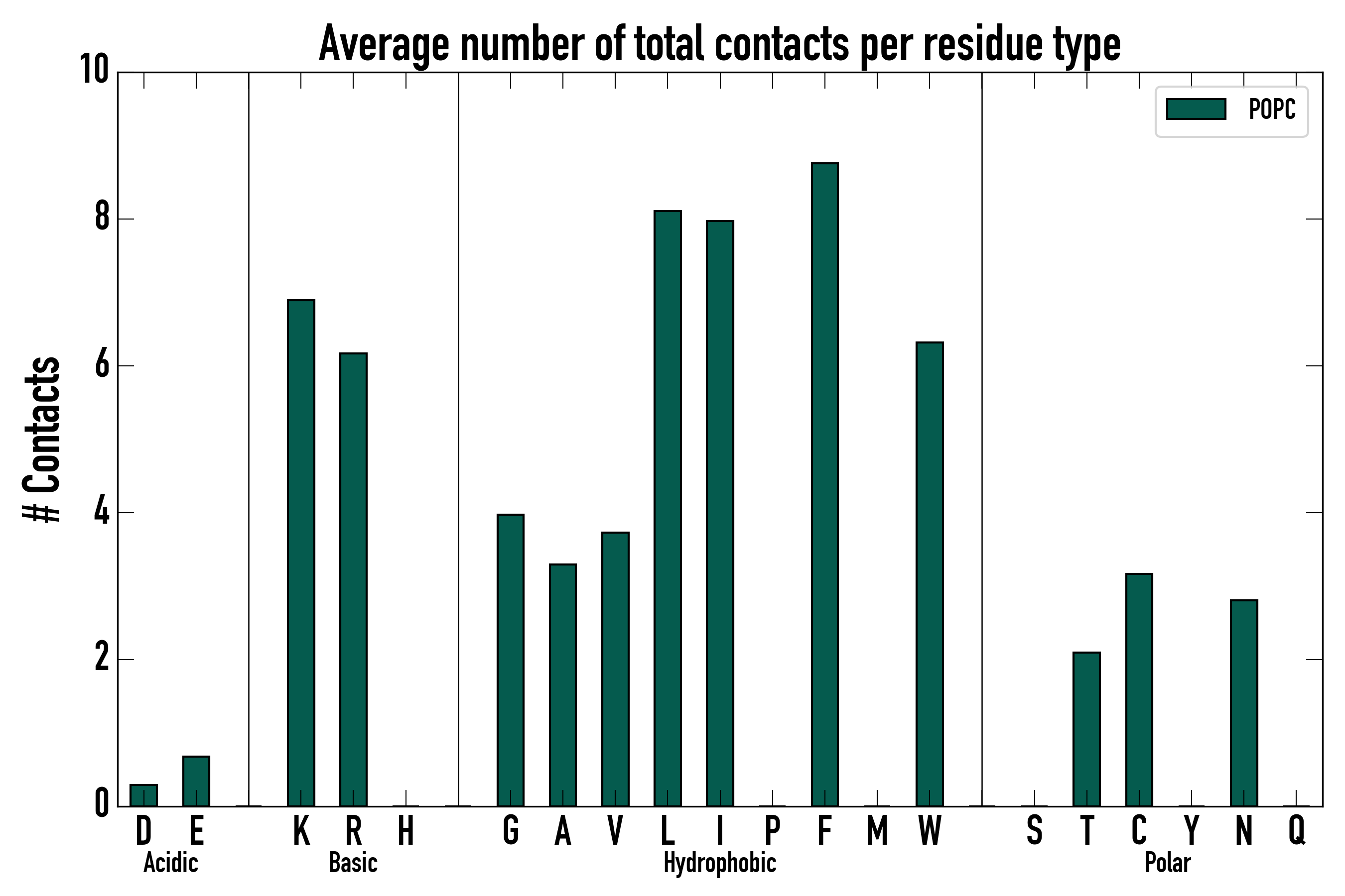 Number of contacts between each residue of the peptide backbone and the different lipid types, averaged over the last microsecond and using a cut-off of 0.6 nm.