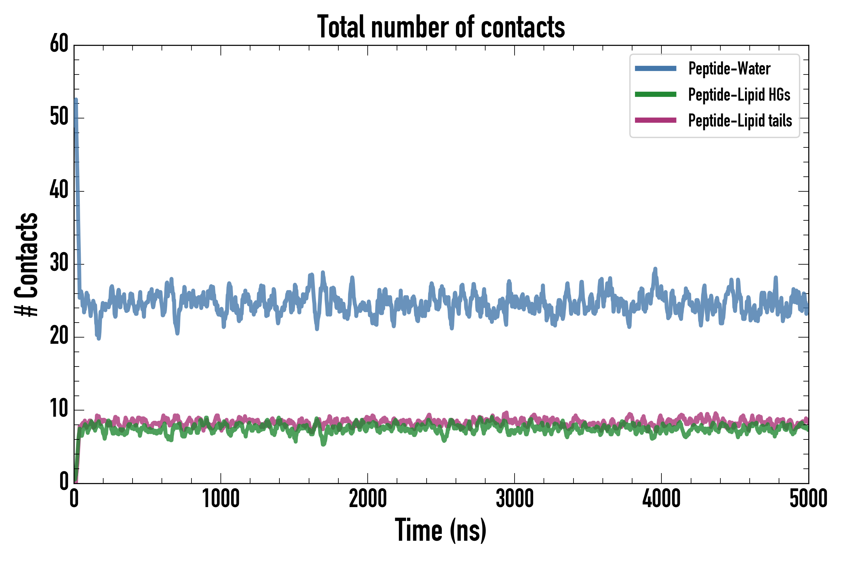 Number of contacts between each residue of the peptide backbone and the different lipid types, averaged over the last microsecond and using a cut-off of 0.6 nm.