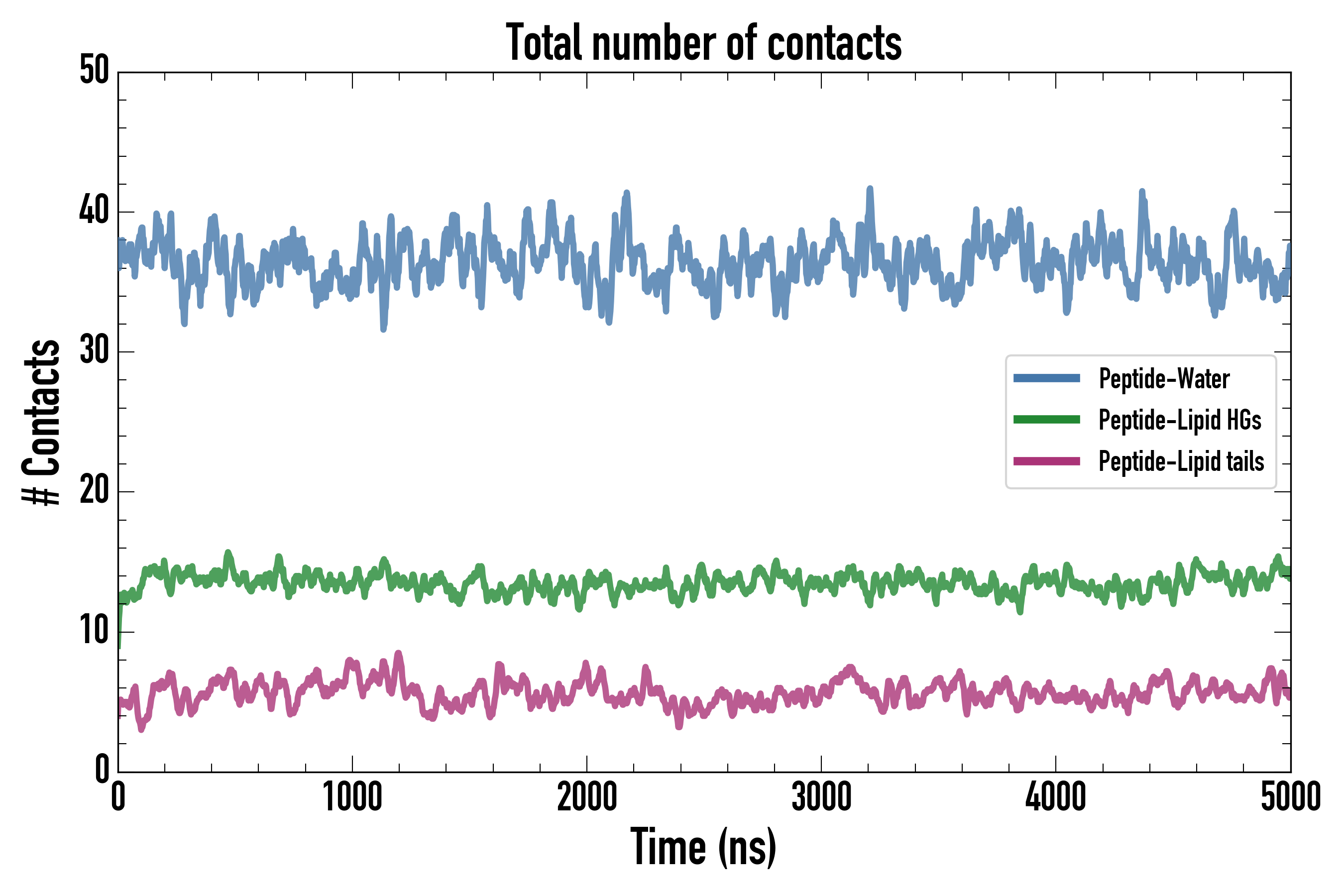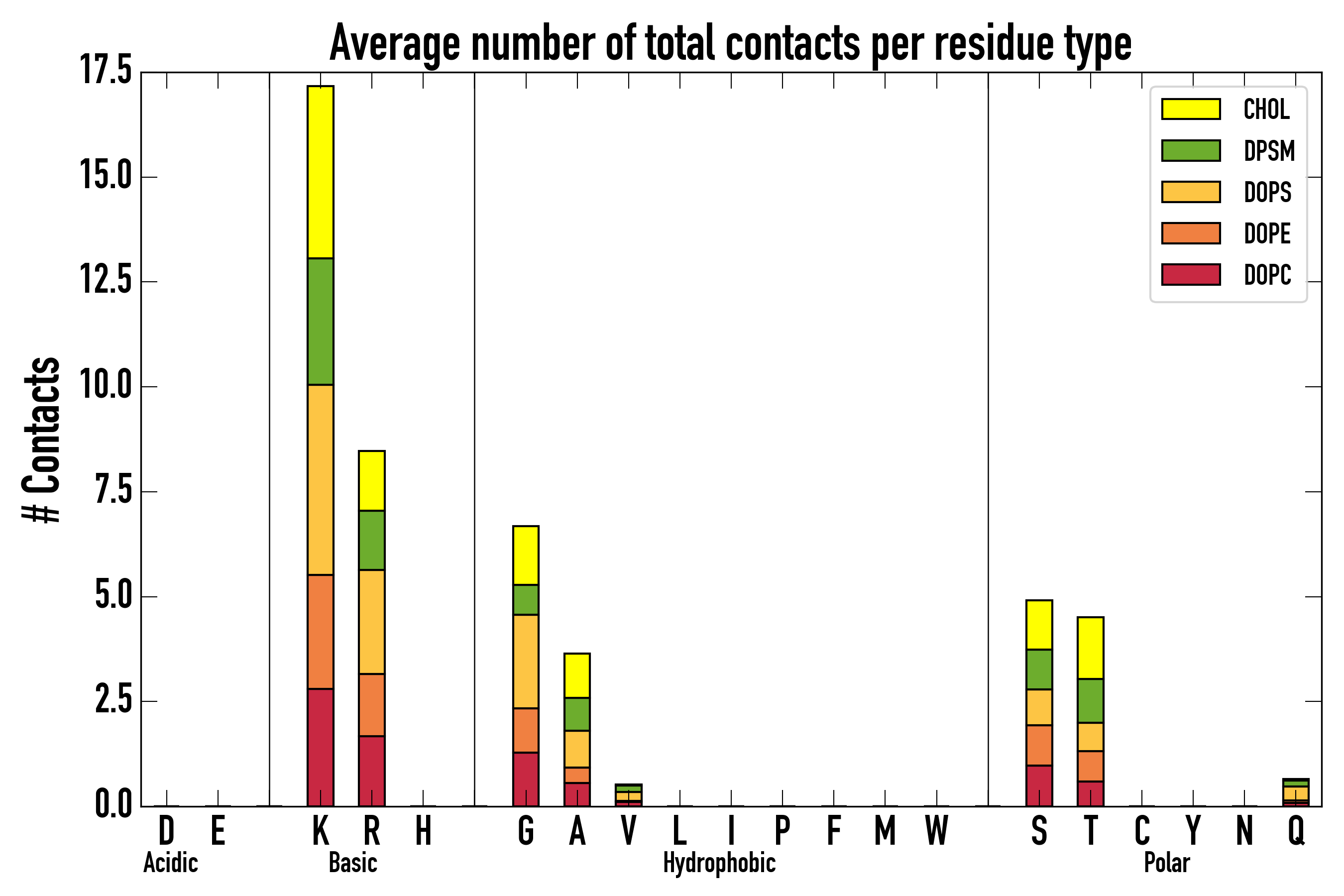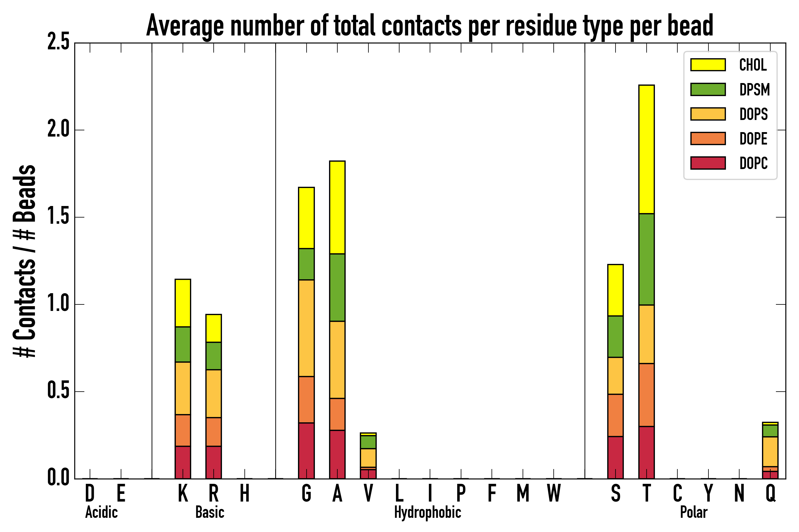 Number of contacts between each residue of the peptide backbone and the different lipid types, averaged over the last microsecond and using a cut-off of 0.6 nm.