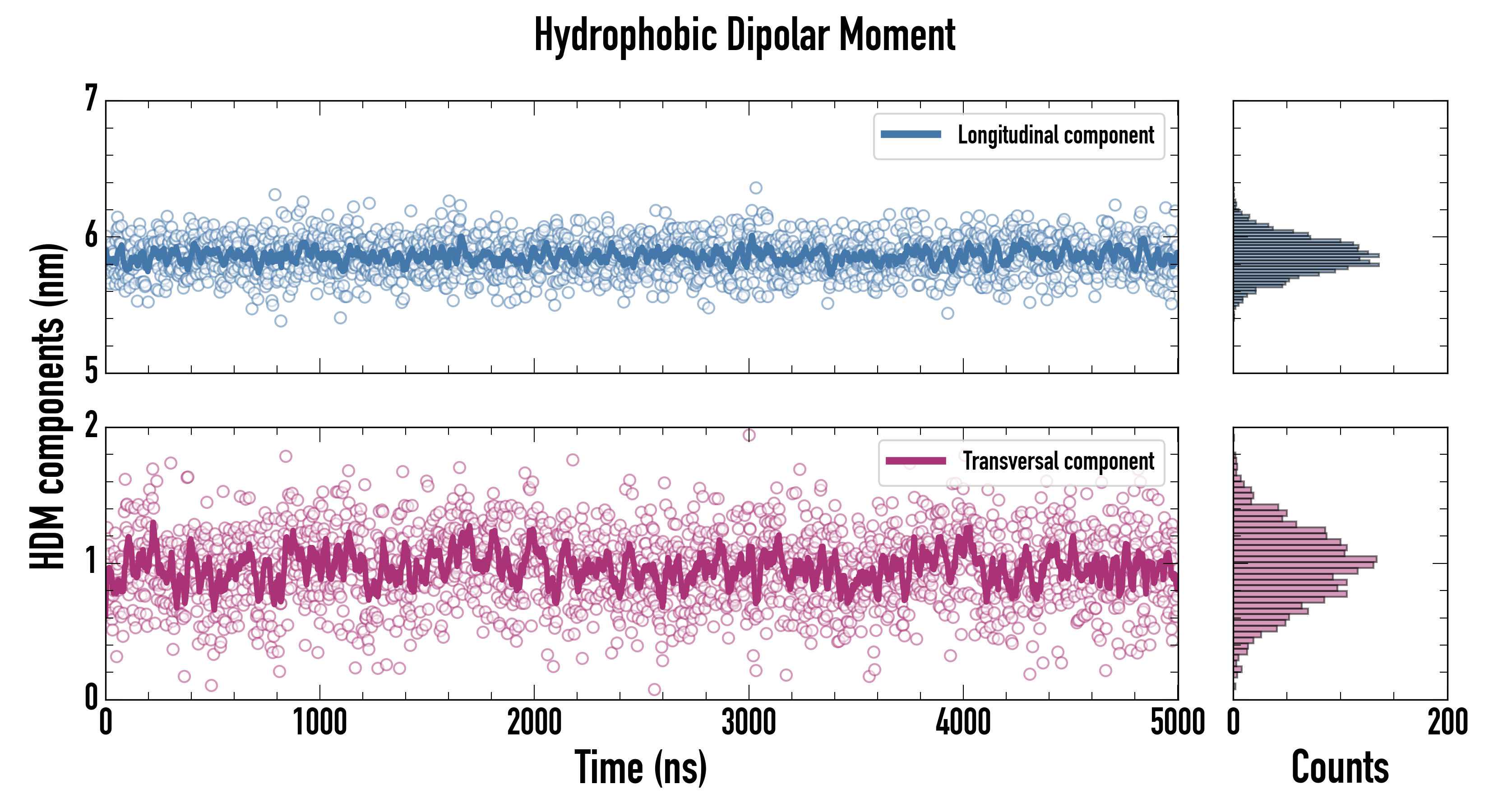 Longitudinal (e nm): 6.43 Transversal (e nm): 0.26 Hydrophobic Dipolar Moment (nm): 5.95