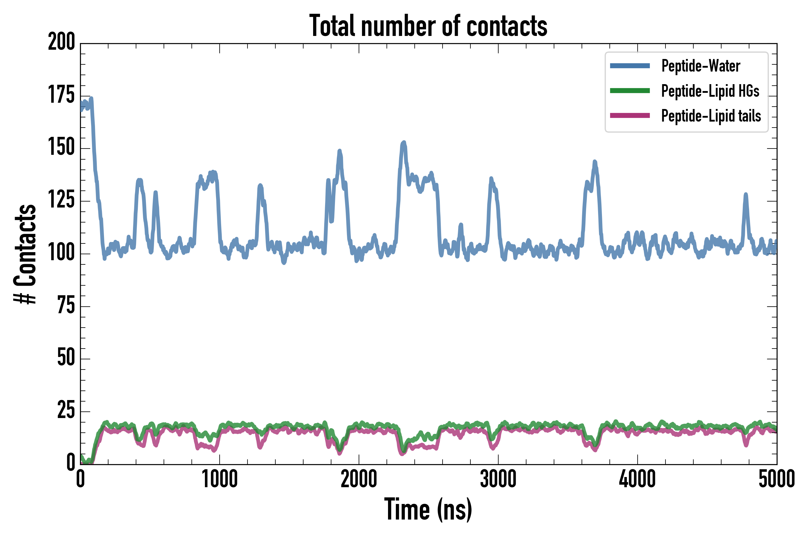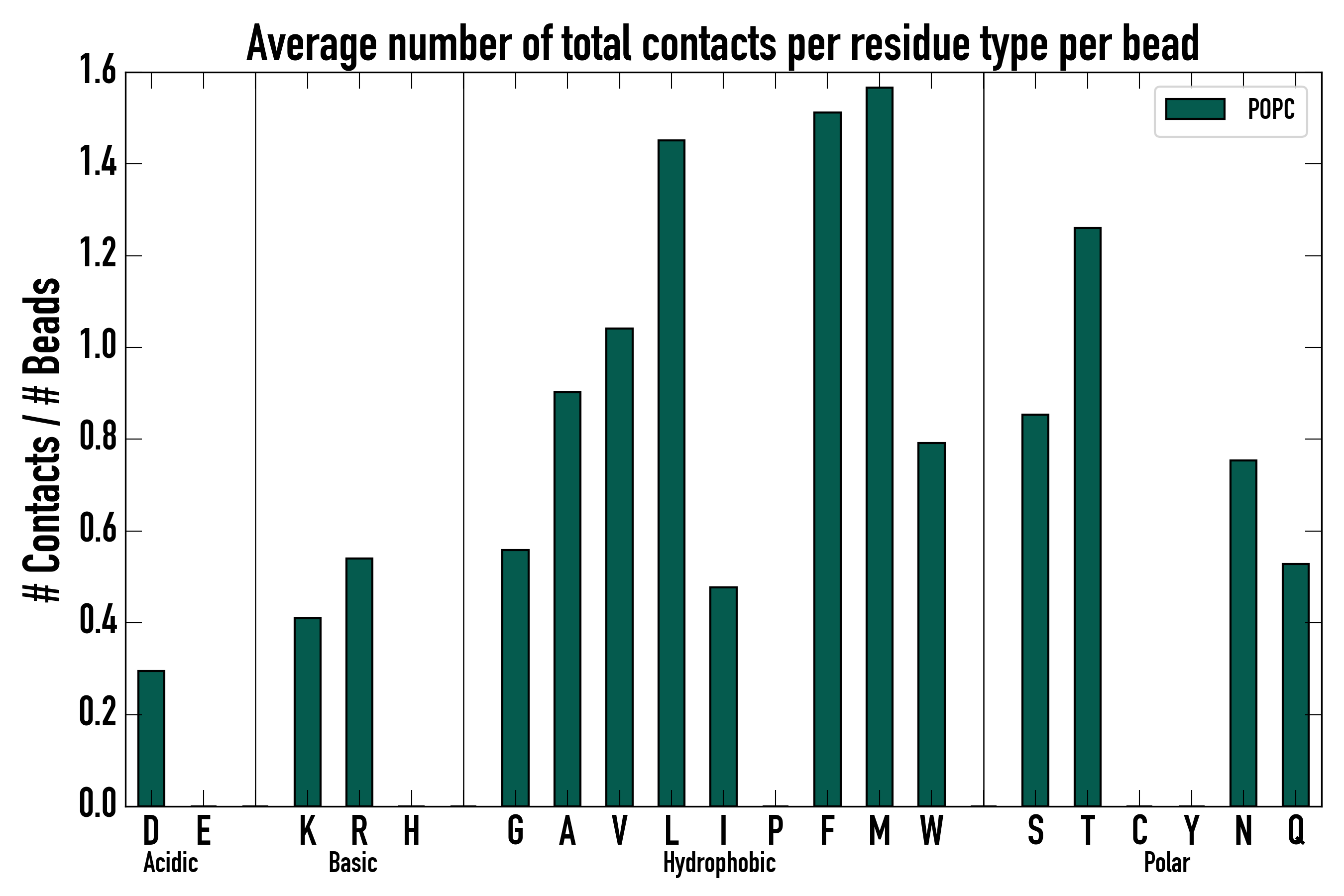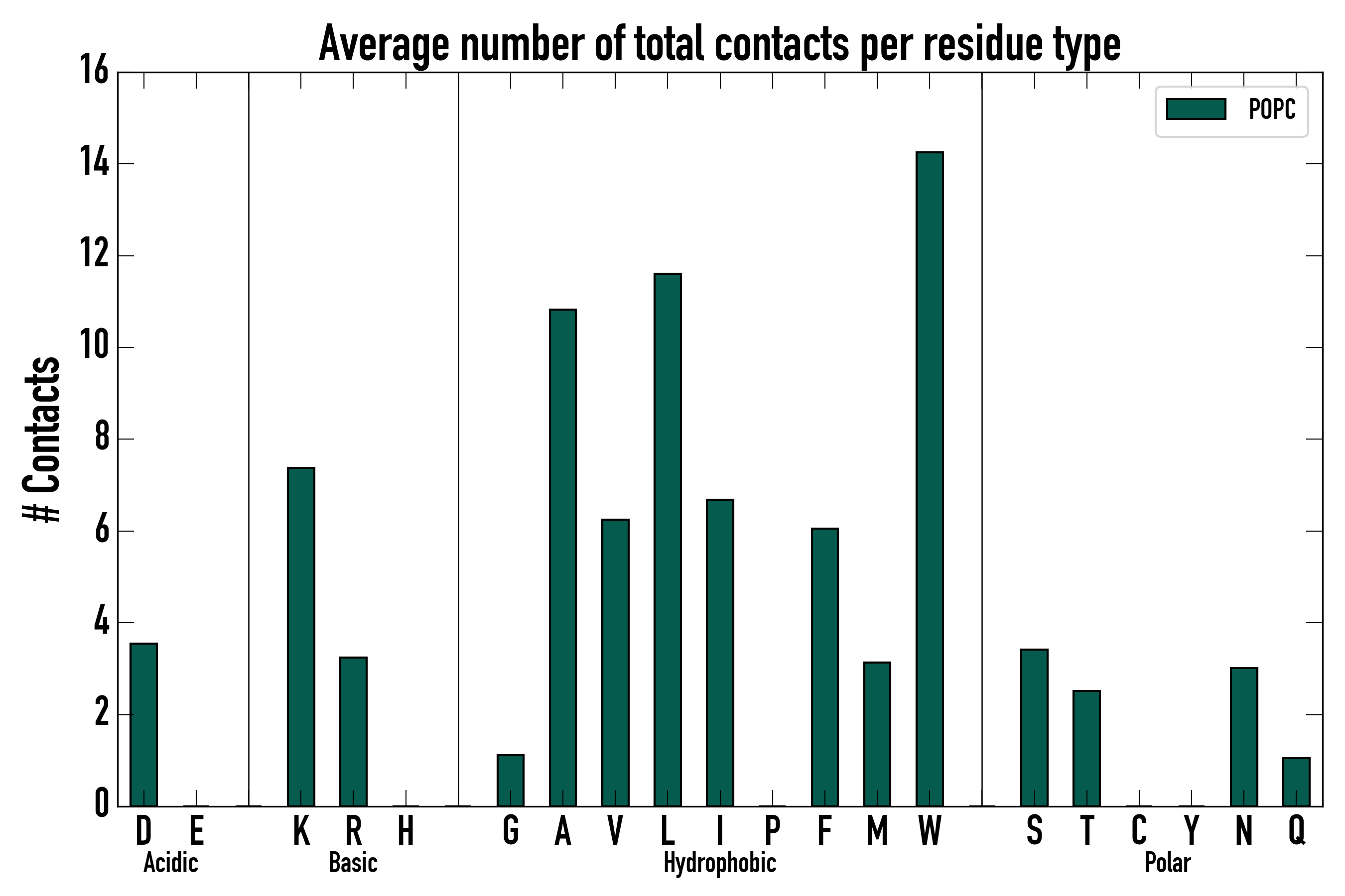 Number of contacts between each residue of the peptide backbone and the different lipid types, averaged over the last microsecond and using a cut-off of 0.6 nm.
