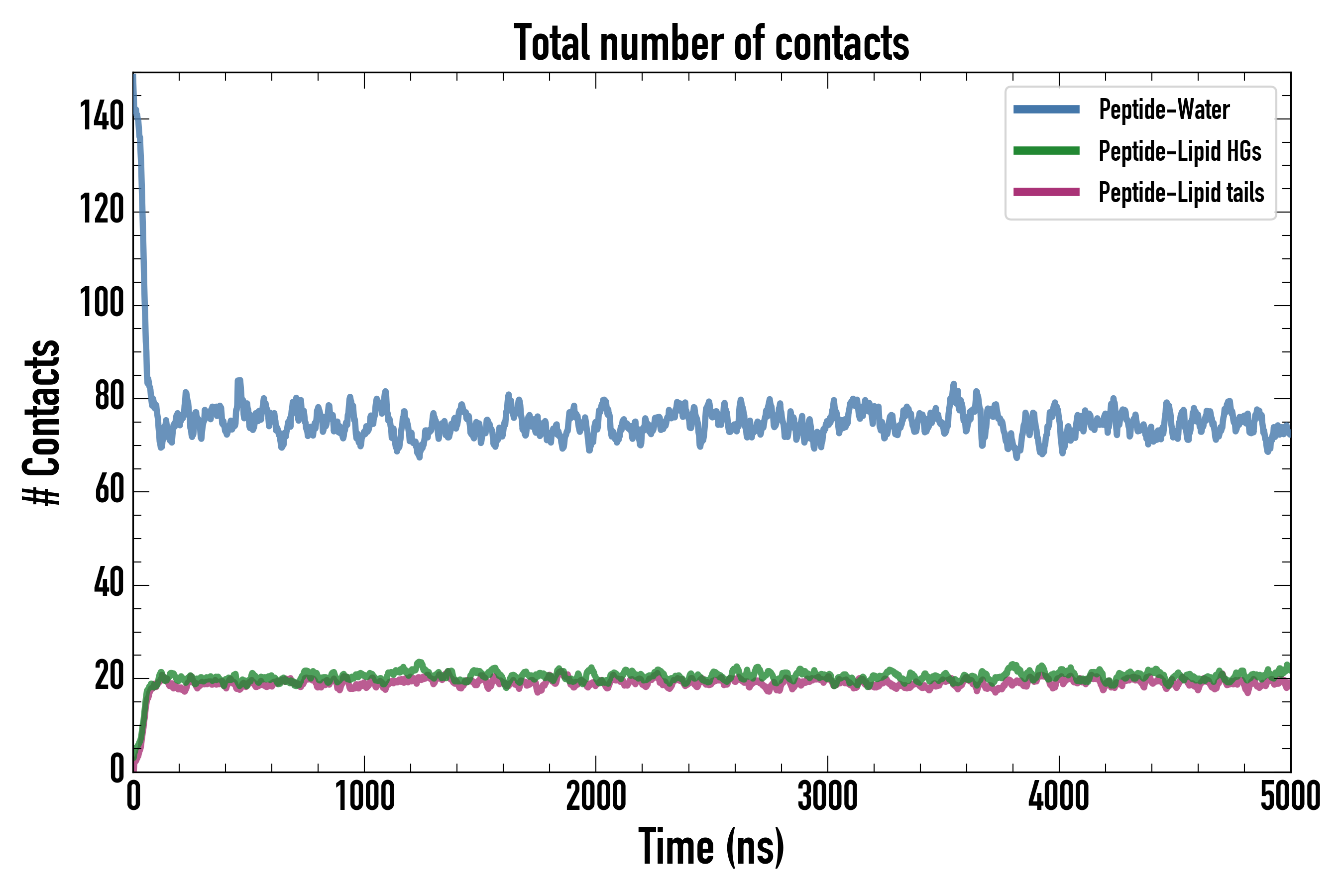 Number of contacts between each residue of the peptide backbone and the different lipid types, averaged over the last microsecond and using a cut-off of 0.6 nm.