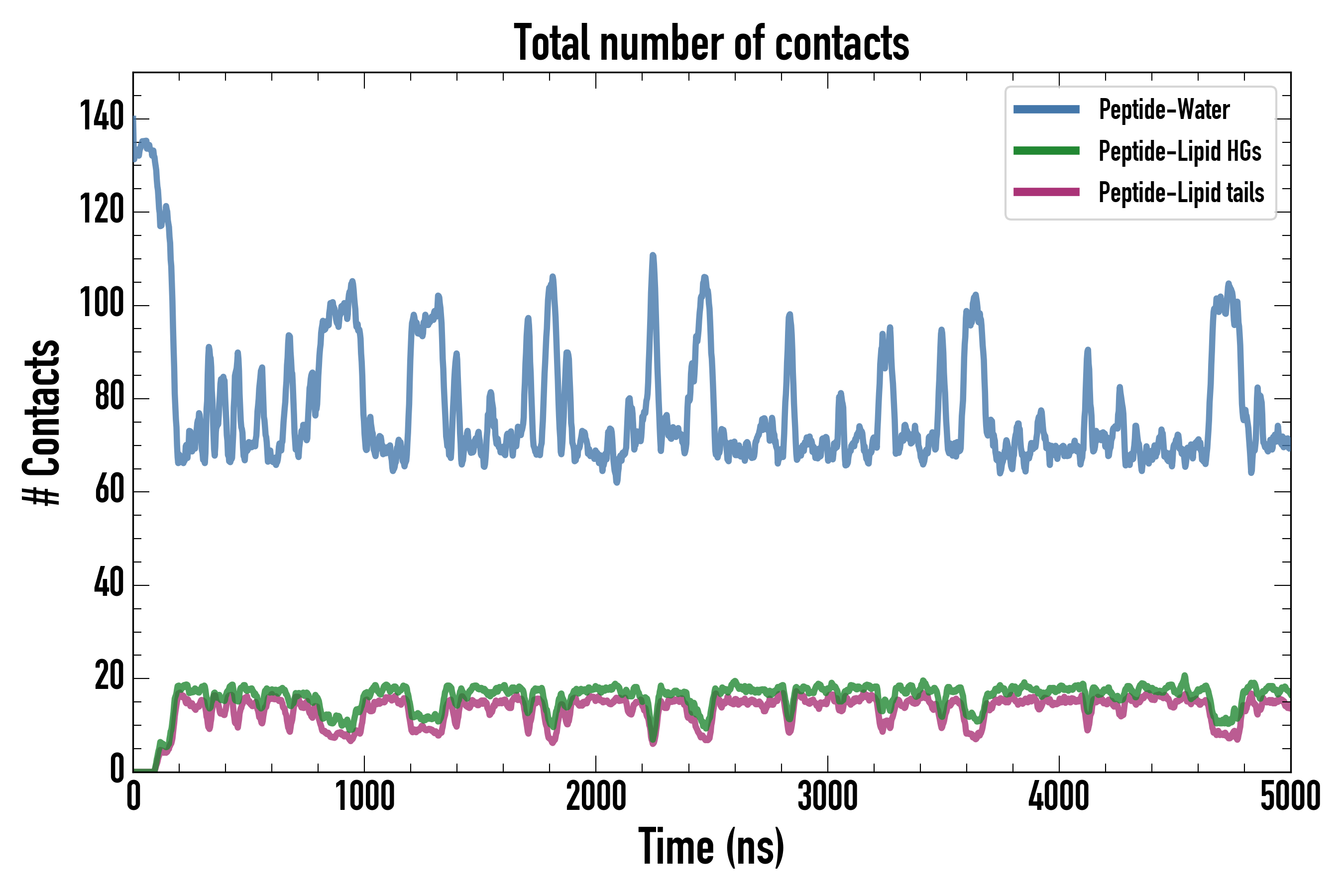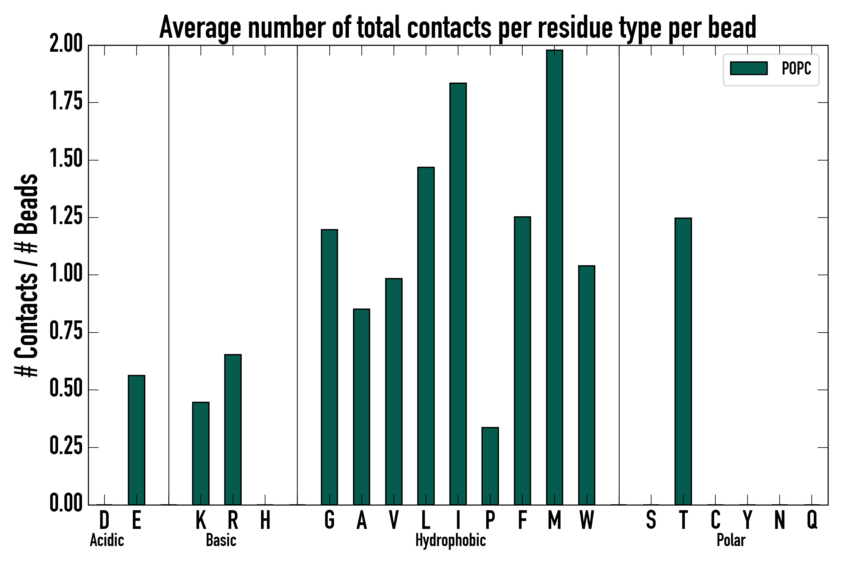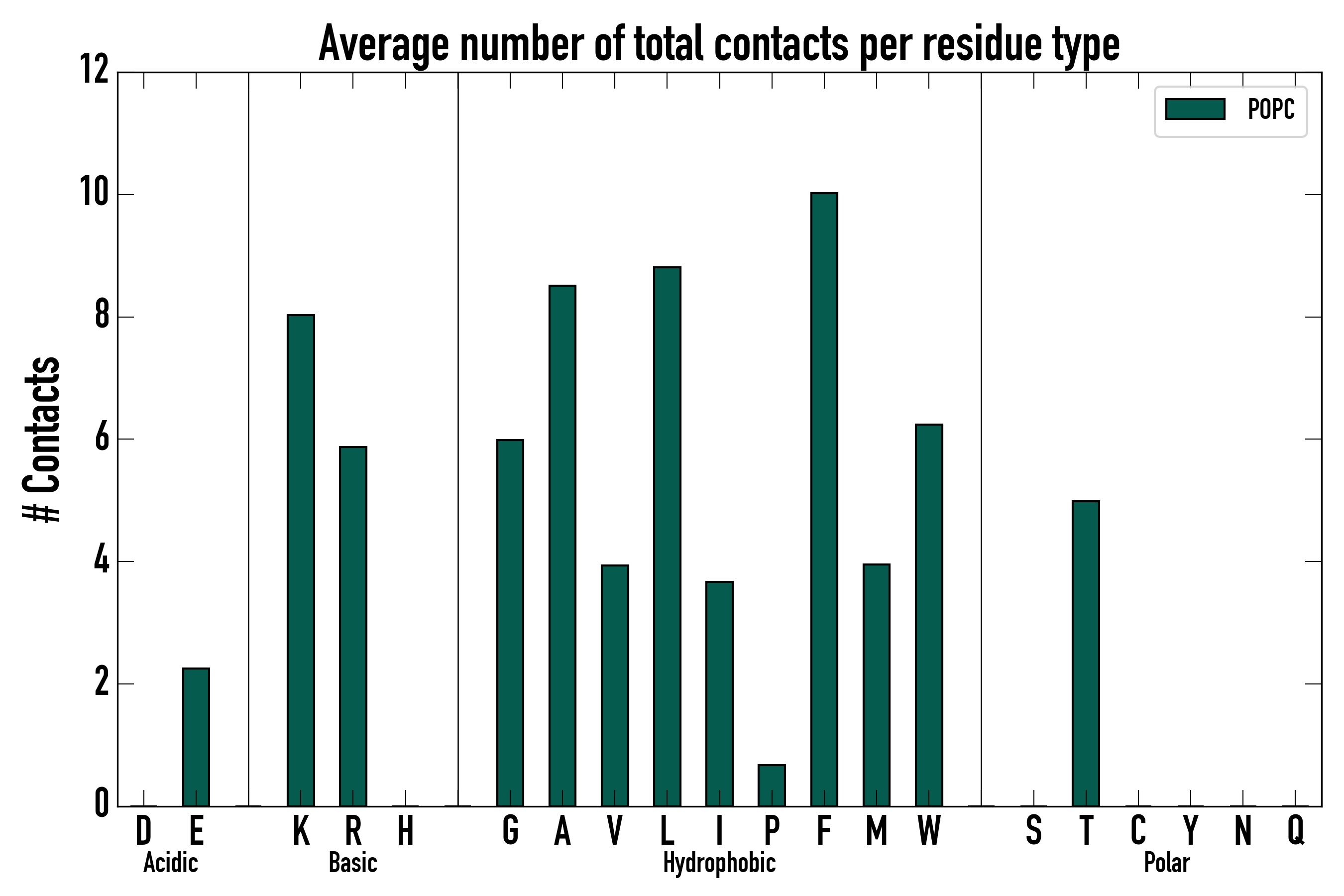 Number of contacts between each residue of the peptide backbone and the different lipid types, averaged over the last microsecond and using a cut-off of 0.6 nm.