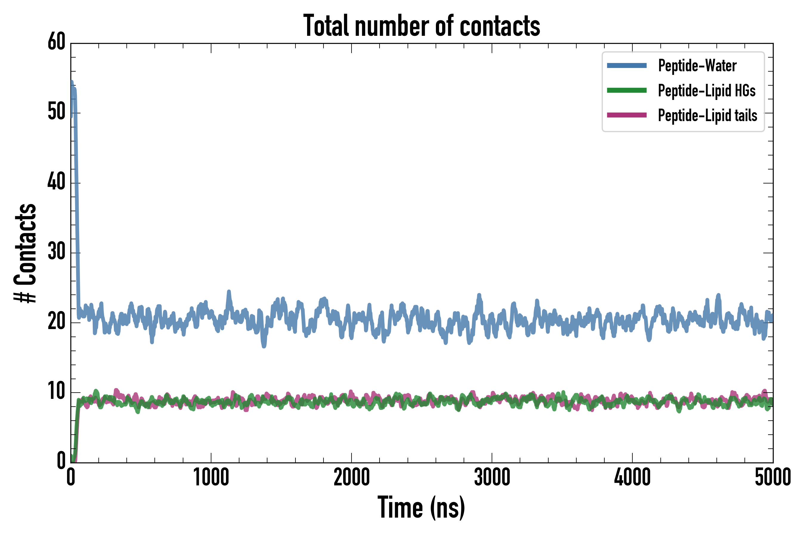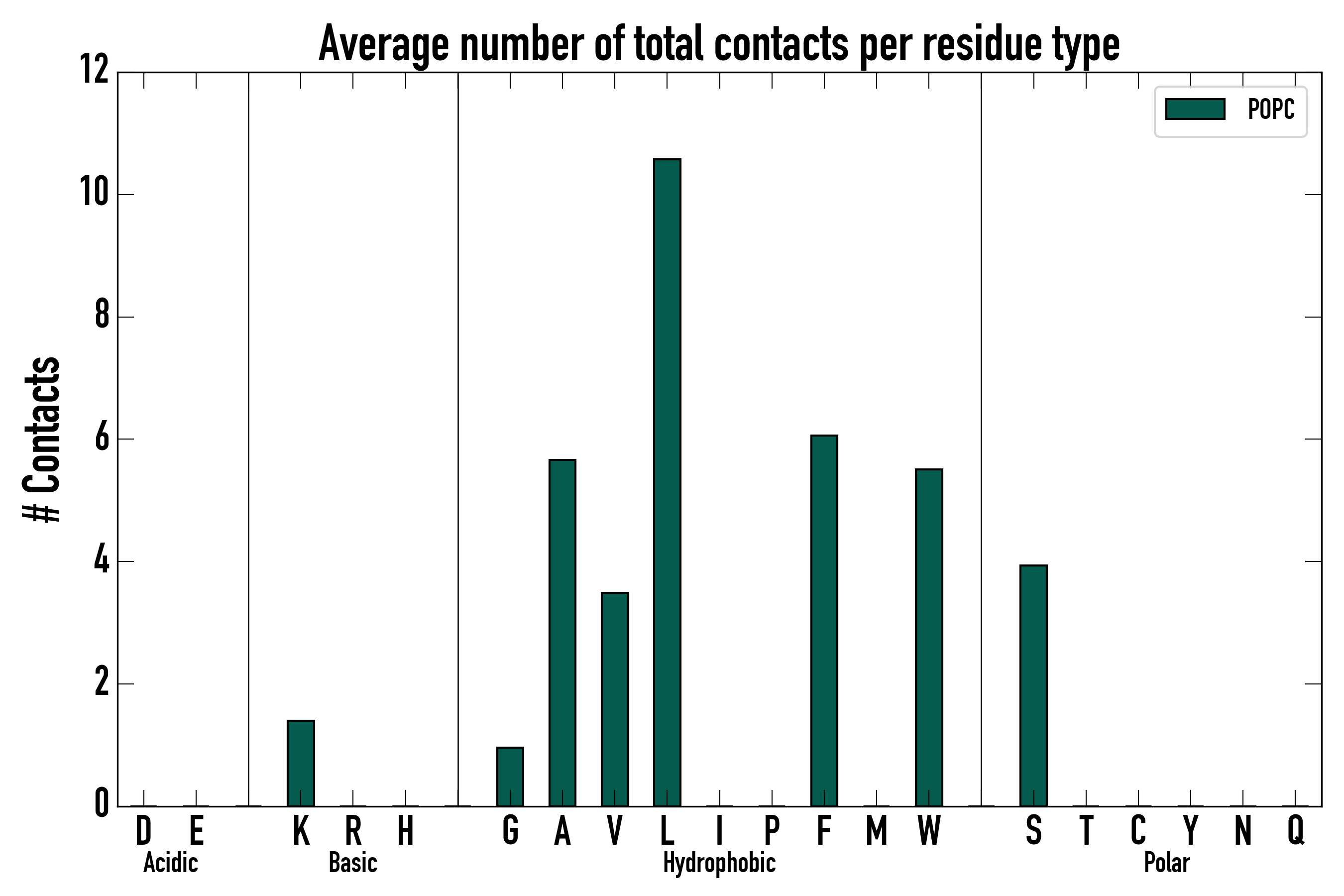 Number of contacts between each residue of the peptide backbone and the different lipid types, averaged over the last microsecond and using a cut-off of 0.6 nm.
