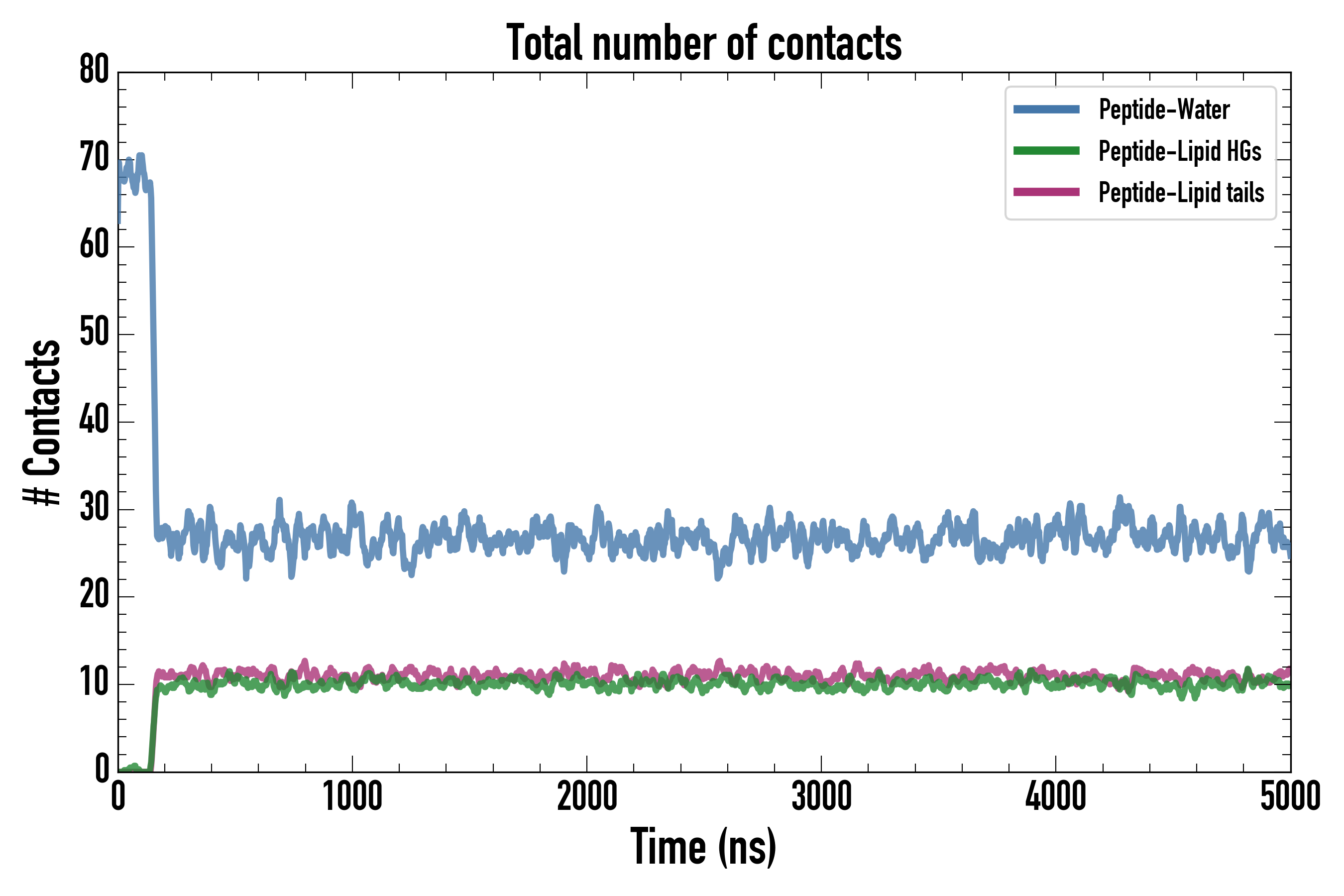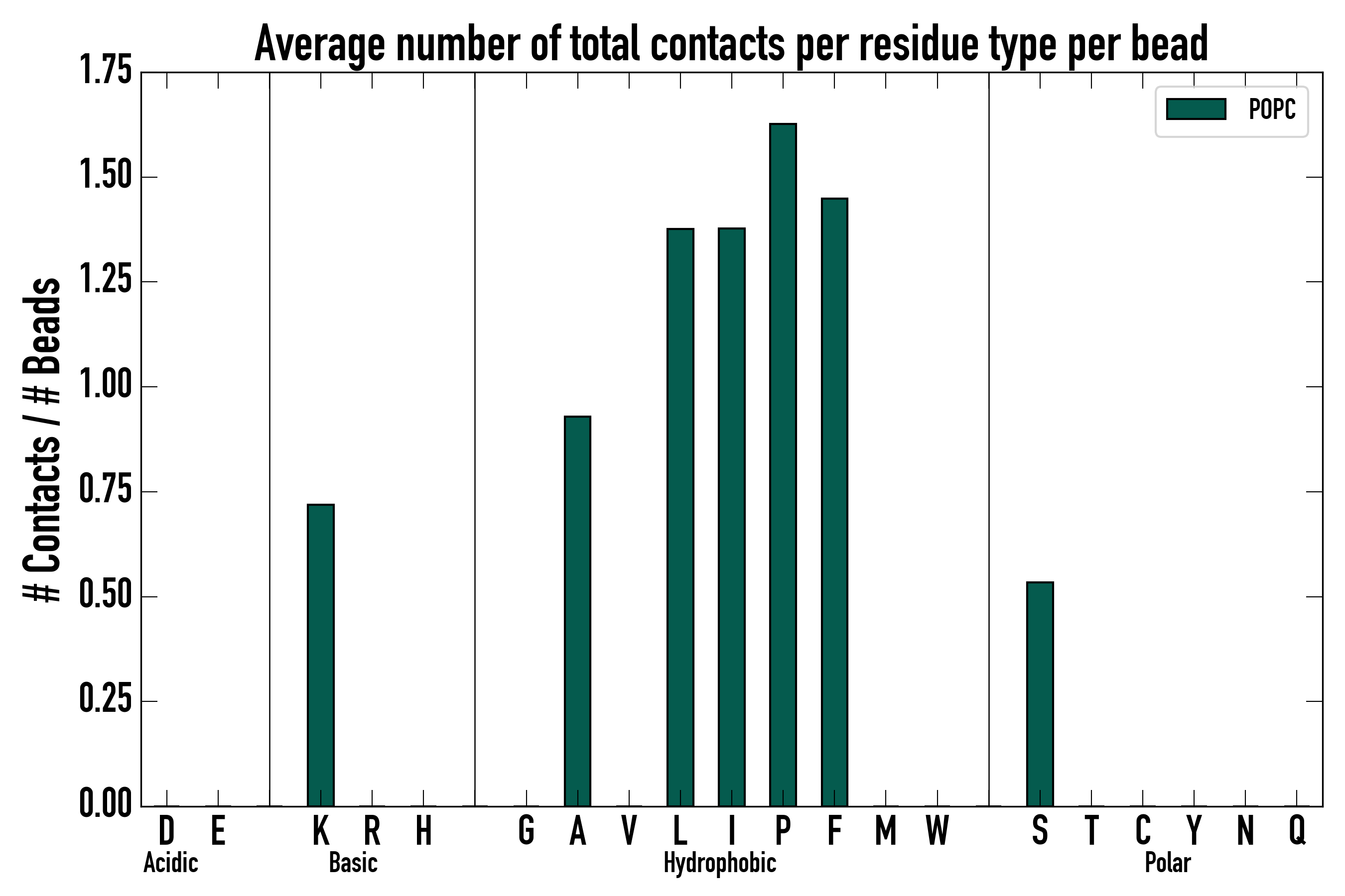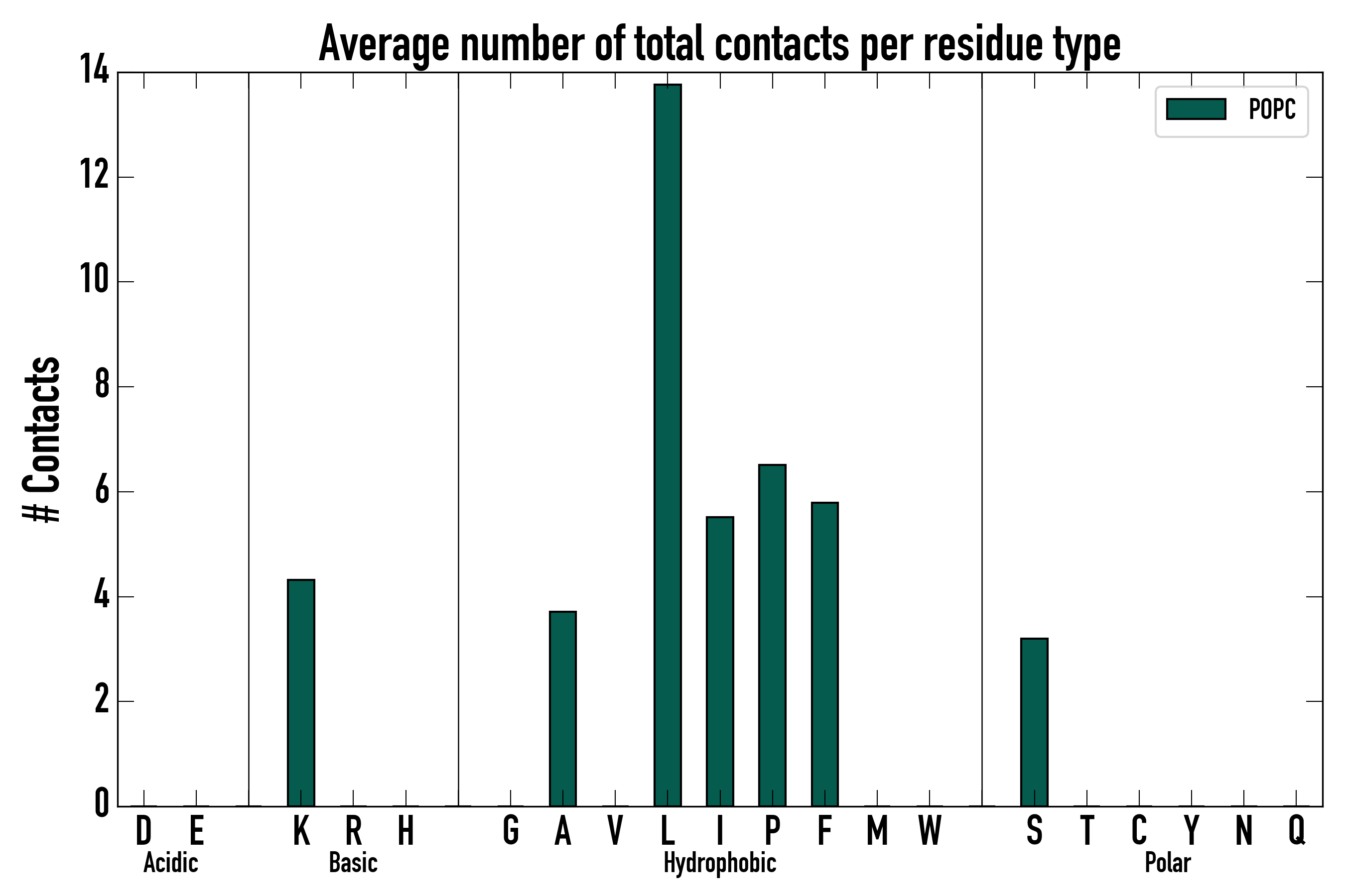 Number of contacts between each residue of the peptide backbone and the different lipid types, averaged over the last microsecond and using a cut-off of 0.6 nm.