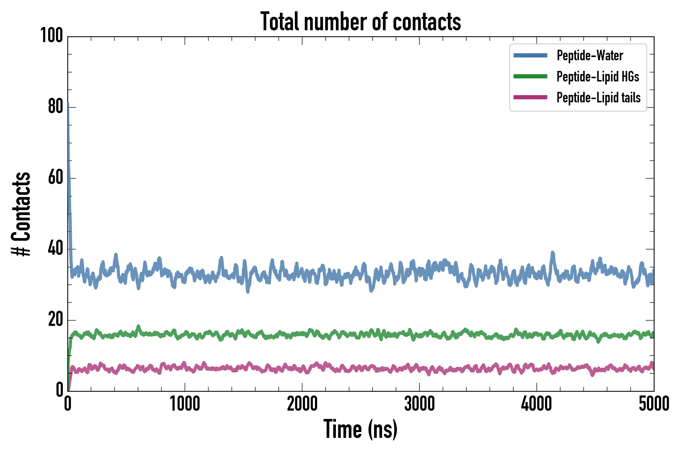 Number of contacts between each residue of the peptide backbone and the different lipid types, averaged over the last microsecond and using a cut-off of 0.6 nm.