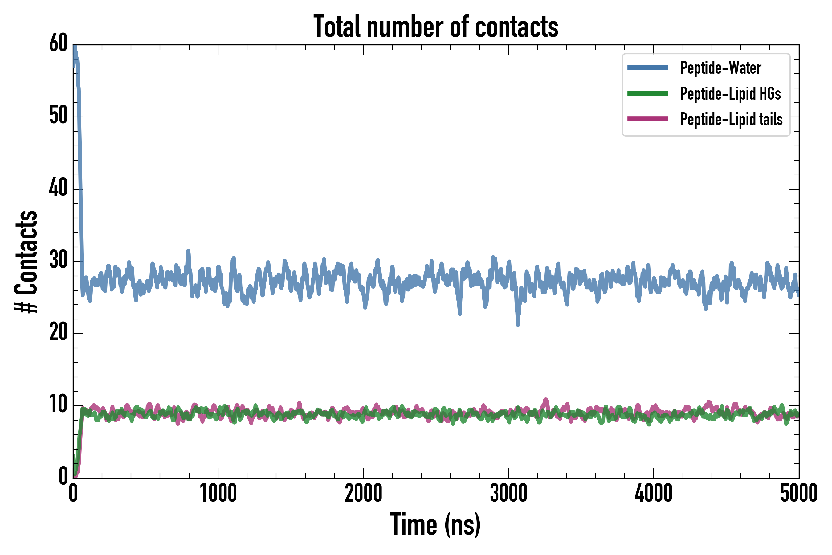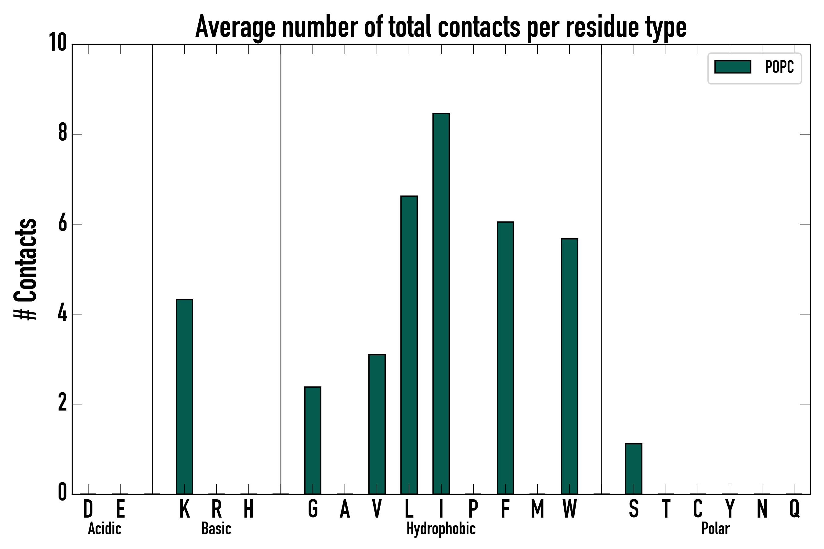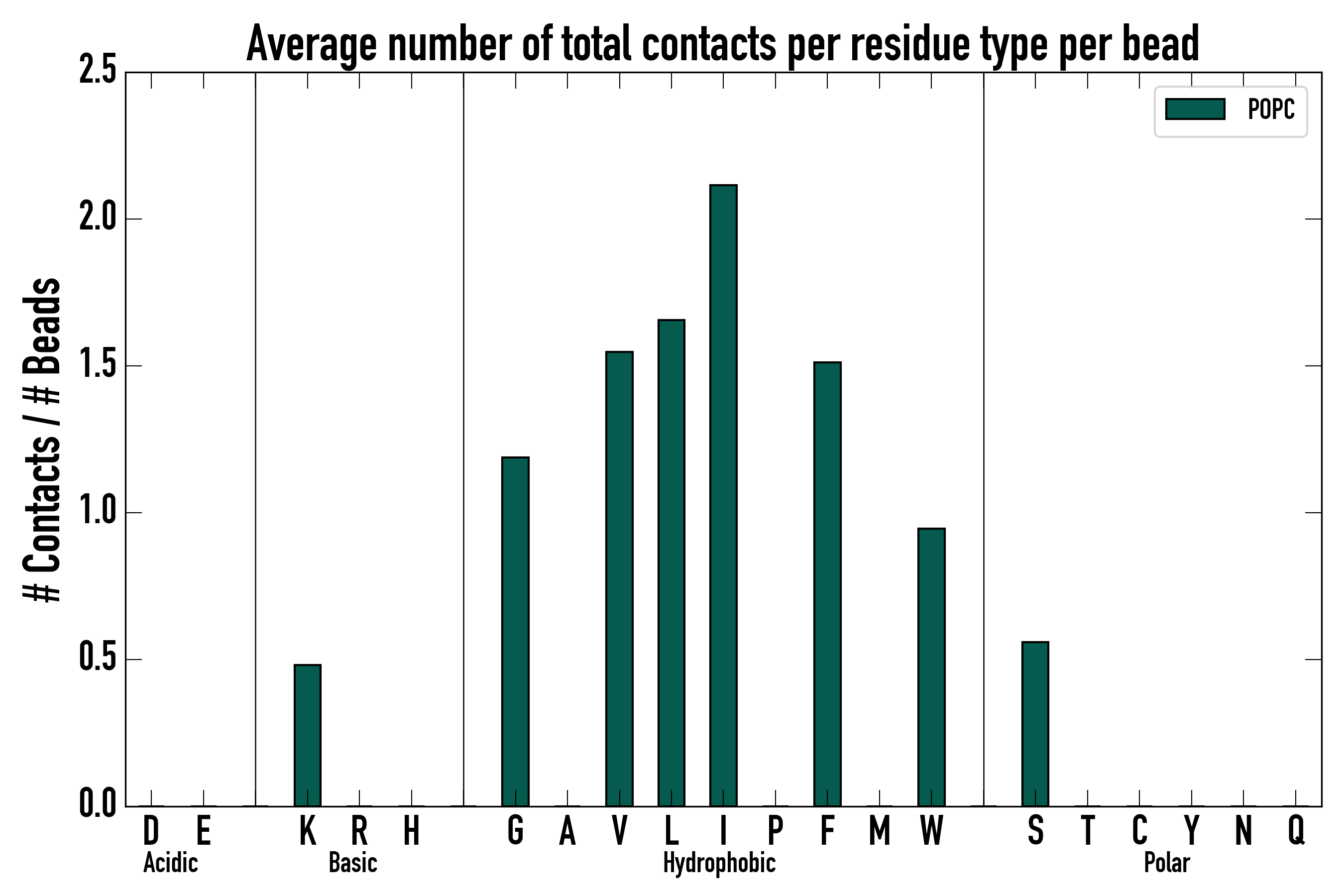 Number of contacts between each residue of the peptide backbone and the different lipid types, averaged over the last microsecond and using a cut-off of 0.6 nm.