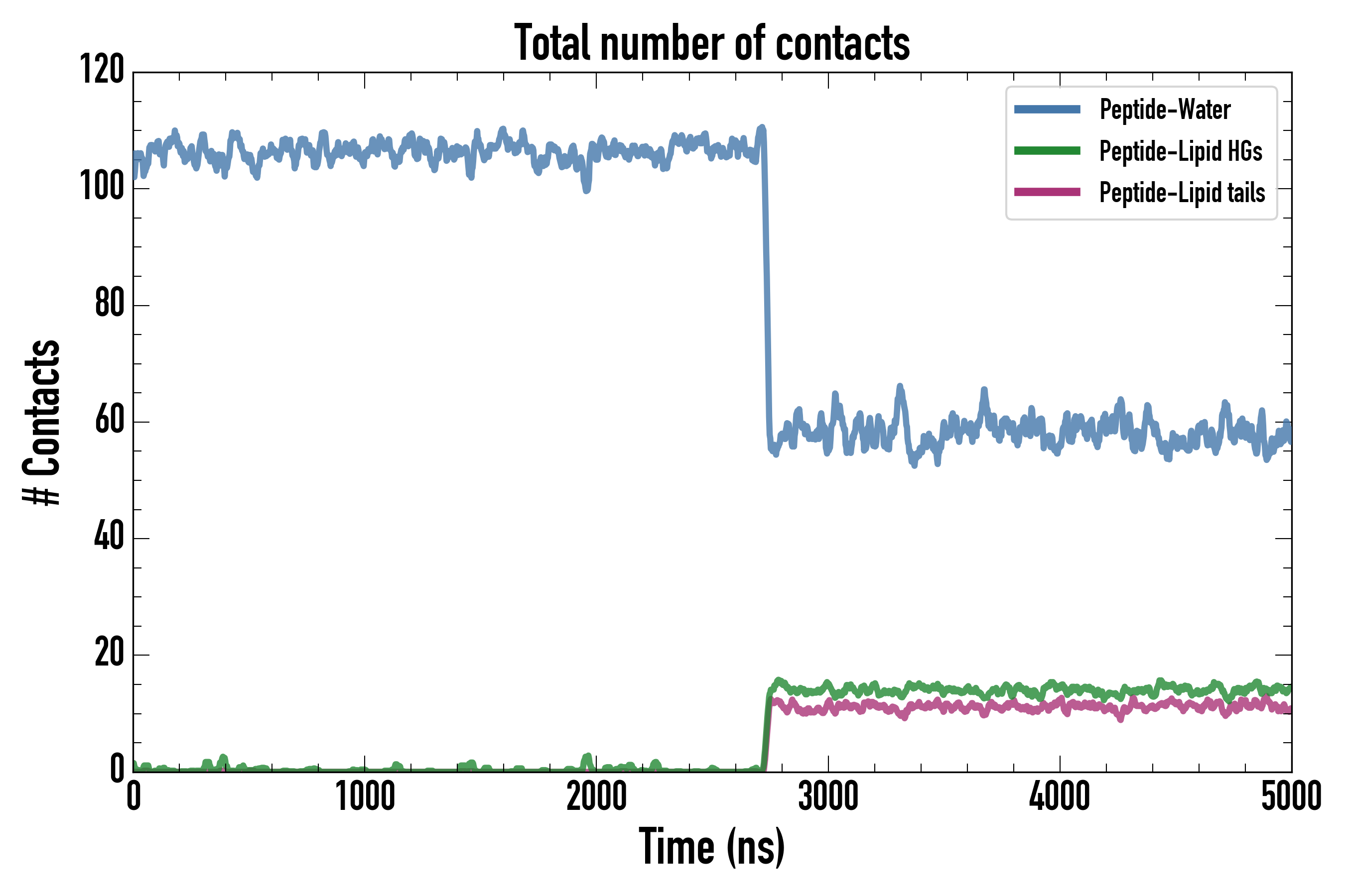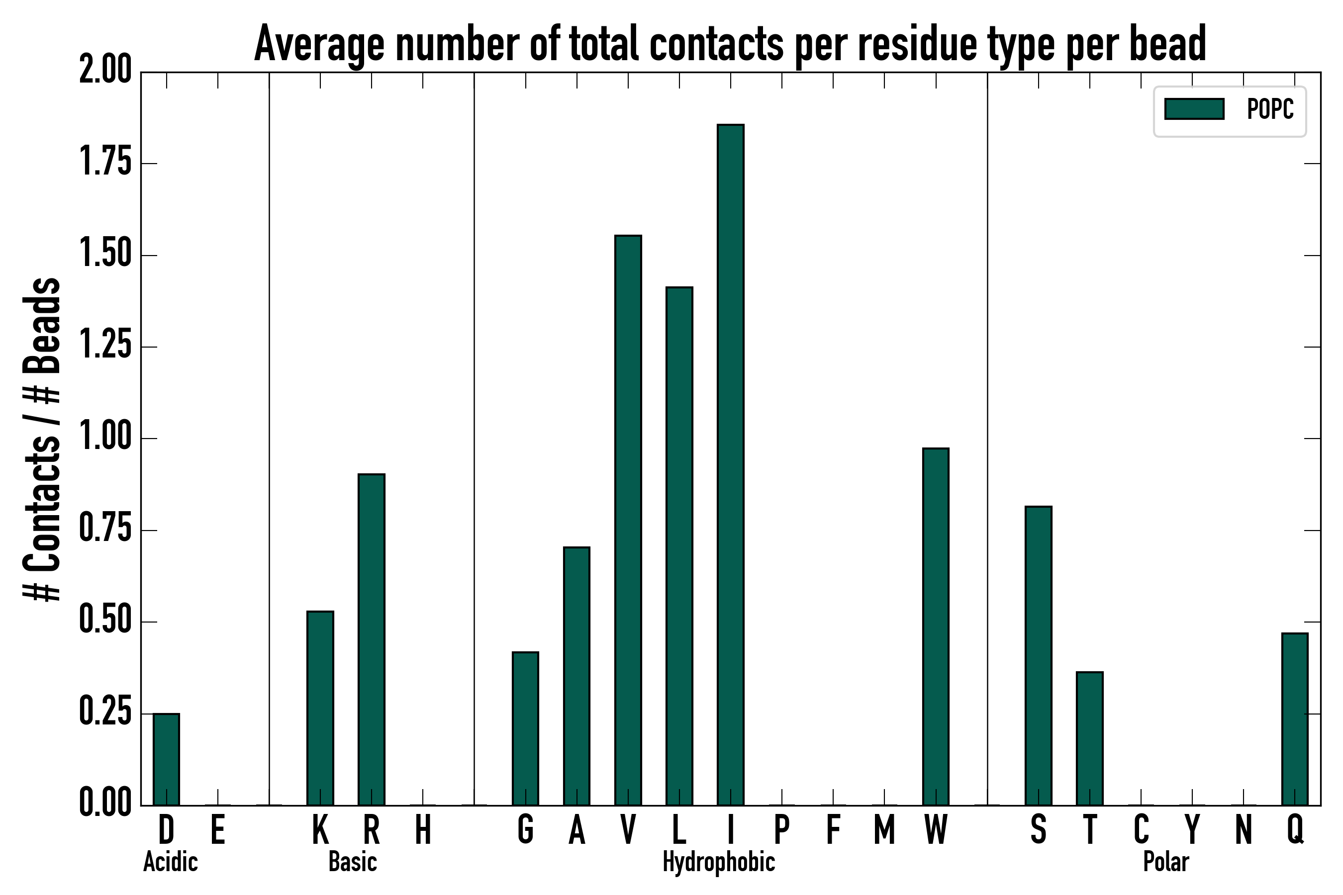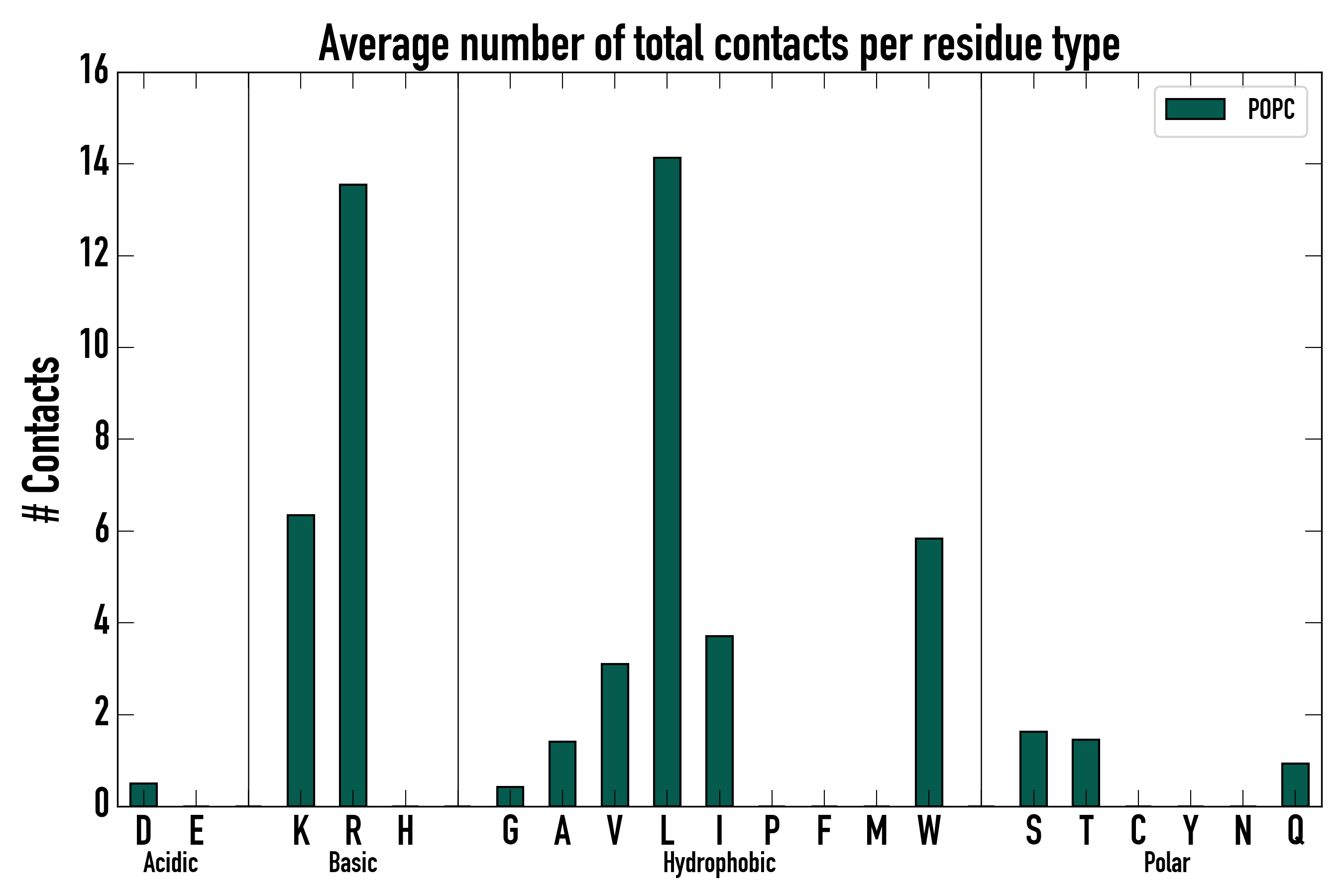 Number of contacts between each residue of the peptide backbone and the different lipid types, averaged over the last microsecond and using a cut-off of 0.6 nm.